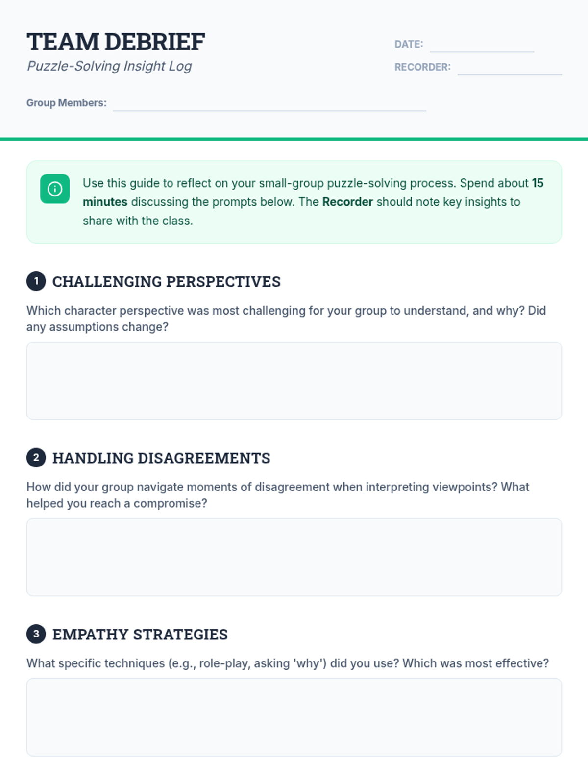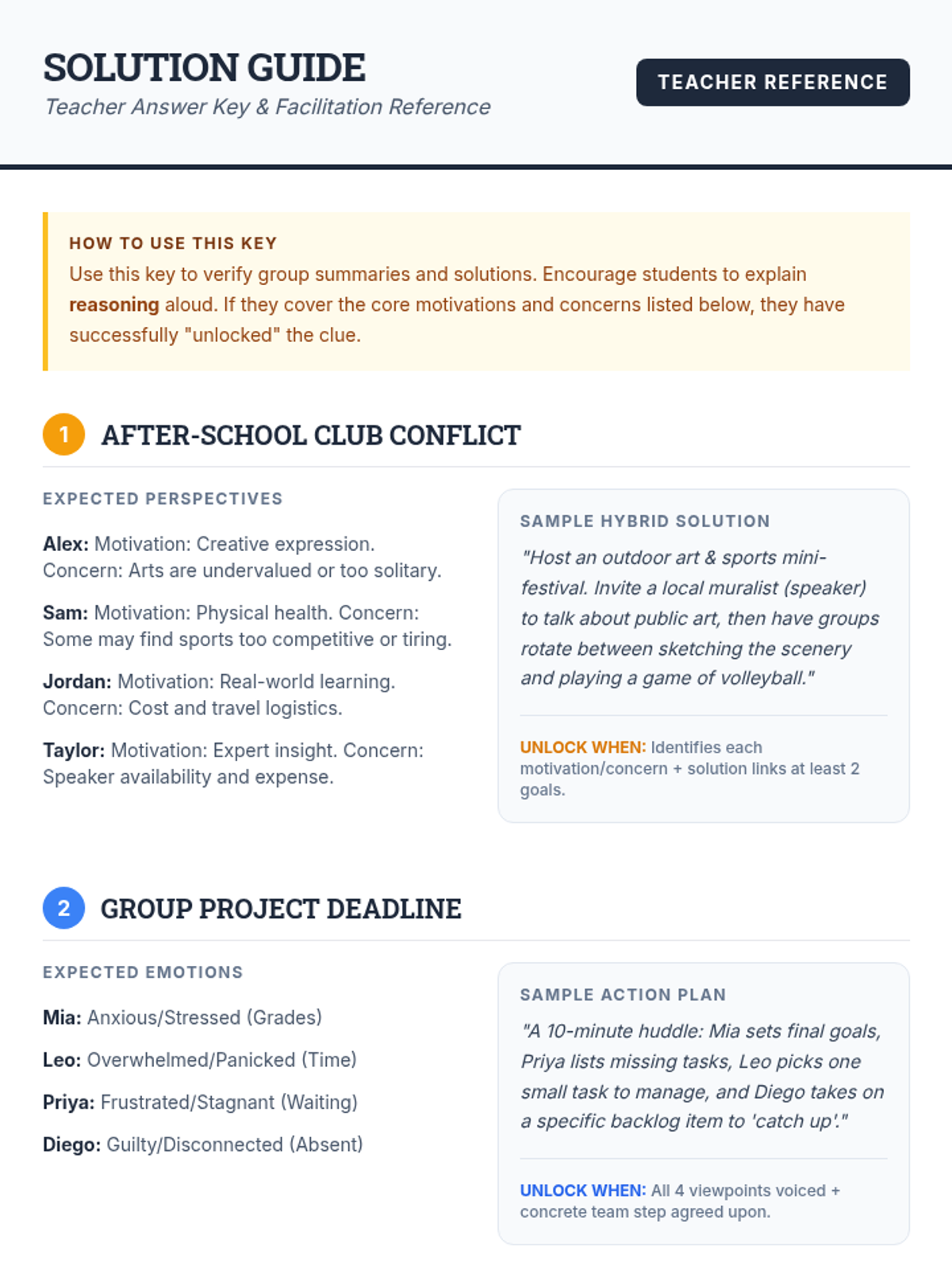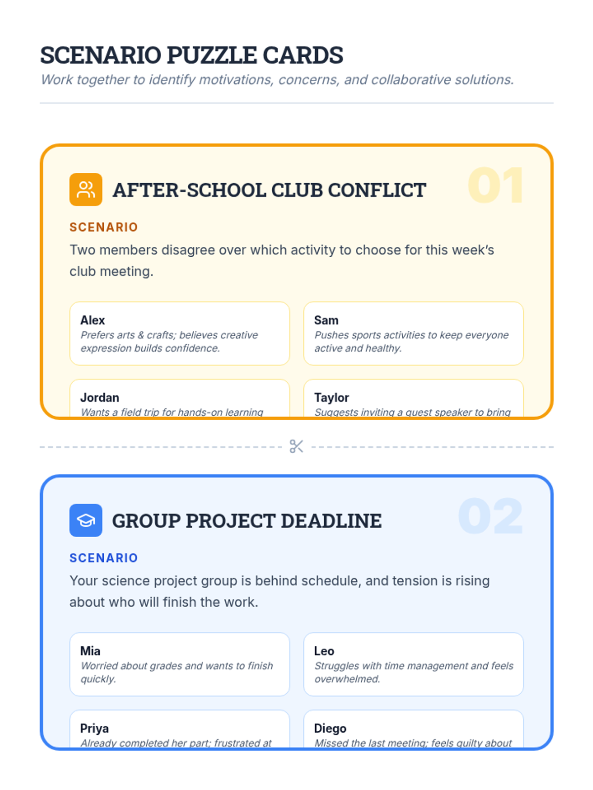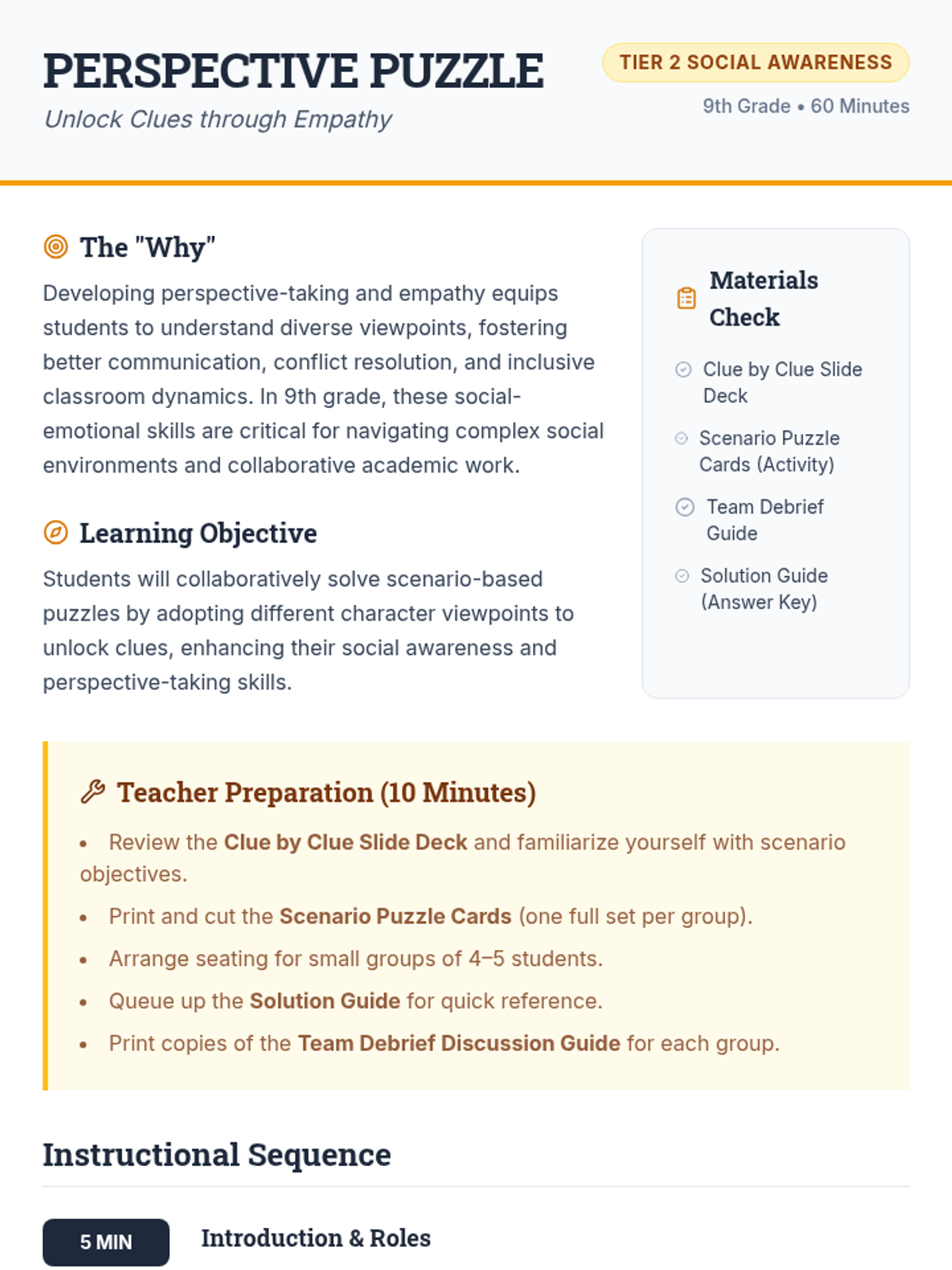 A Tier 2 small-group lesson for 9th graders focusing on social awareness. Students solve scenario-based puzzles by empathizing with diverse character viewpoints to strengthen perspective-taking skills.