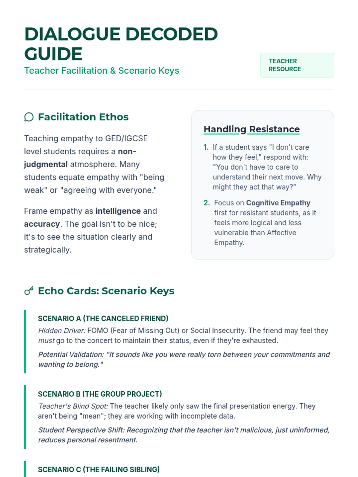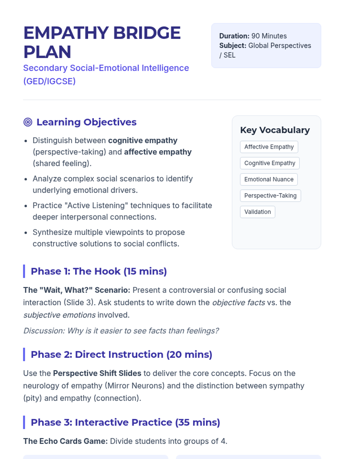 A comprehensive lesson for secondary students (GED/IGCSE) focusing on the mechanics of empathy, perspective-taking, and emotional intelligence through interactive scenarios and critical reflection.