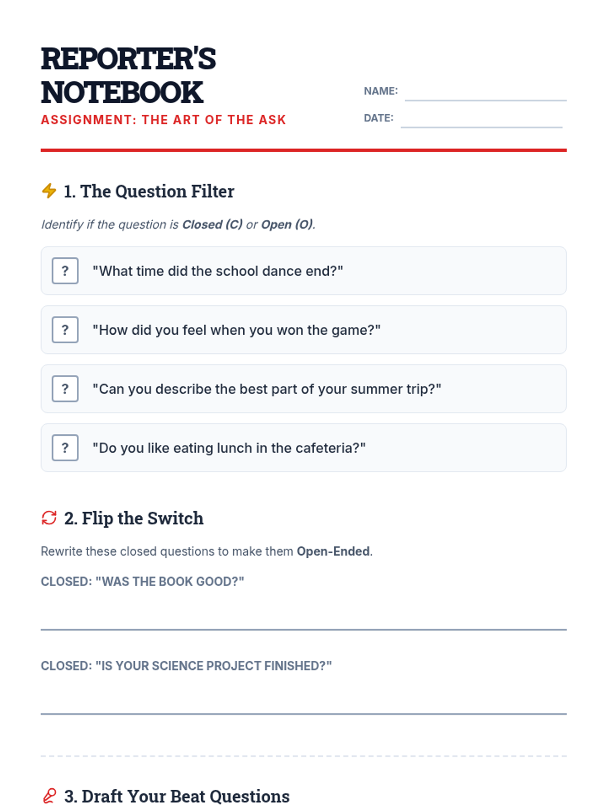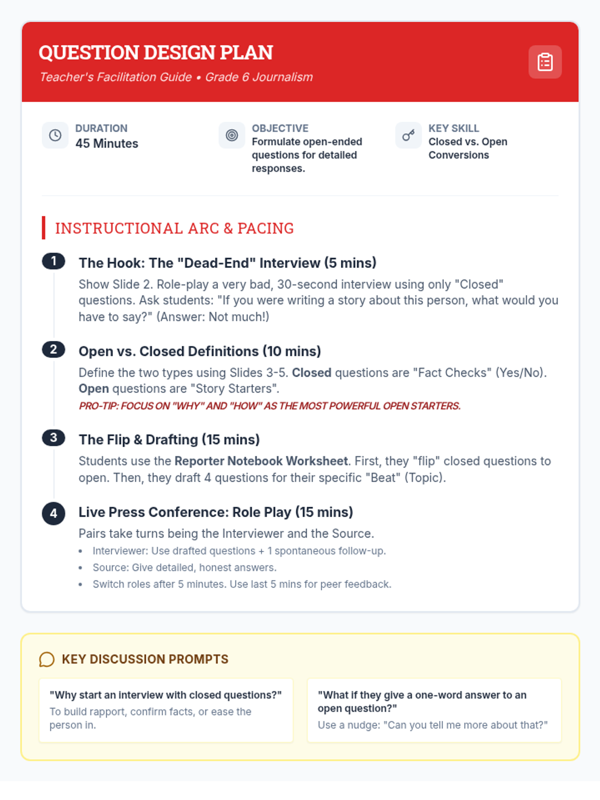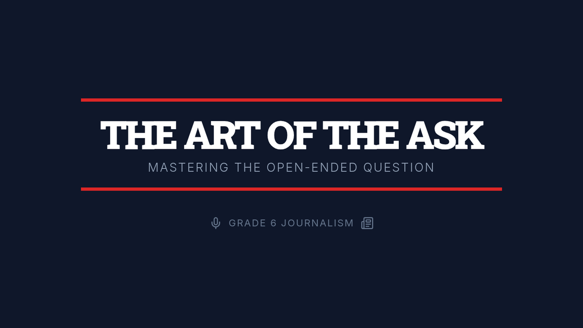A 6th-grade journalism-themed lesson focused on the power of open-ended questions. Students learn to pivot away from 'yes/no' dead ends and draft high-impact questions for a beat interview.