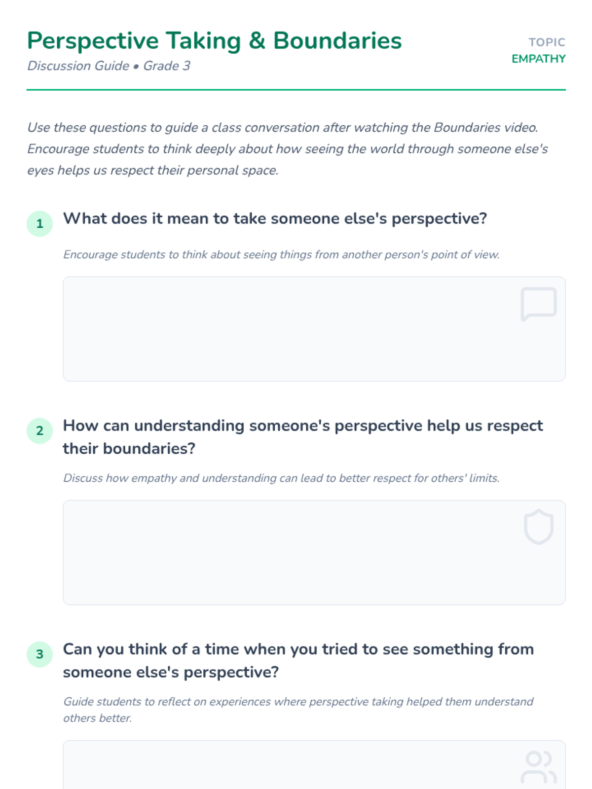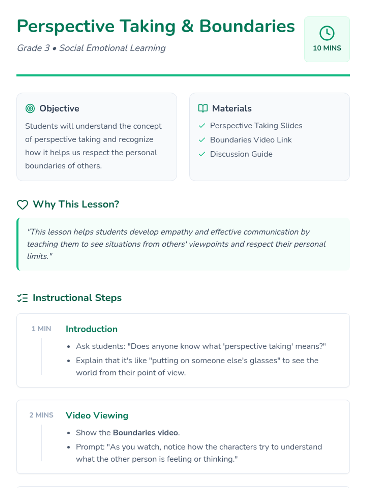 A short, impactful lesson for 3rd graders on understanding others' viewpoints and respecting personal space. Through a video and guided discussion, students develop empathy and social awareness.