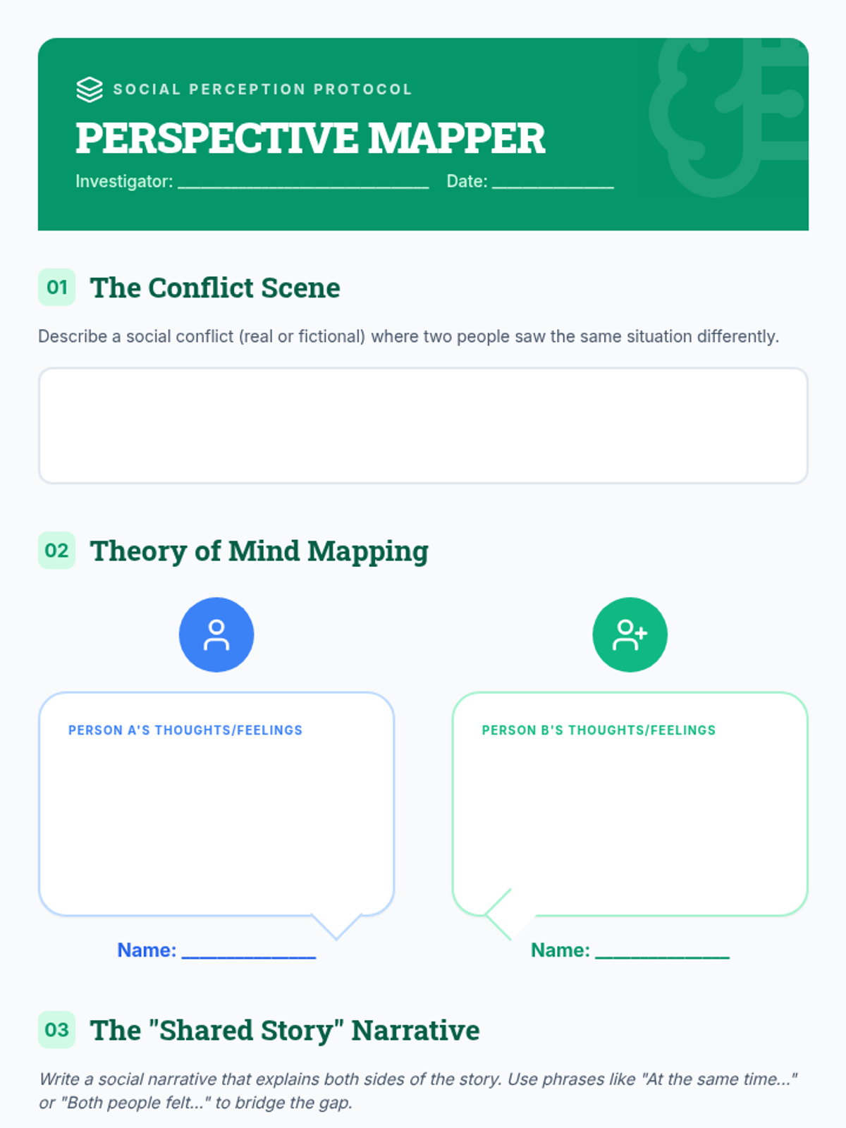 Students analyze social conflicts by mapping thoughts and feelings from multiple viewpoints.
