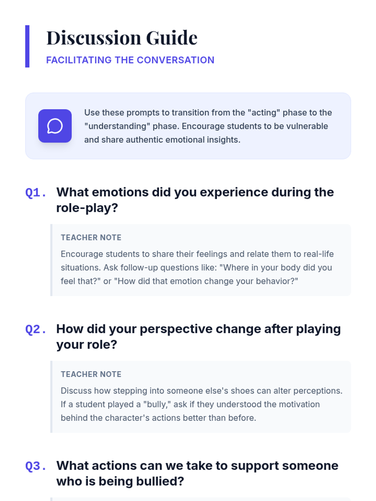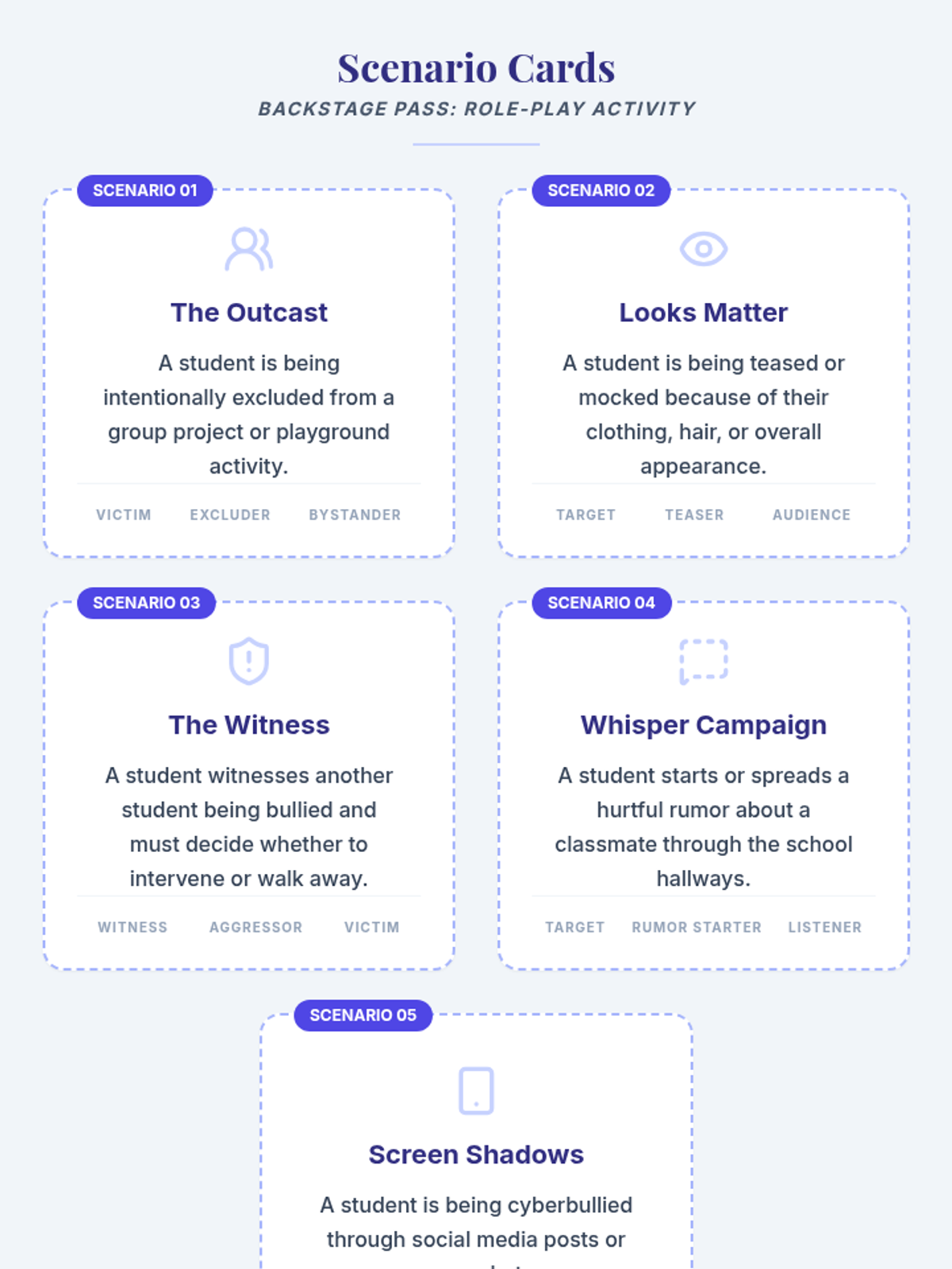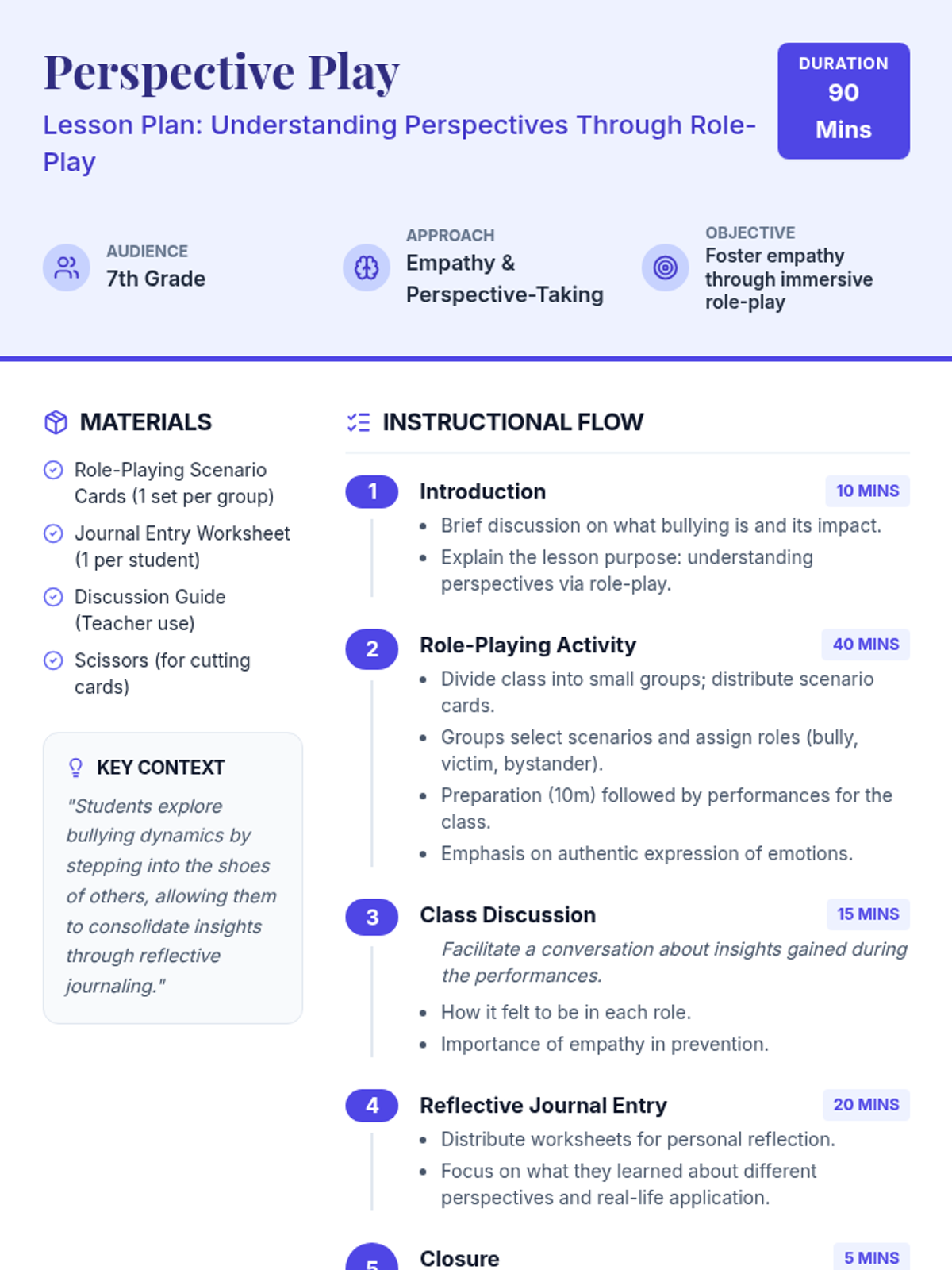 A 90-minute lesson where 7th-grade students use role-playing to explore different perspectives in bullying scenarios, fostering empathy and practical intervention skills.