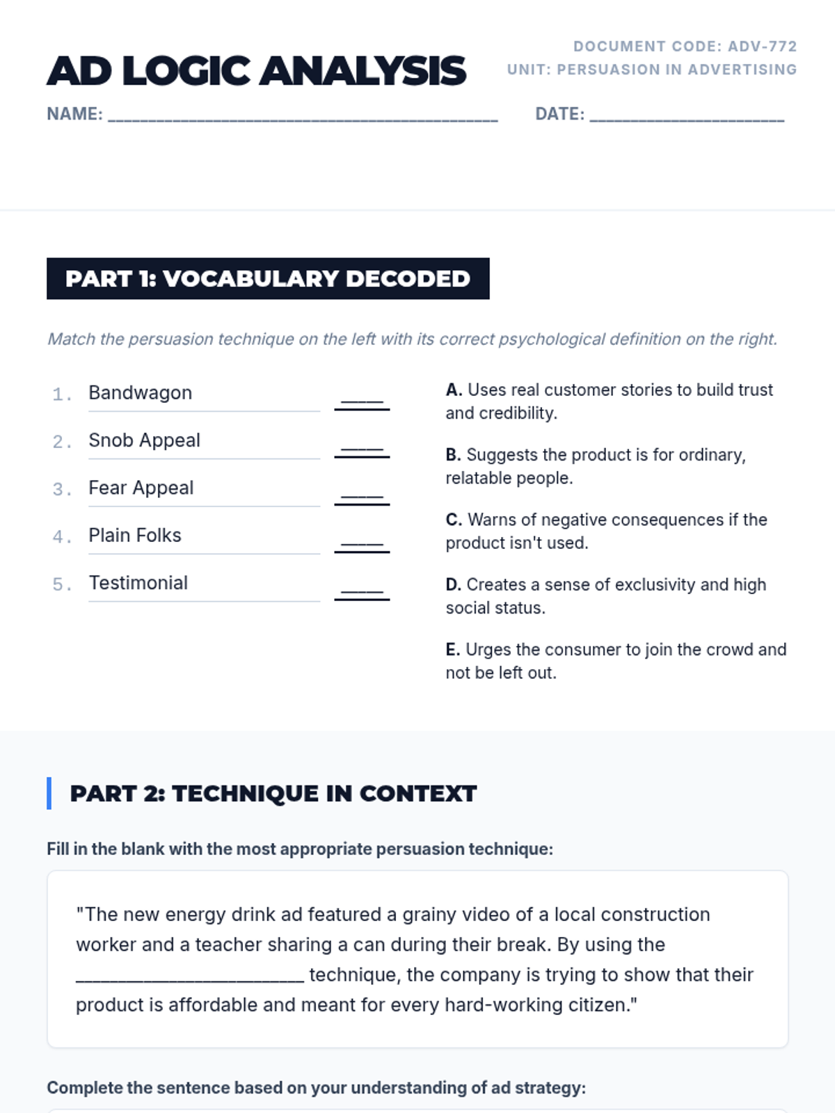 A comprehensive exploration of advertising strategies, focusing on ten key persuasion techniques, psychological triggers, and real-world ad analysis for high school students.