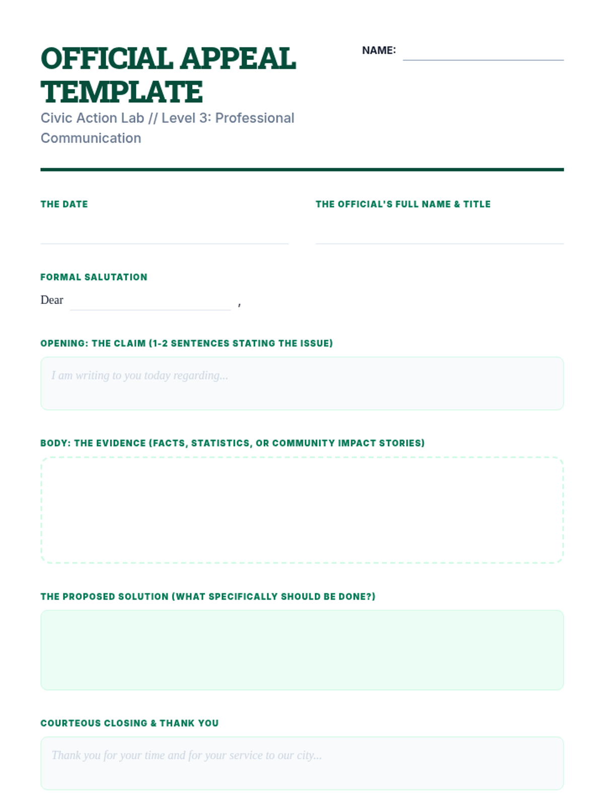 Students master the art of formal advocacy by drafting persuasive letters to officials, focusing on evidence-based claims and maintaining a professional tone through comparative analysis of communication styles.