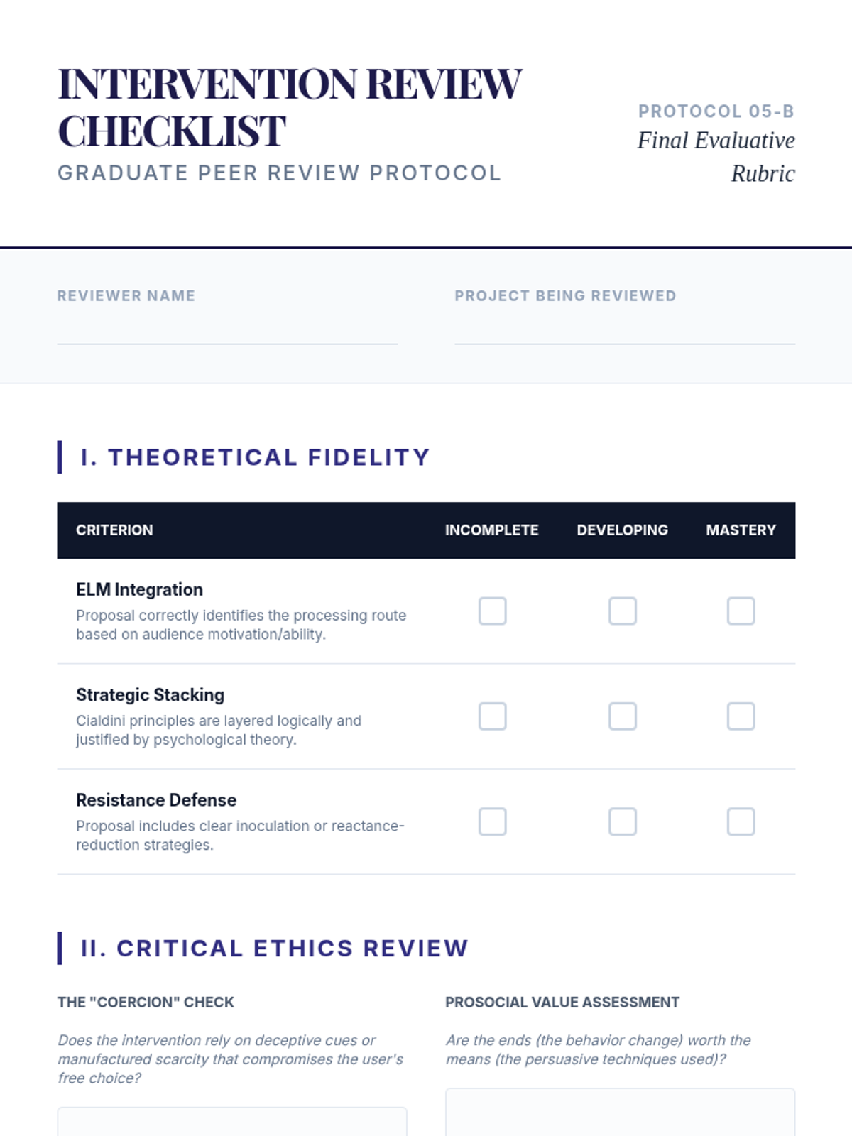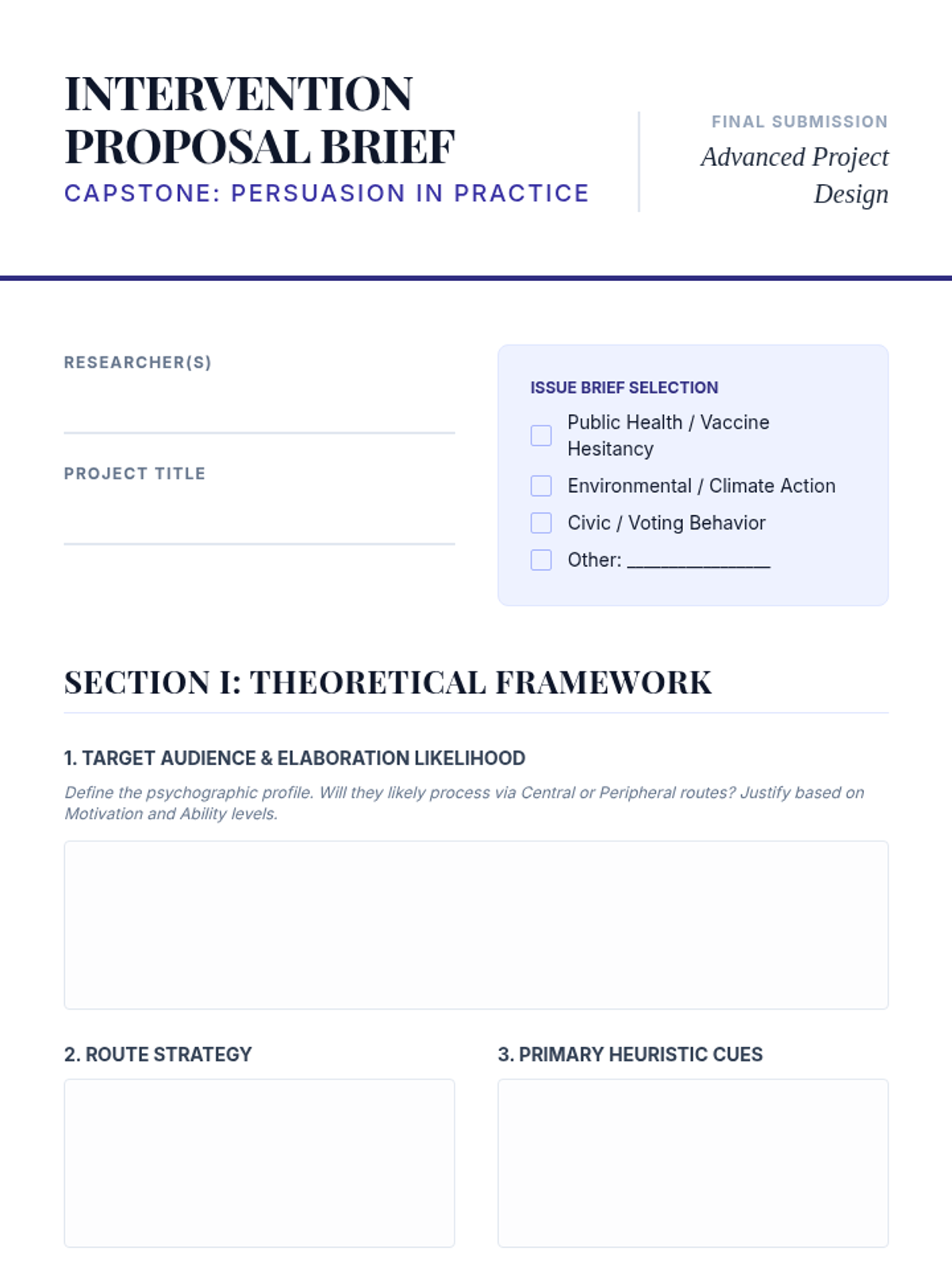 A capstone workshop where students design and peer-review a persuasive intervention strategy for a real-world social issue.