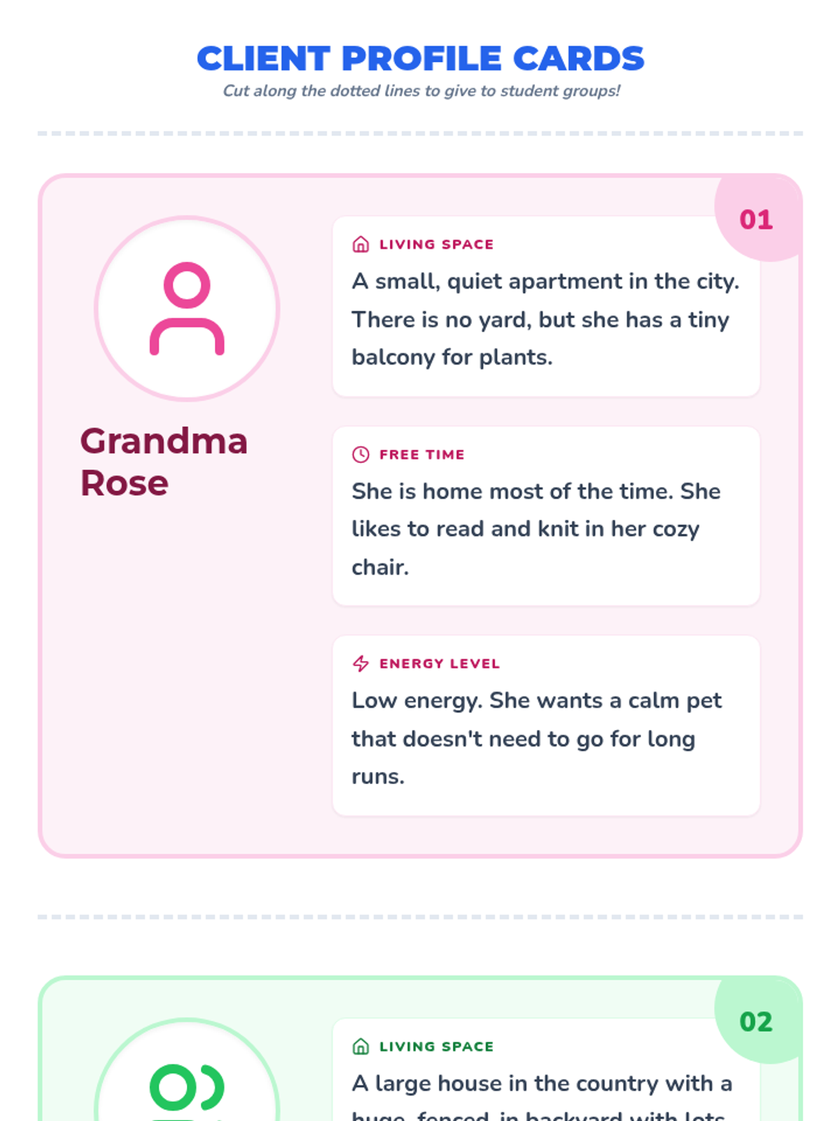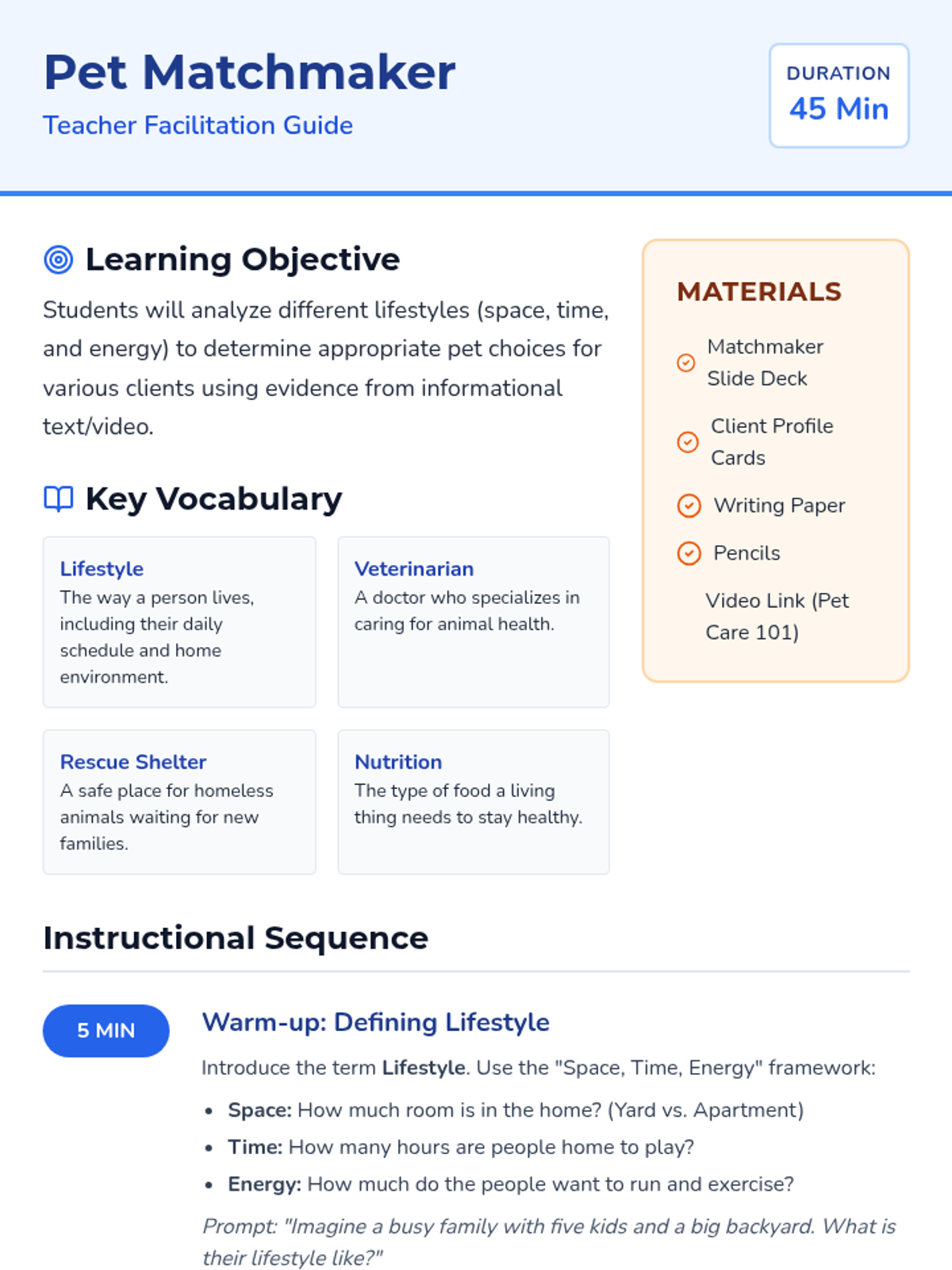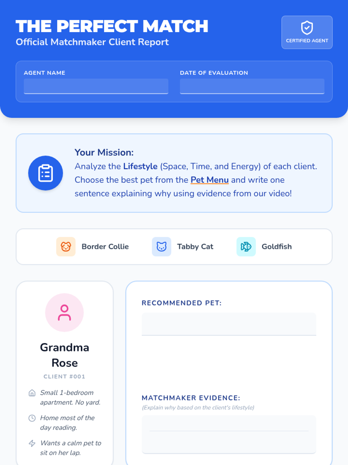 A lesson where students become 'Pet Matchmakers,' analyzing lifestyles (space, time, and energy) to recommend the perfect pet for various clients based on evidence from a pet care video.