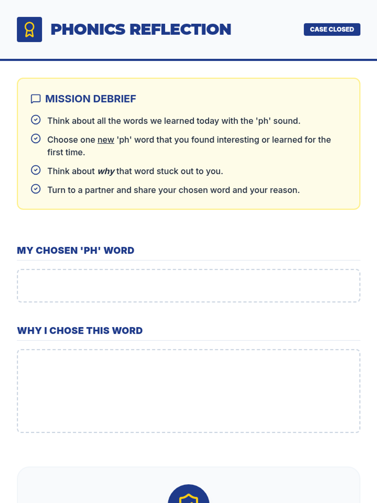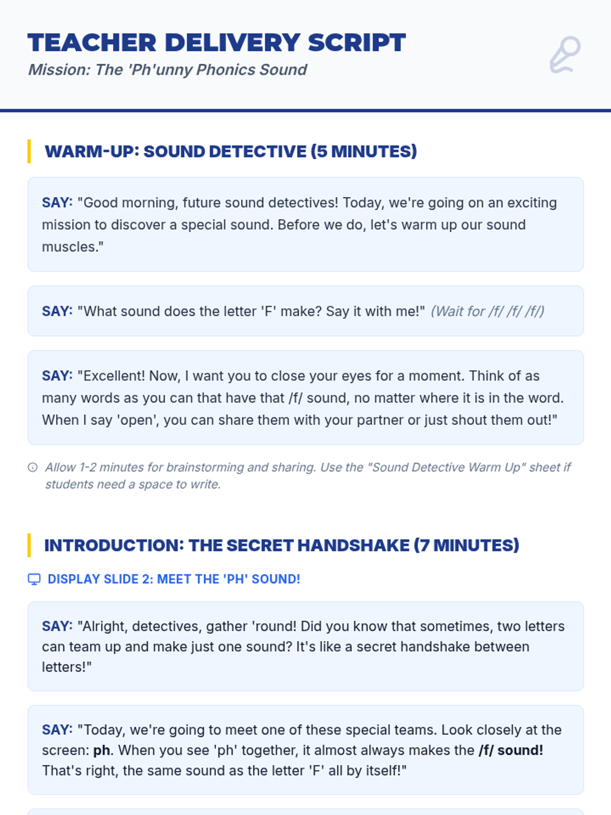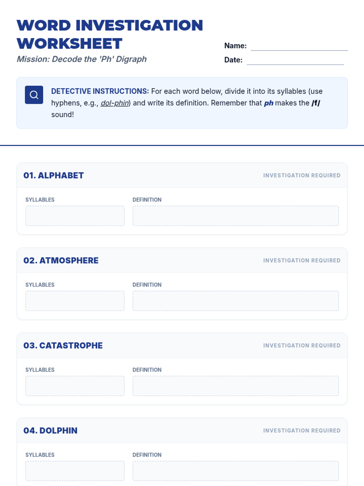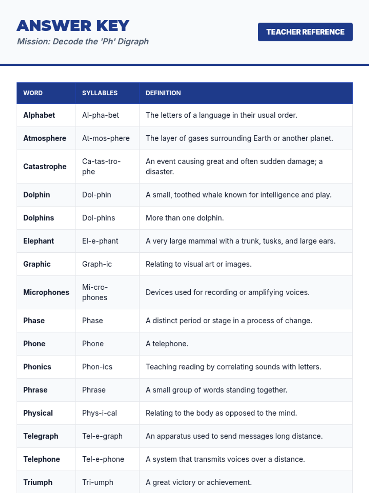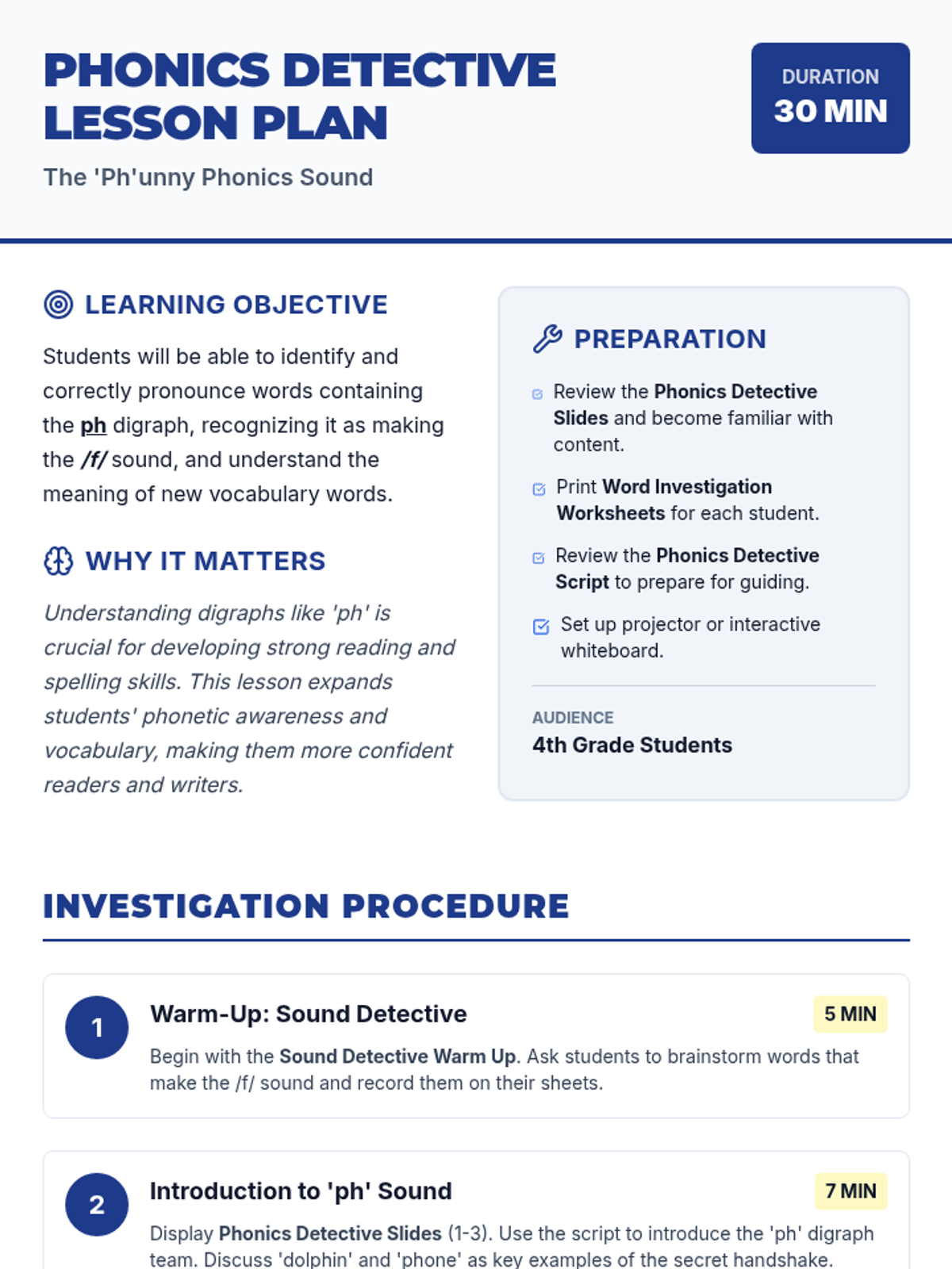 An engaging 30-minute phonics lesson for 4th graders introducing the 'ph' digraph. Students will investigate words where 'ph' makes the /f/ sound through interactive slides, a detective-themed script, and hands-on practice.