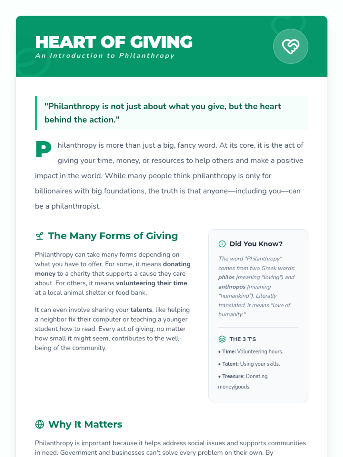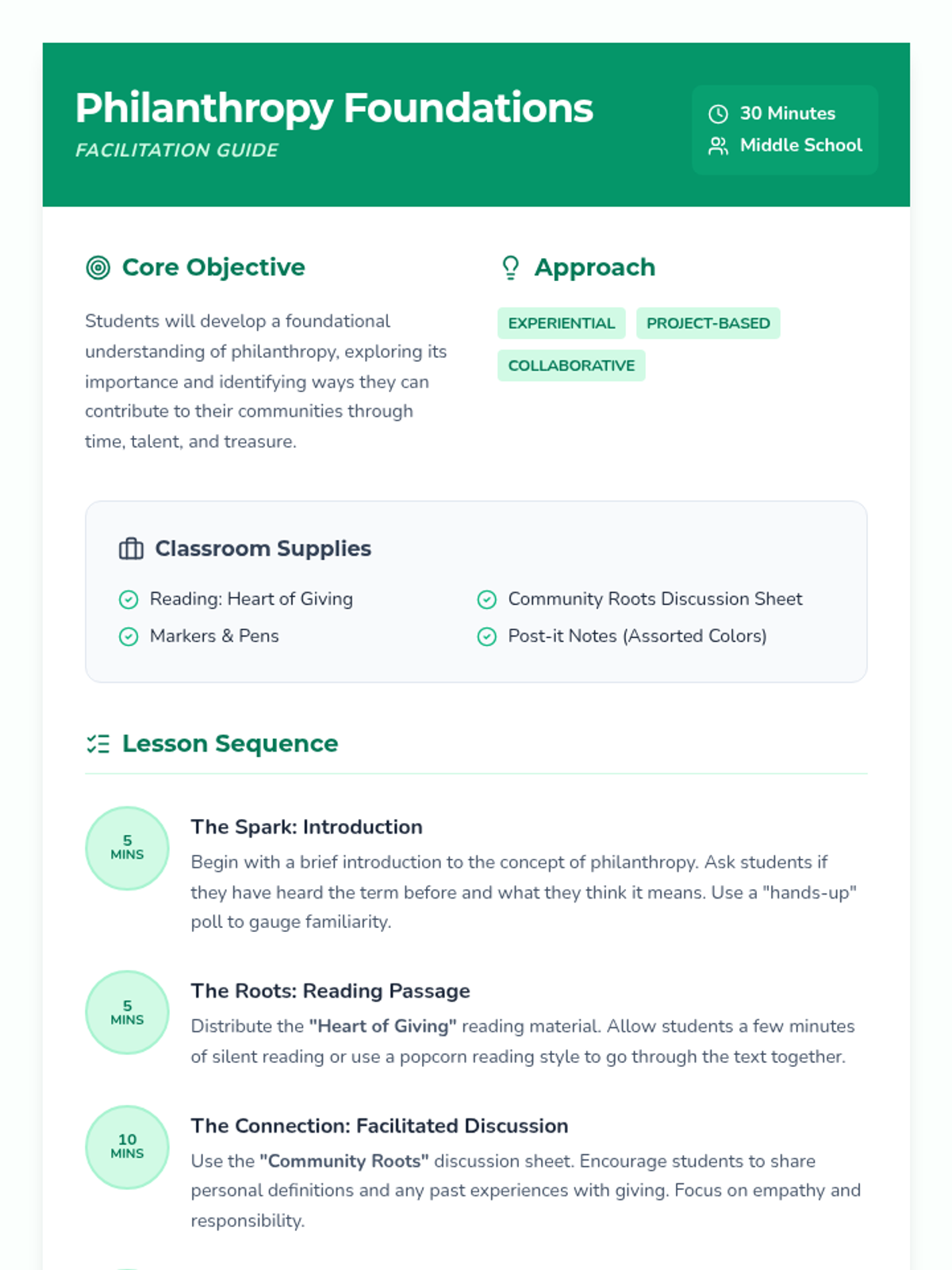 An introductory middle school lesson on philanthropy, using experiential and project-based learning to explore community impact and personal responsibility.