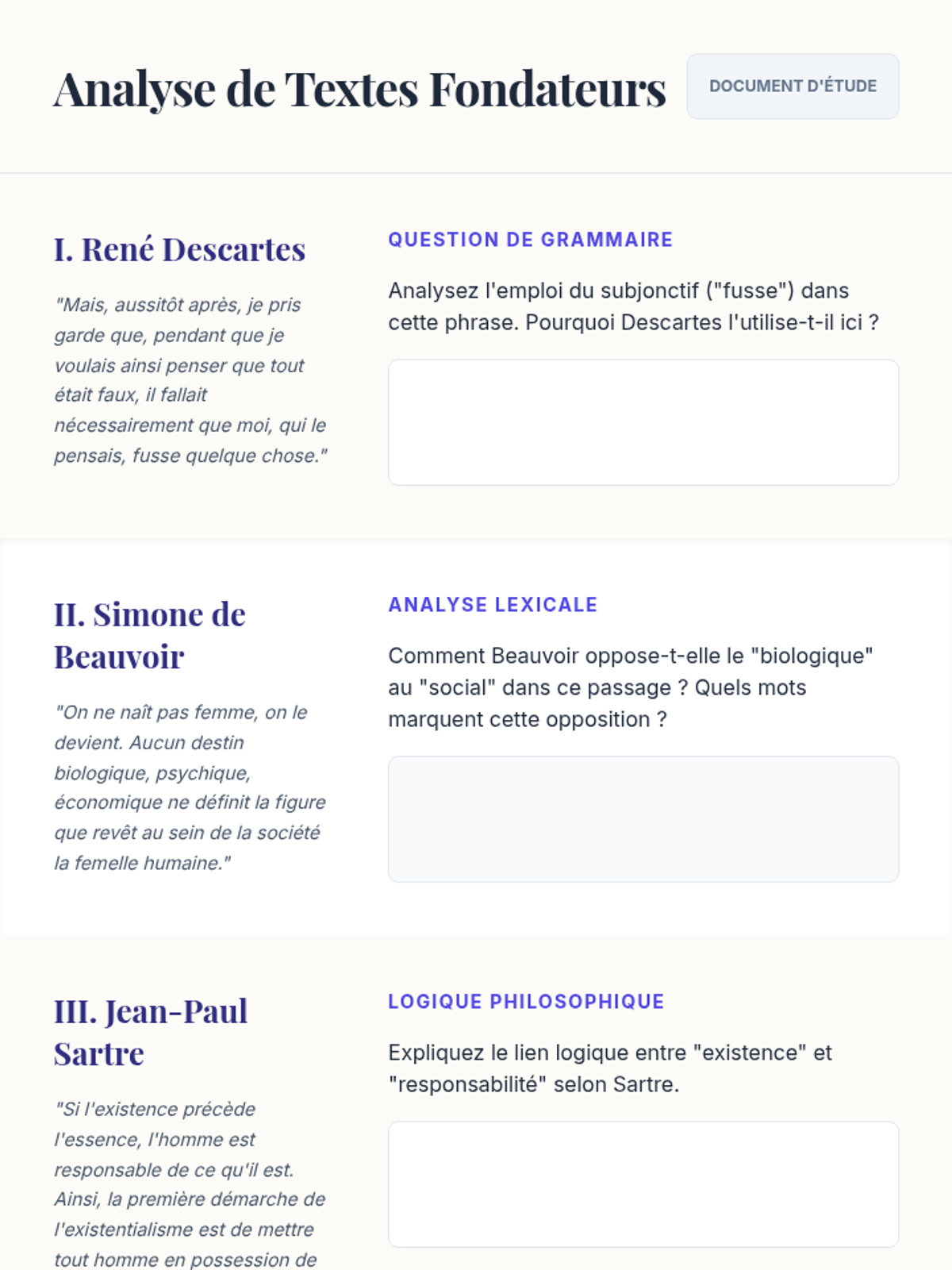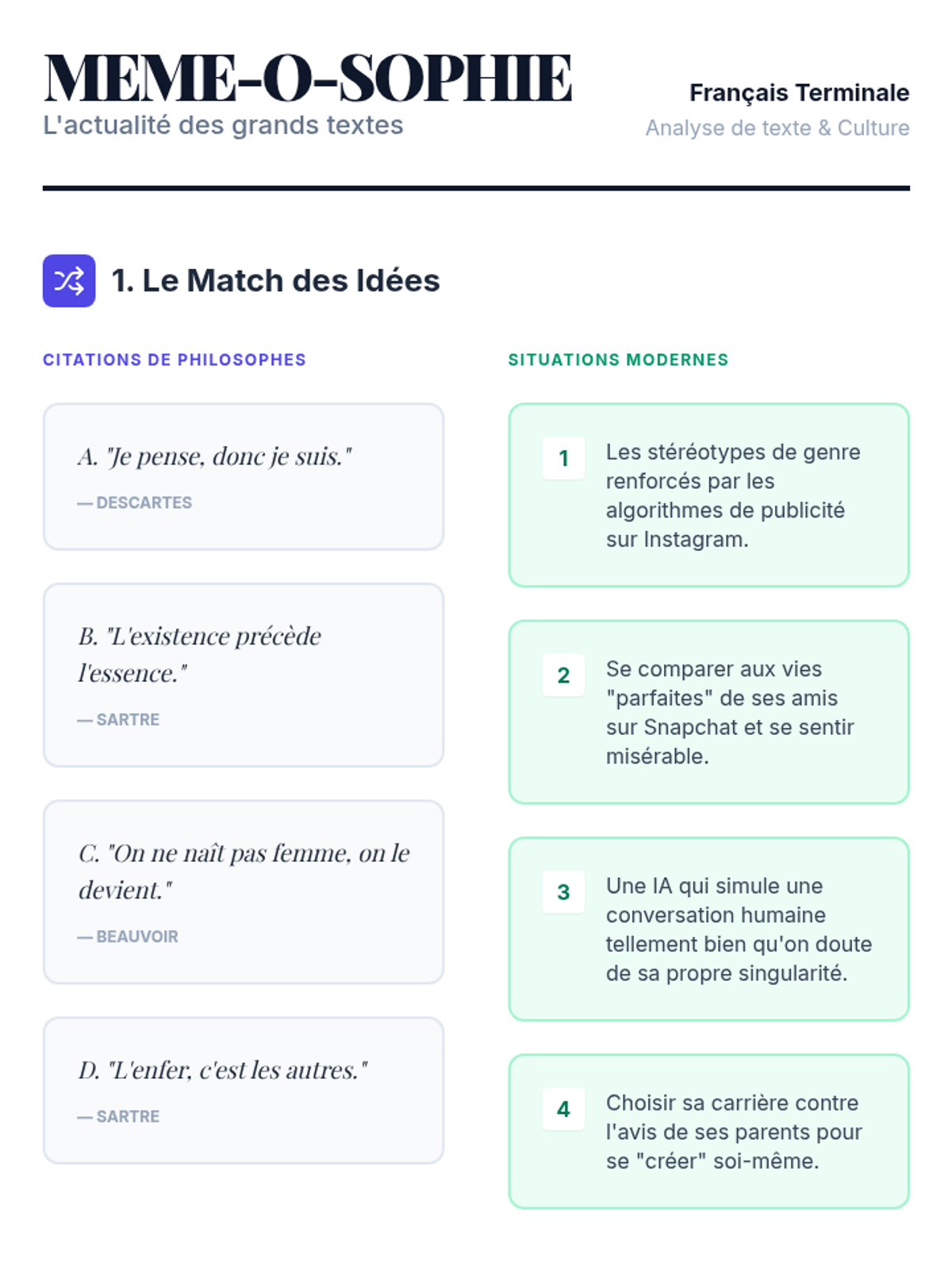 Students analyze famous quotes from Sartre, Descartes, and Beauvoir. They dissect the vocabulary and grammatical structures used to convey complex thoughts concisely and match quotes to modern-day memes.