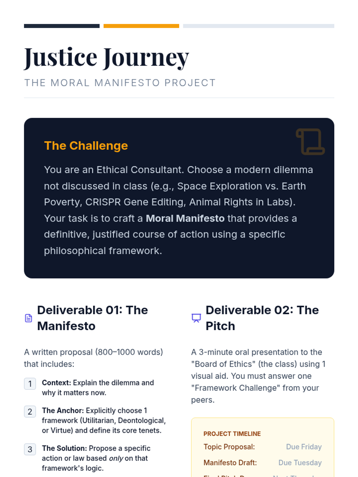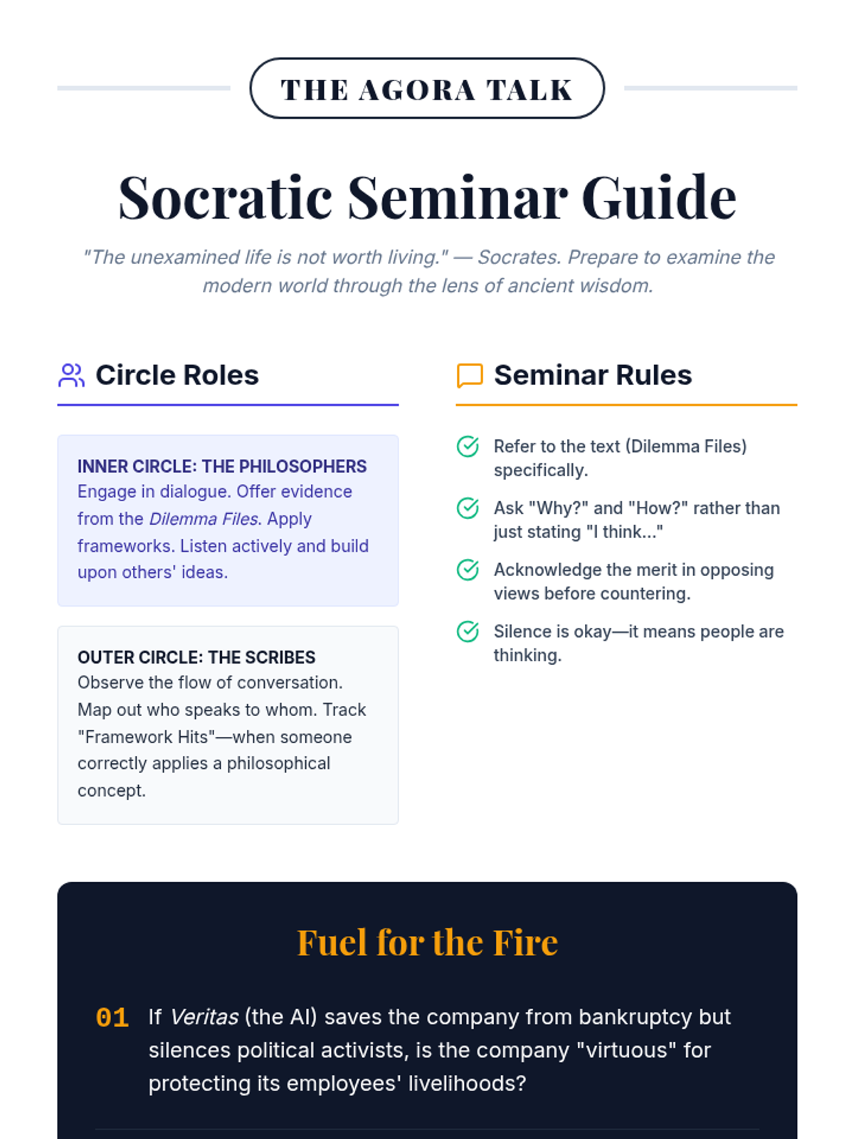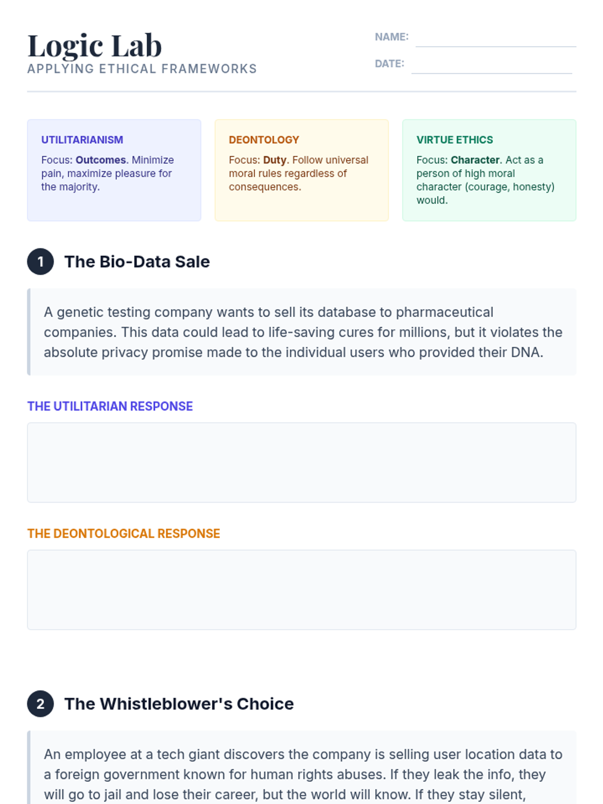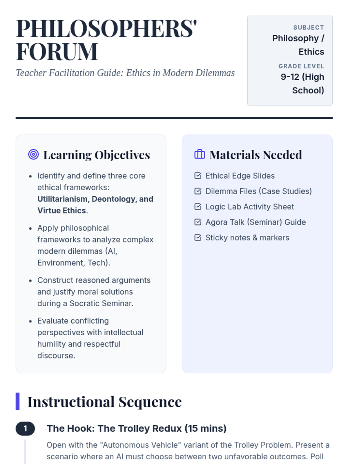 A high school philosophy lesson where students apply classical ethical frameworks to modern challenges like AI, environmental justice, and social media responsibility. students engage in Socratic seminars and case study analysis to justify moral solutions.