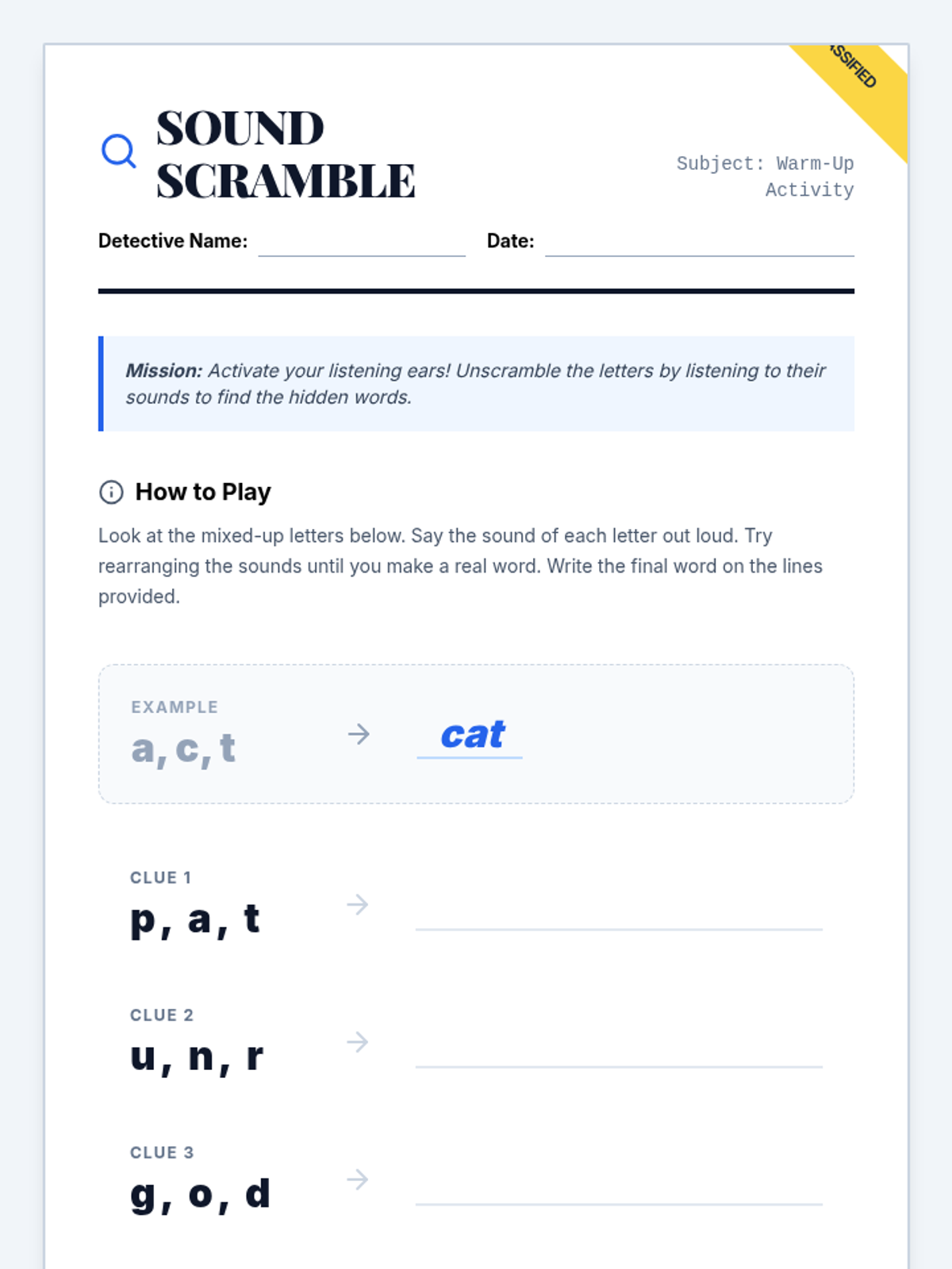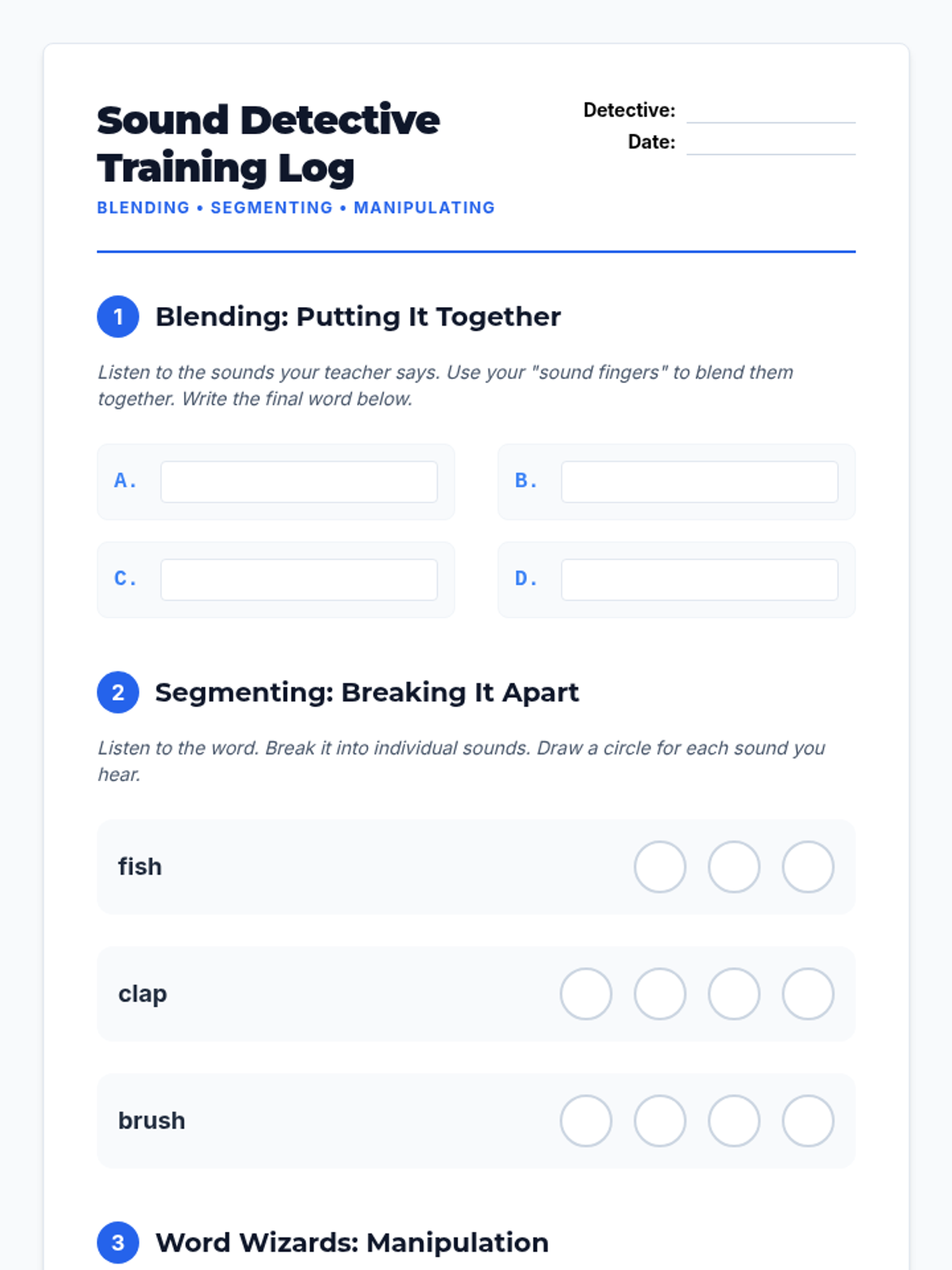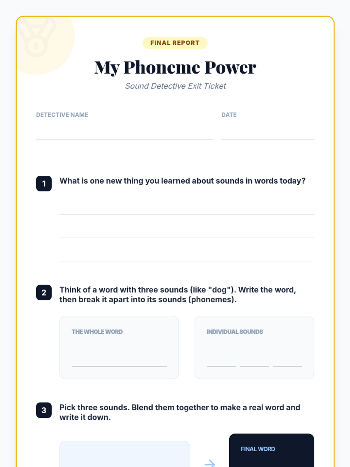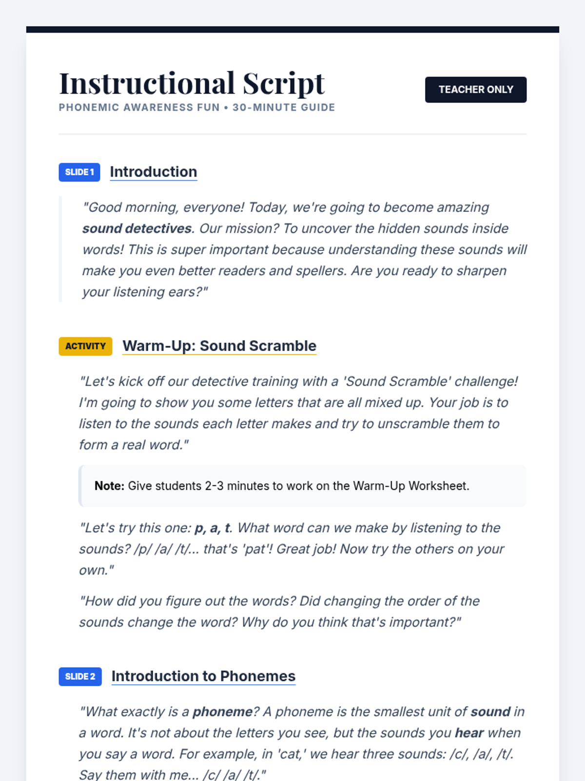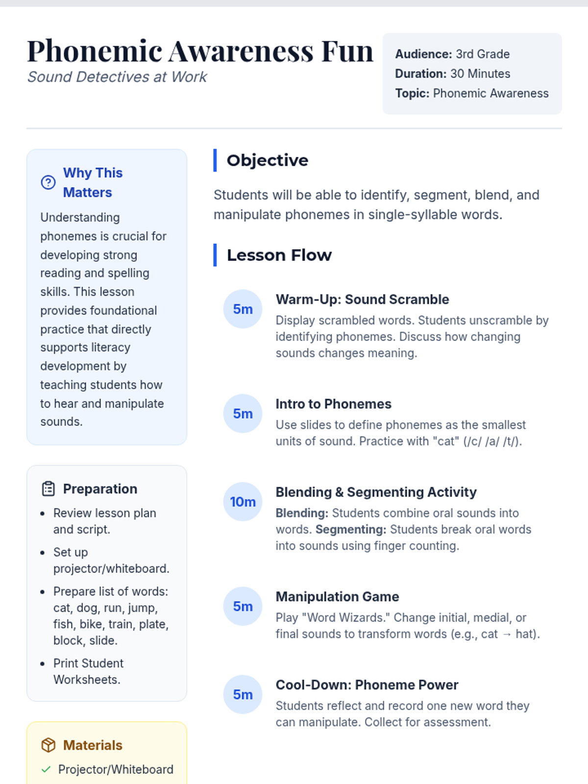 This interactive 30-minute lesson introduces 3rd-grade students to phonemic awareness, focusing on identifying, segmenting, and manipulating sounds in single-syllable words through a 'Sound Detective' theme.