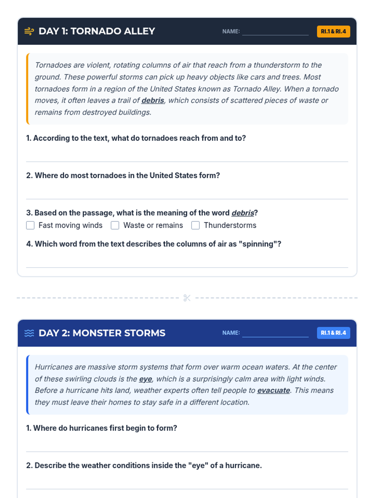 A full-length practice experience featuring an informational passage, tiered evidence-based questions, and a narrative writing task.