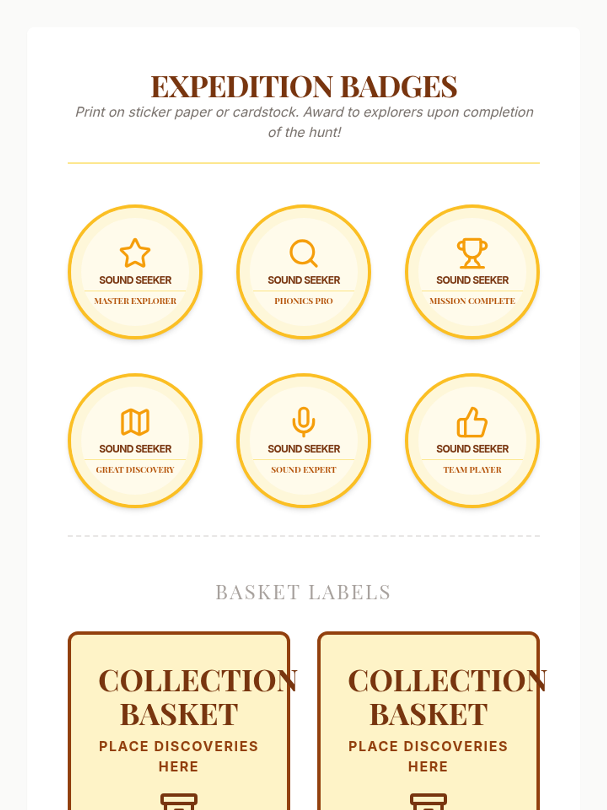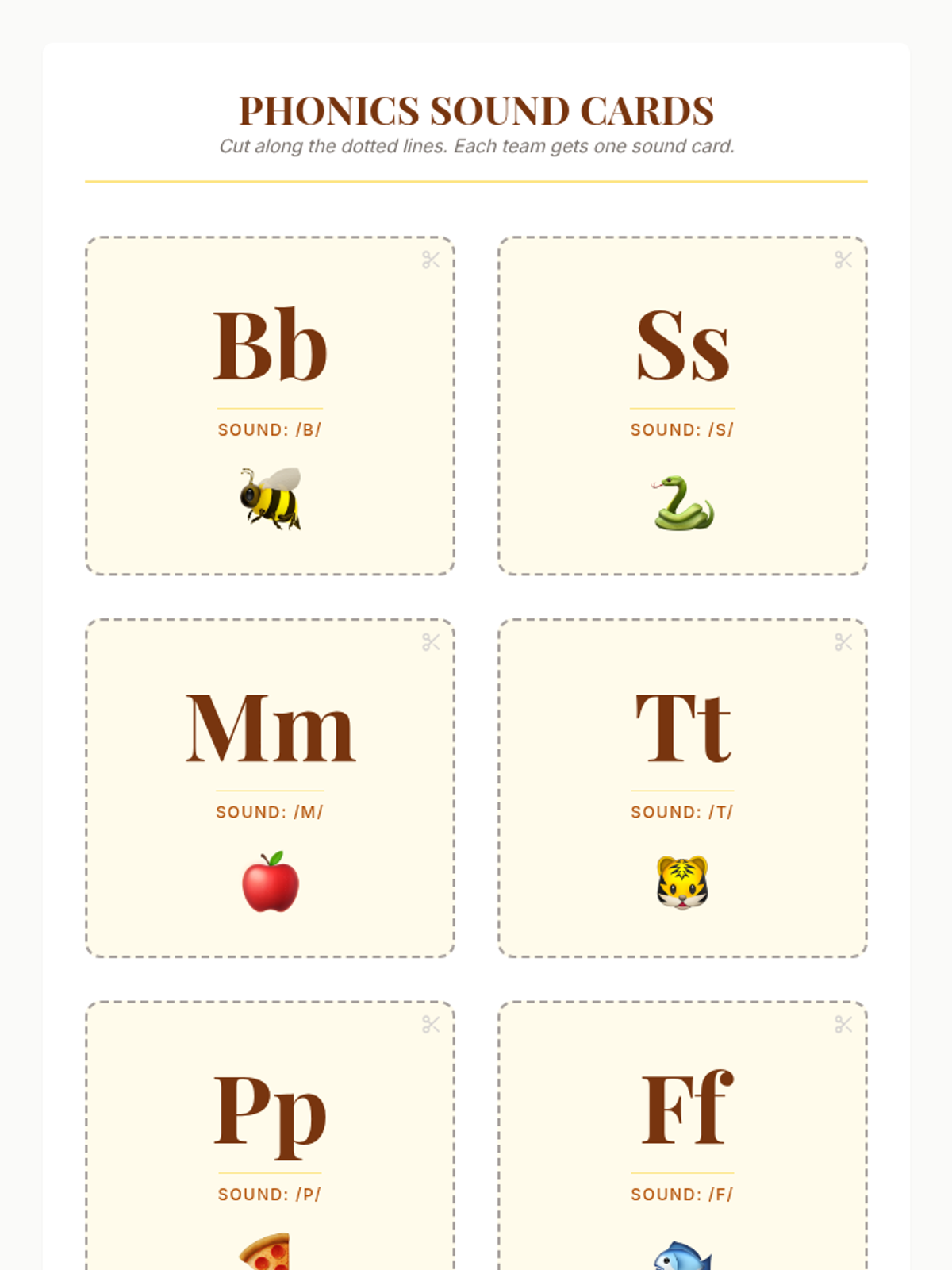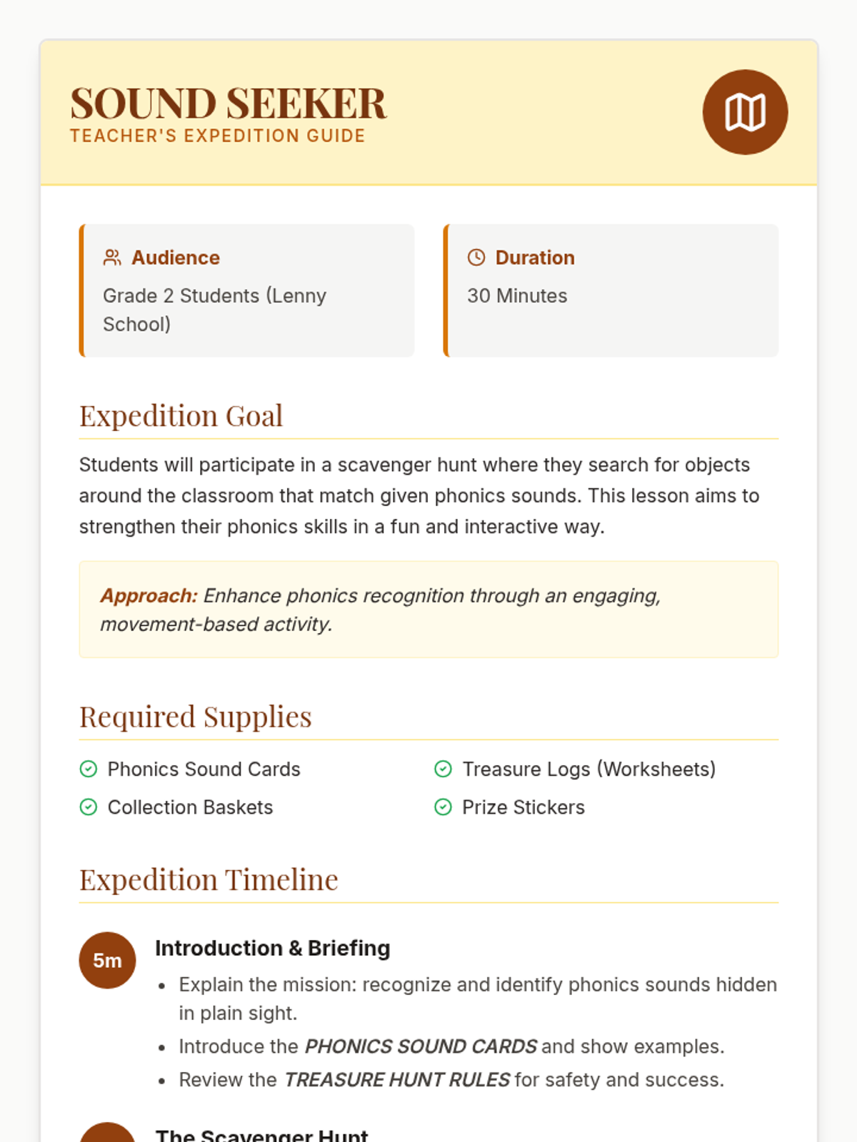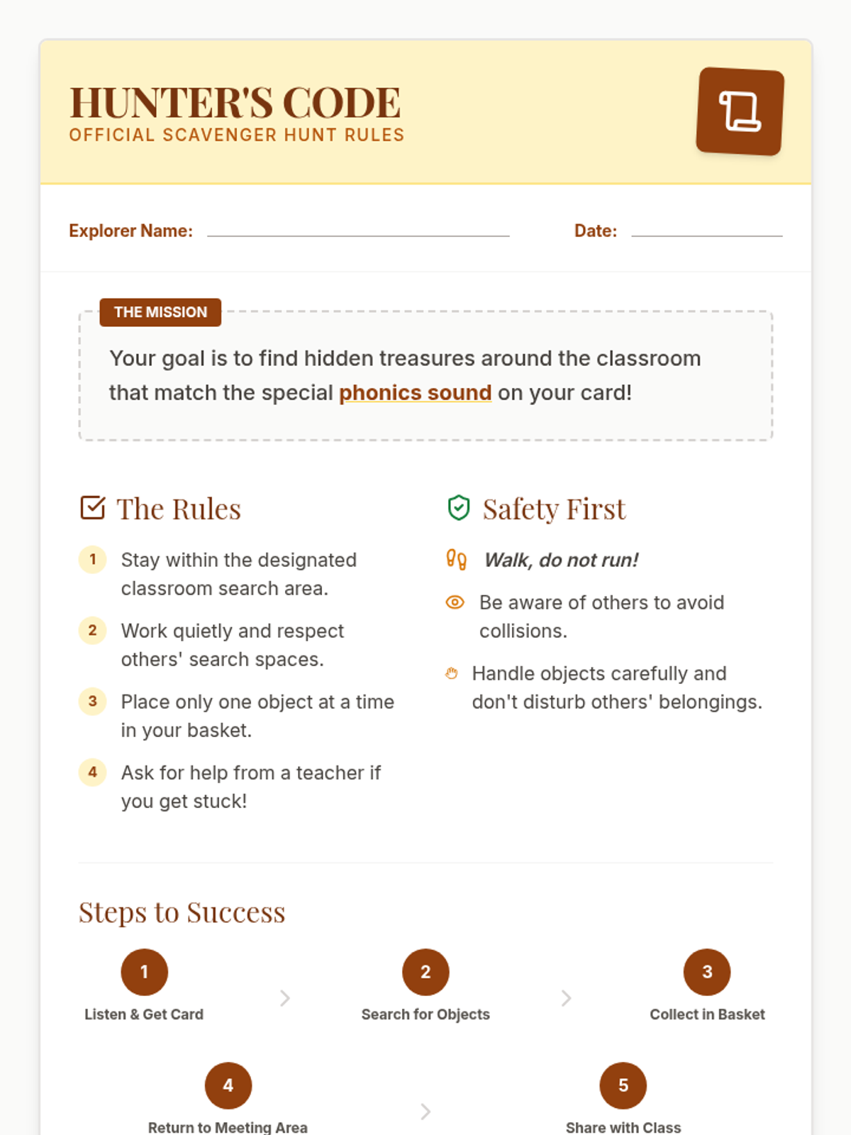 A fun, interactive scavenger hunt where Grade 2 students search the classroom for objects matching specific phonics sounds to reinforce recognition and identification skills.
