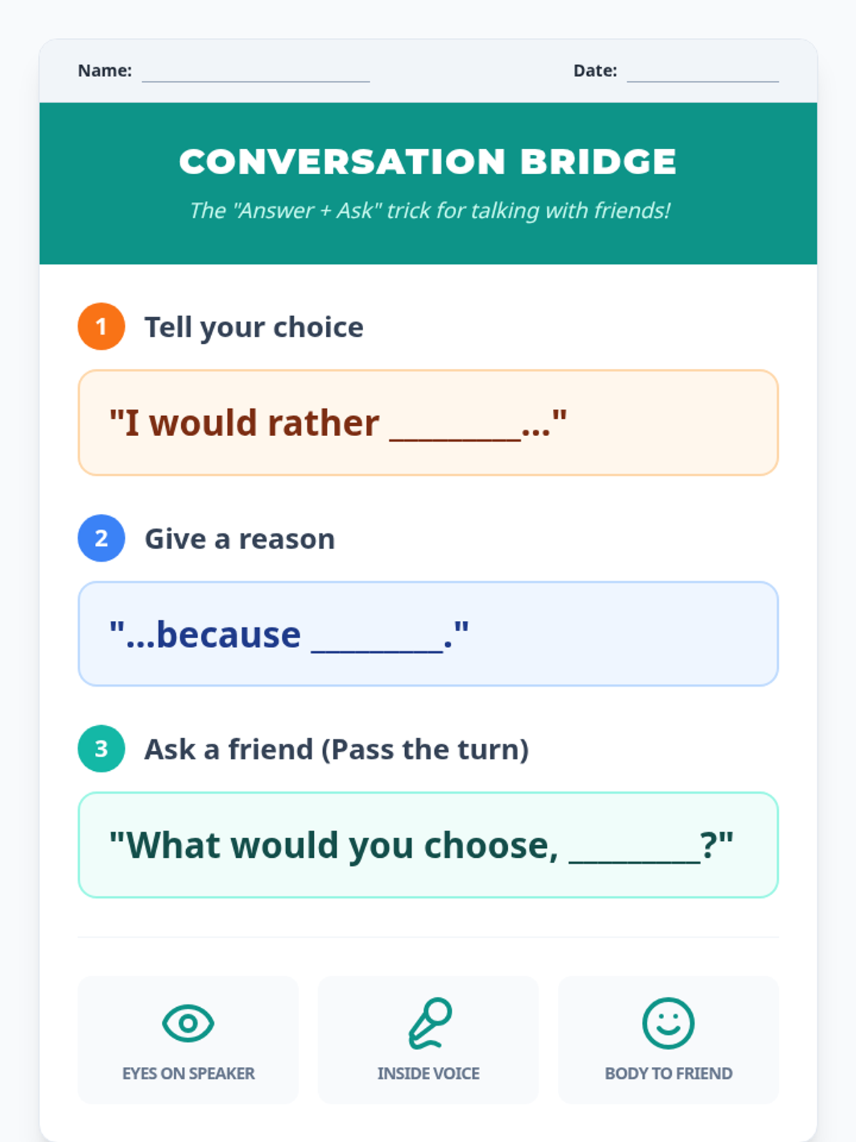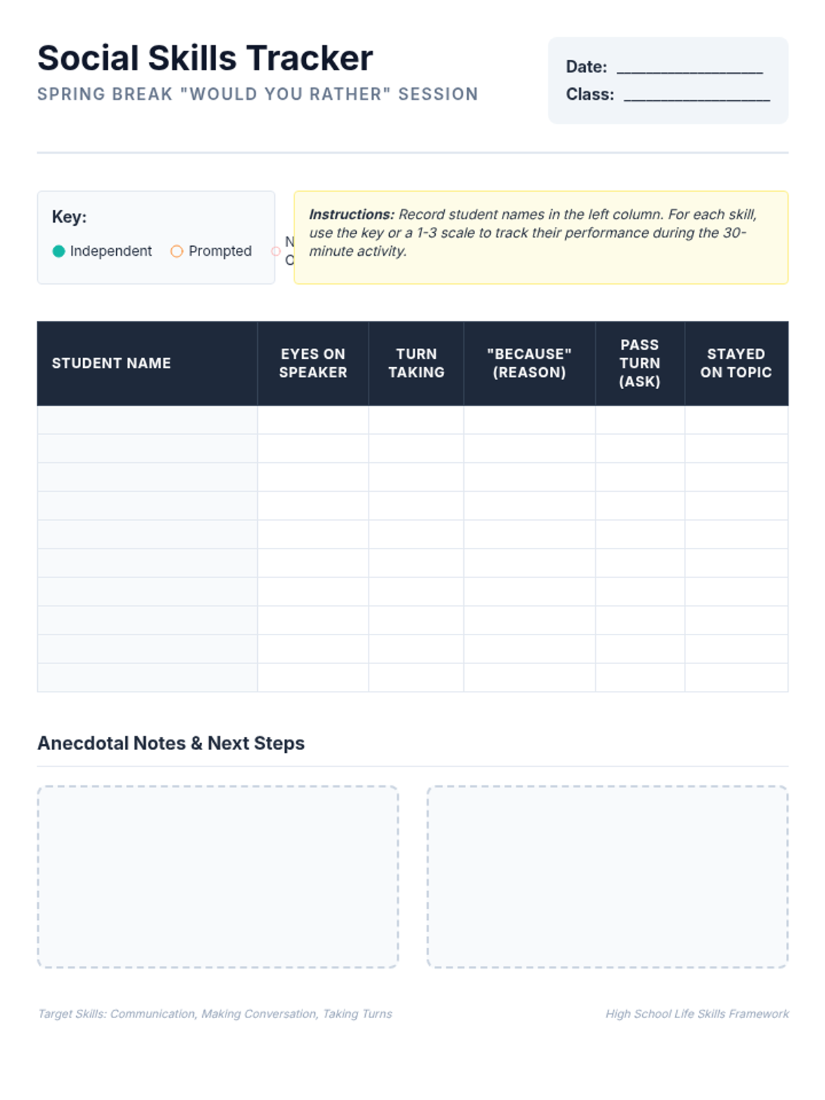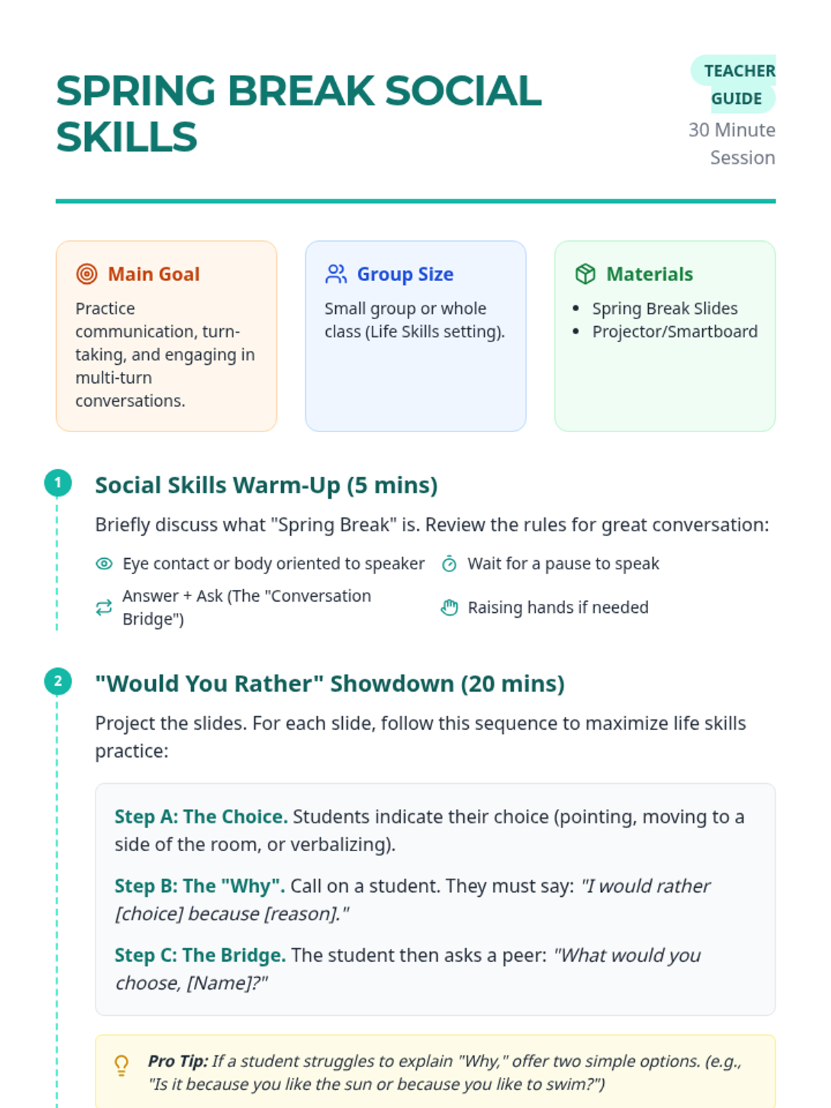 A 30-minute life skills lesson focused on communication, turn-taking, and conversation skills through a fun Spring Break themed 'Would You Rather' activity.