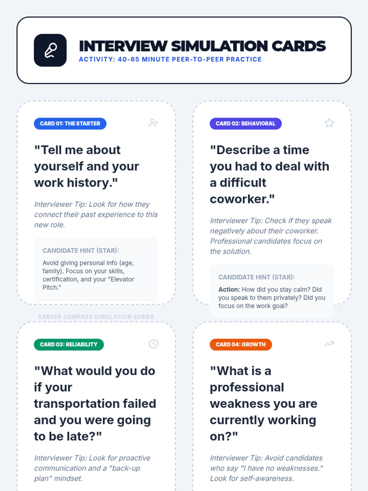 A comprehensive 4-hour coaching session designed for adult learners with intellectual disabilities and high anxiety. It covers emotional resilience during the job search, professional presentation, and practical interview skills for phone, virtual, and in-person settings.