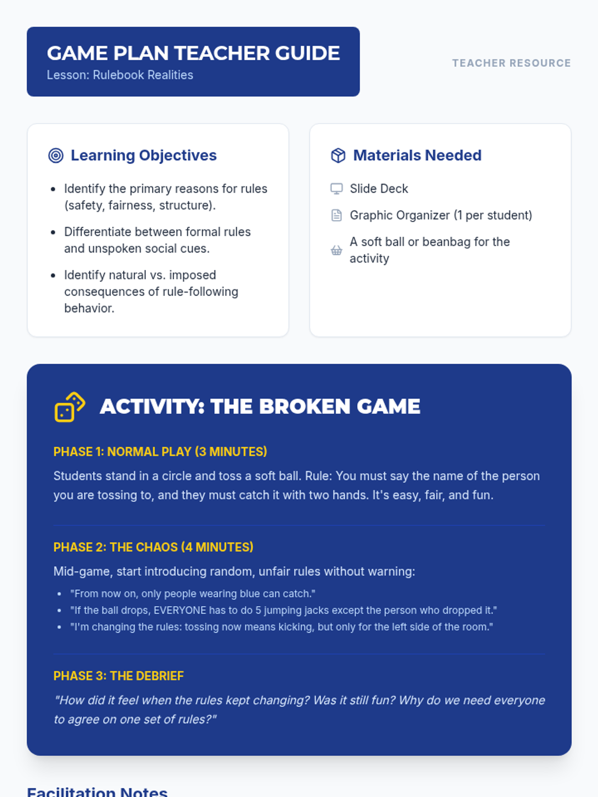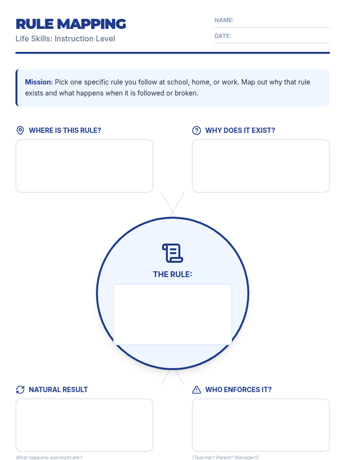 A lesson for high school life skills students exploring the purpose of rules, the difference between formal and unspoken rules, and the consequences of following (or breaking) them in various environments.