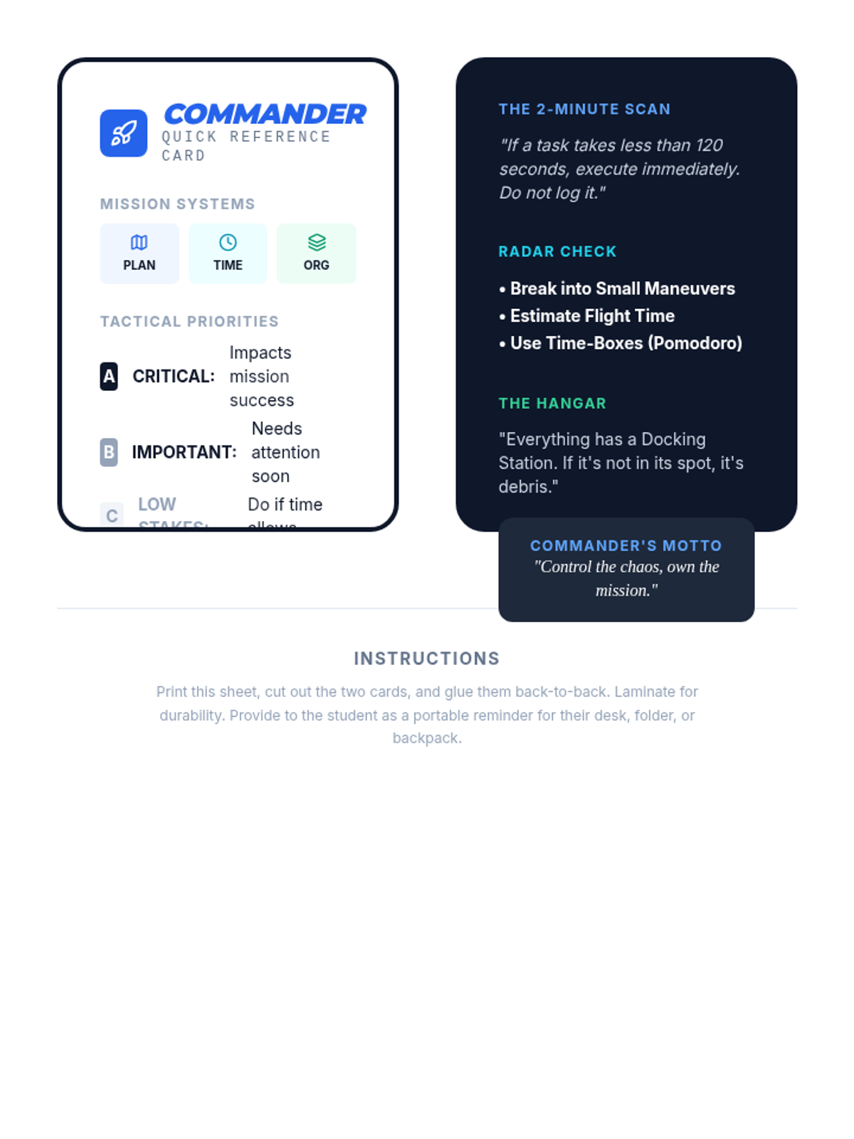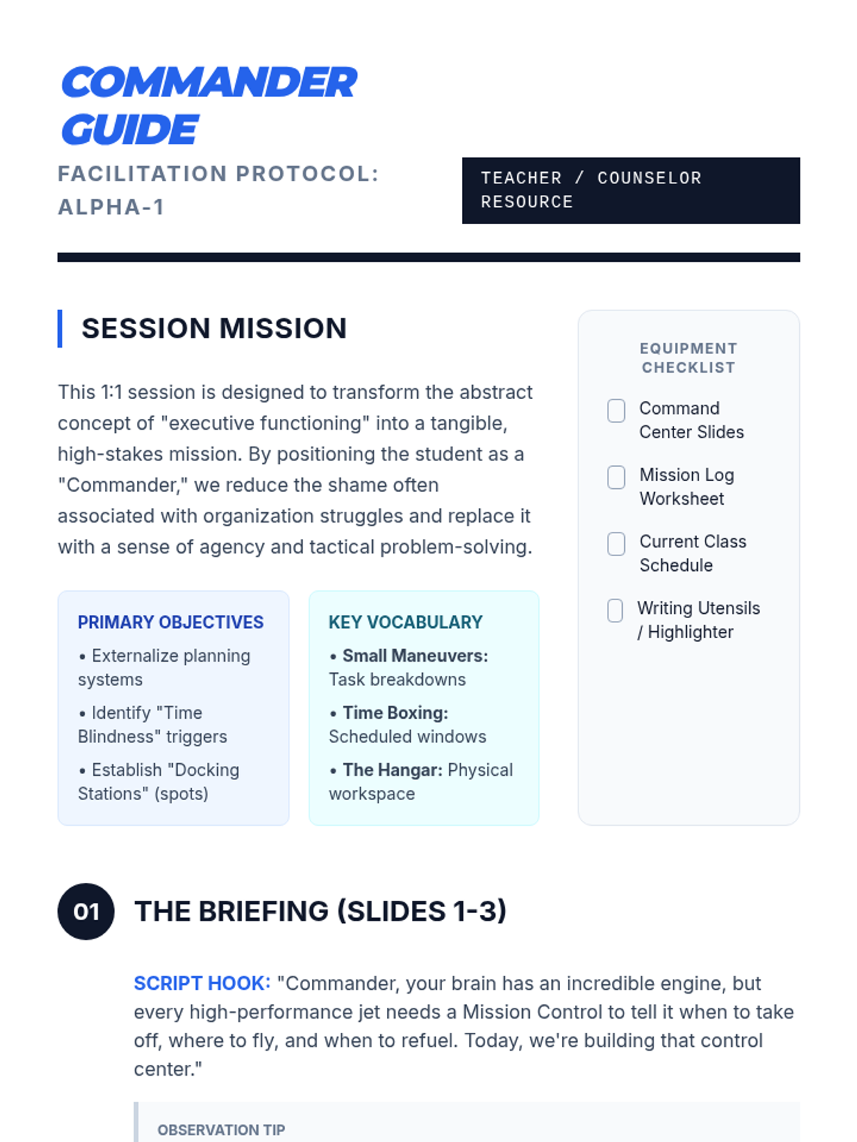 A 1:1 counseling session focused on developing essential executive functioning skills. Students learn to navigate planning, organization, and time management as commanders of their own daily 'missions'.