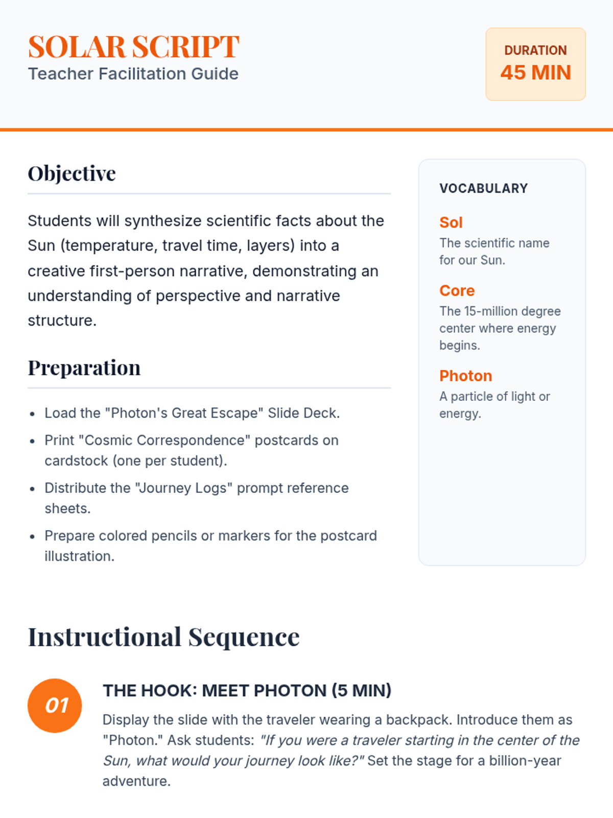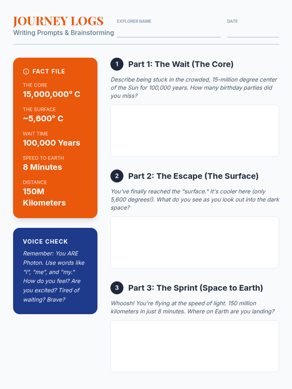 A 4th-5th grade ELA lesson that combines science and creative writing, where students write a first-person narrative from the perspective of an energy particle traveling from the Sun's core to Earth.
