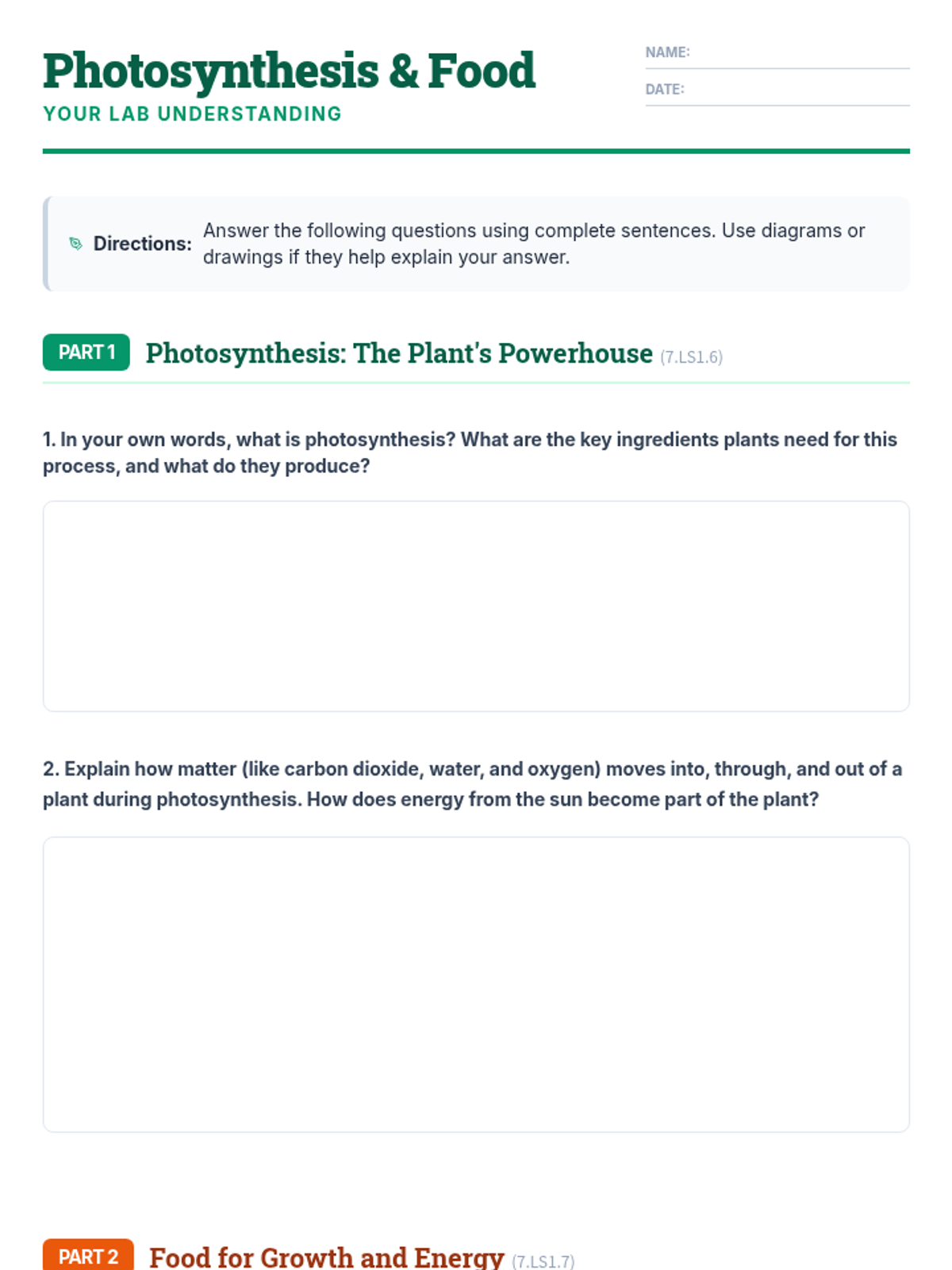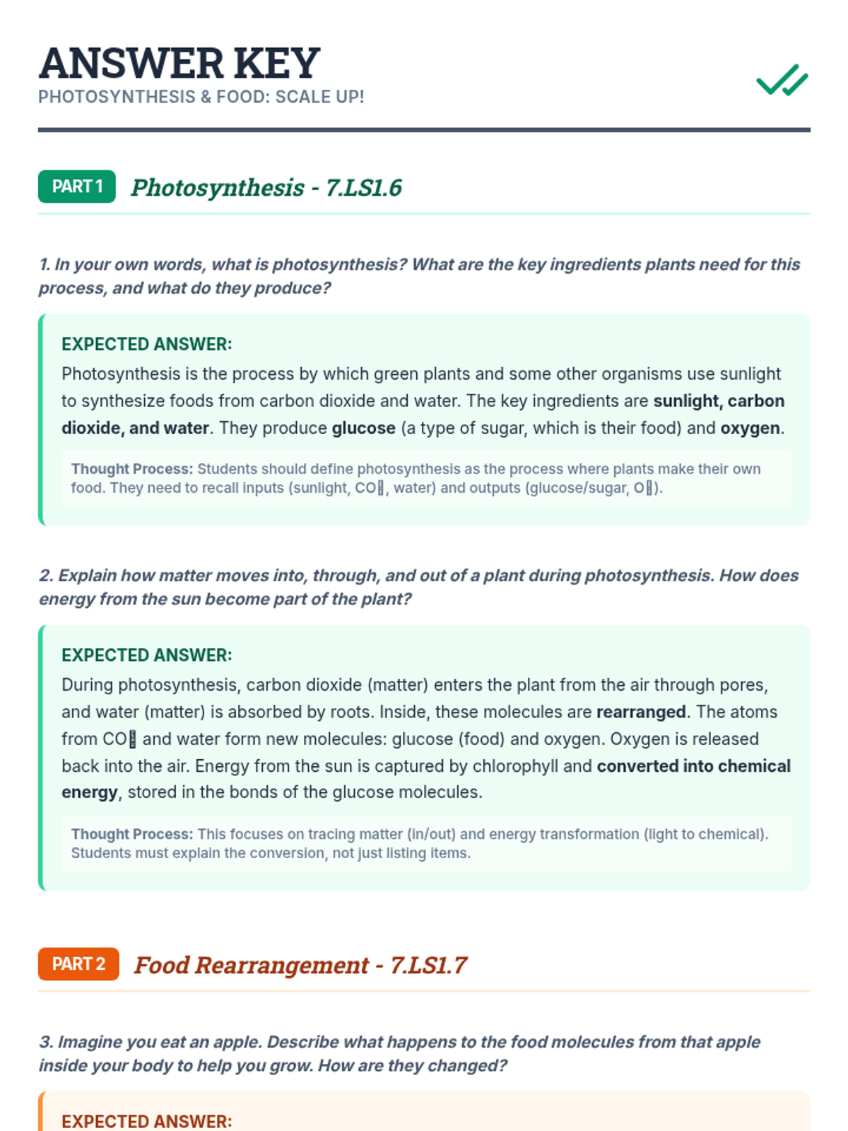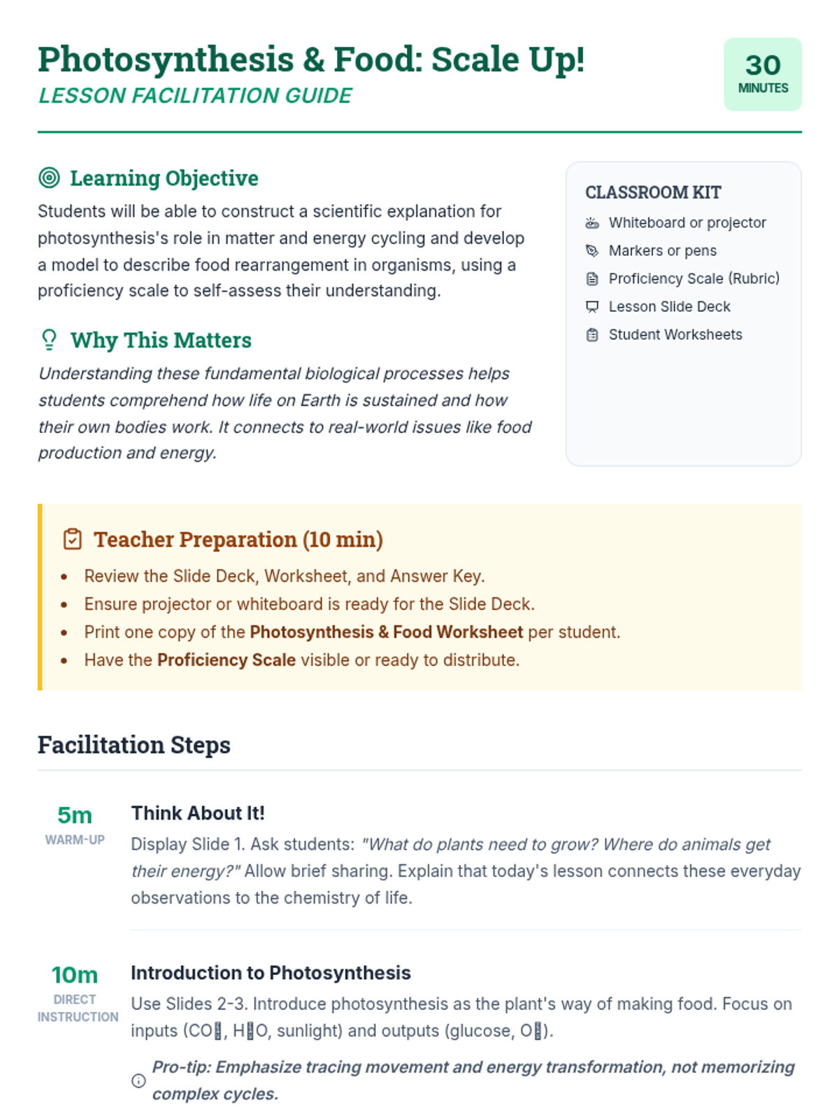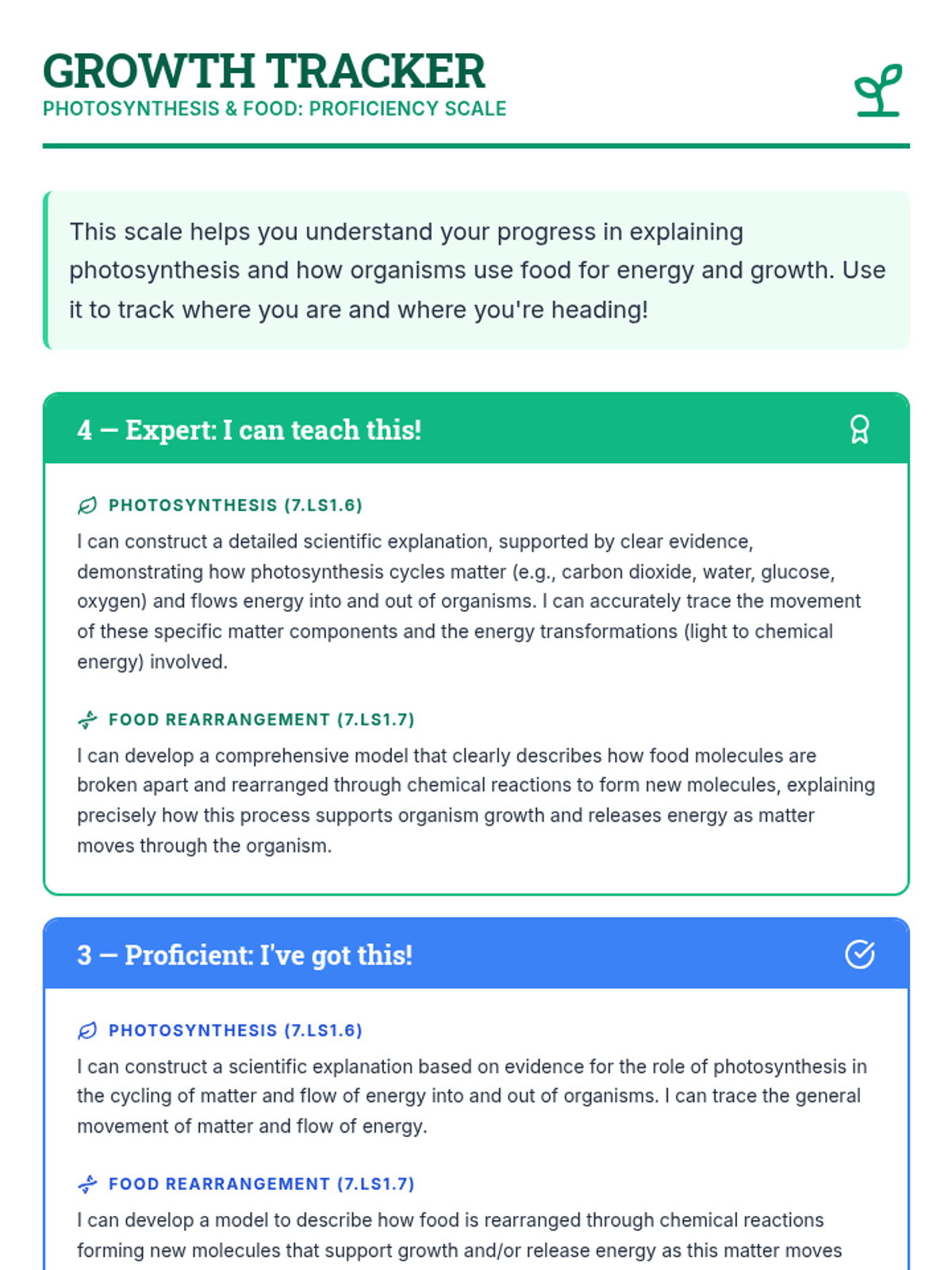 A single-session lesson for 7th Grade Life Science that explores how photosynthesis cycles matter and energy, and how organisms rearrange food molecules for growth and energy. Students use a proficiency scale to self-assess their understanding of biological chemical reactions.