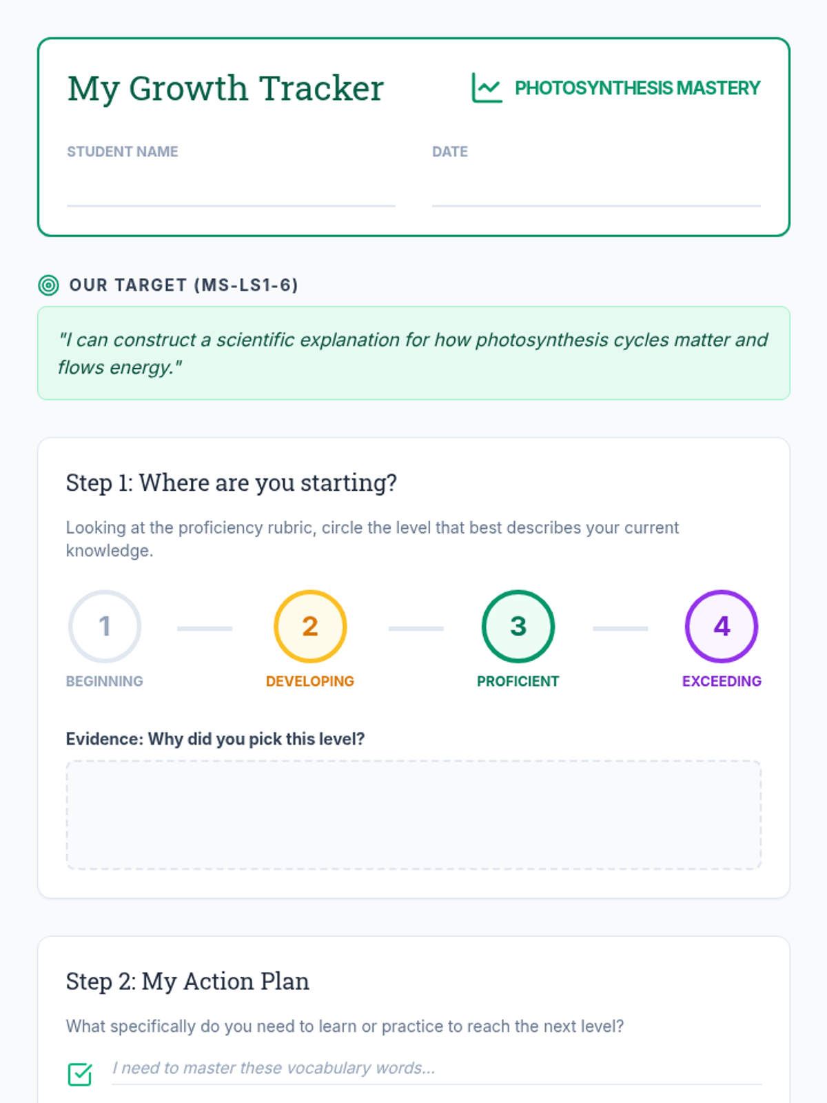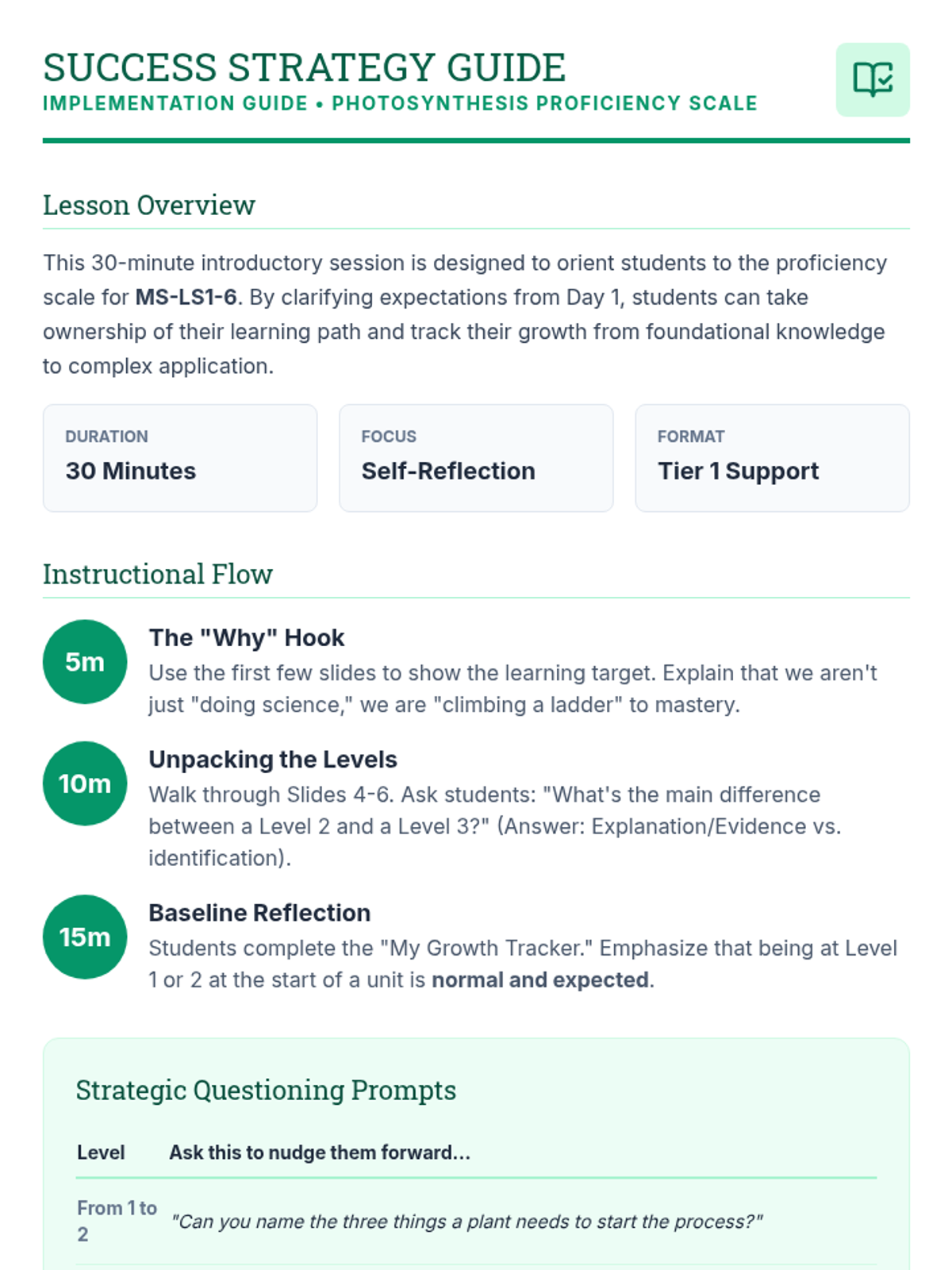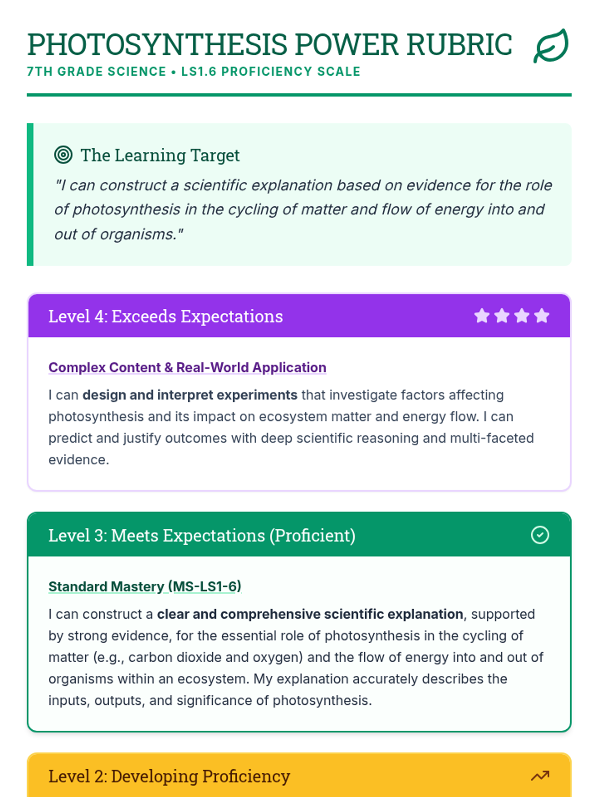 A 30-minute session introducing 7th-grade students to the photosynthesis proficiency scale. Students will unpack the learning targets, identify their current level, and understand the path to mastery in matter and energy cycling.