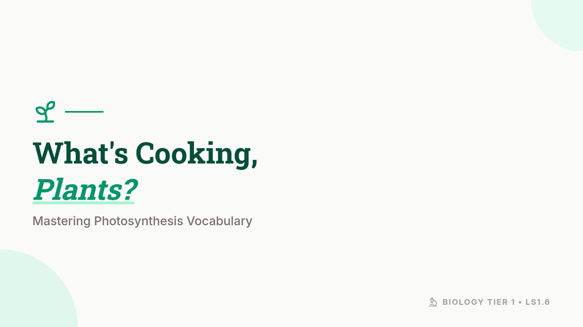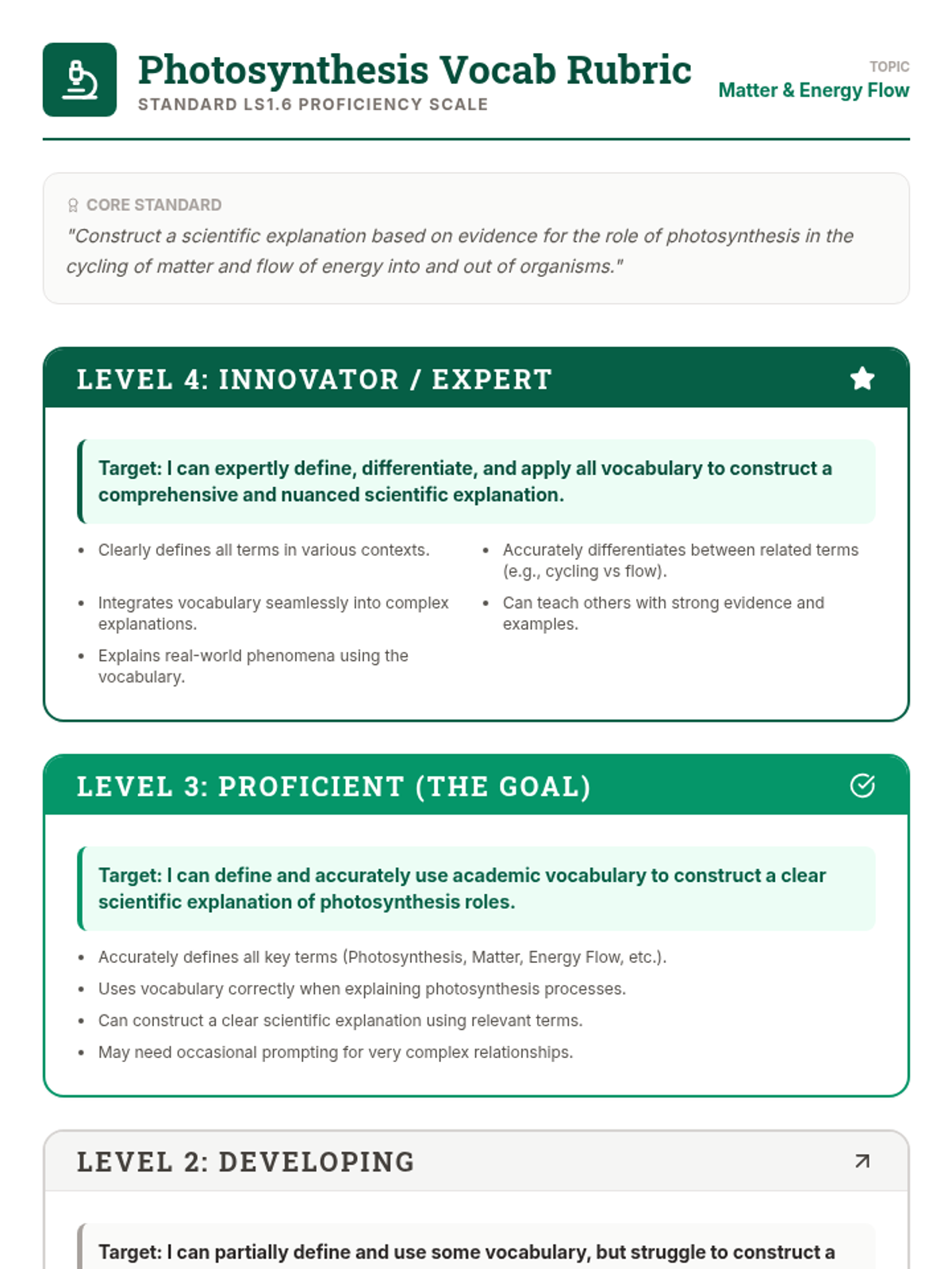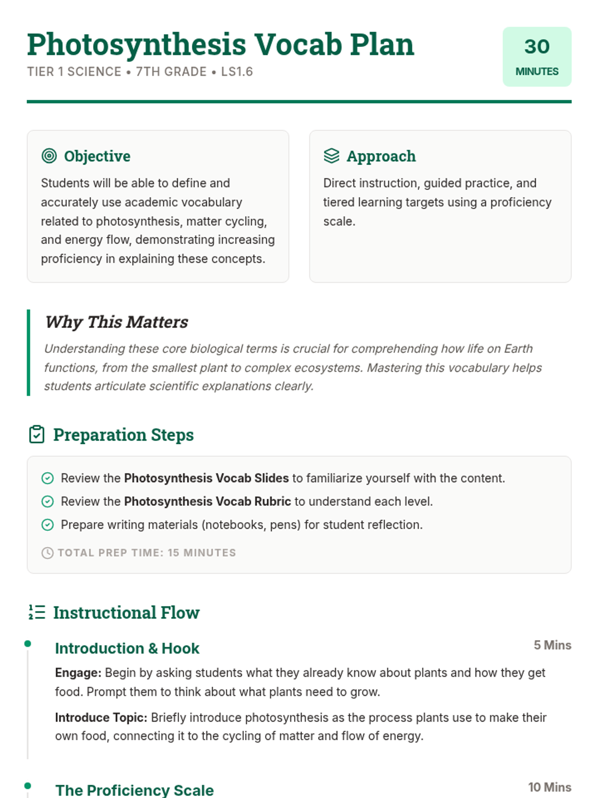 This lesson provides a proficiency scale and learning targets for 7th-grade students to master academic vocabulary related to photosynthesis, matter cycling, and energy flow (LS1.6). It is designed as a Tier 1, 30-minute introductory session.