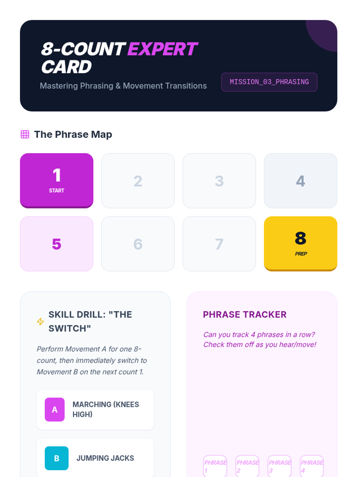 Students learn to identify musical phrases, specifically the 8-count structure, and practice initiating movements on count 1.