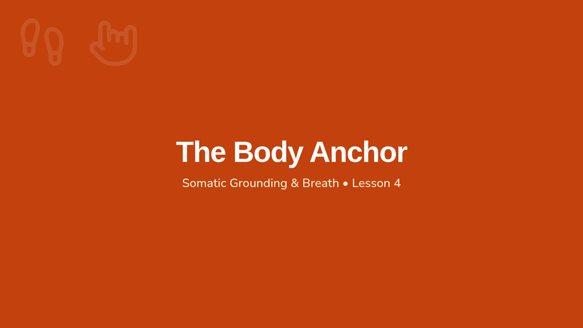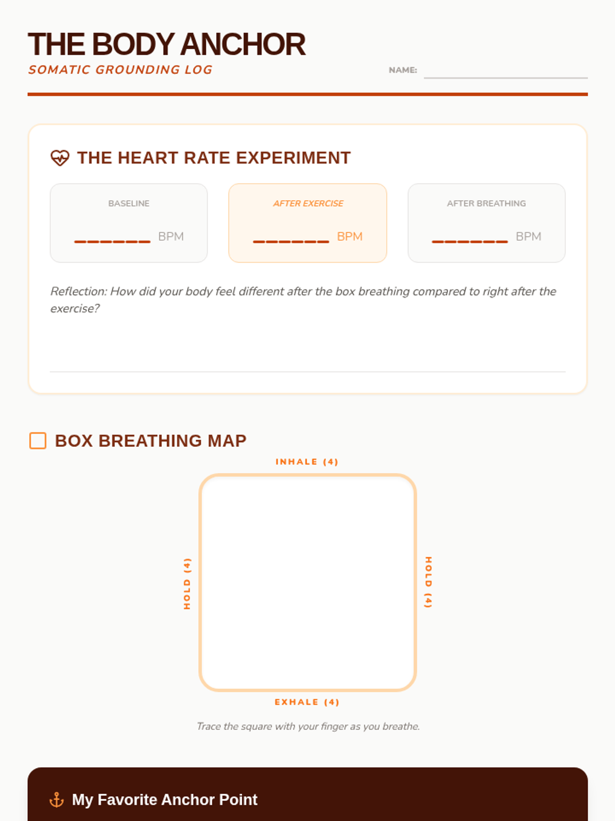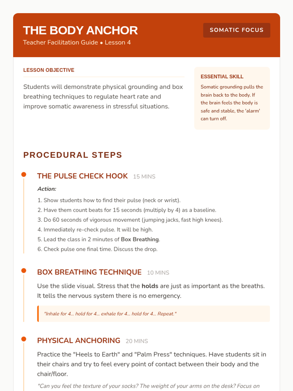 The focus shifts to somatic techniques, including 'box breathing' and physical anchoring (feeling feet on the floor, pressing palms together). Students practice these techniques while seated to simulate discreet usage during class. They analyze the immediate physical effect of changing their breathing pattern.