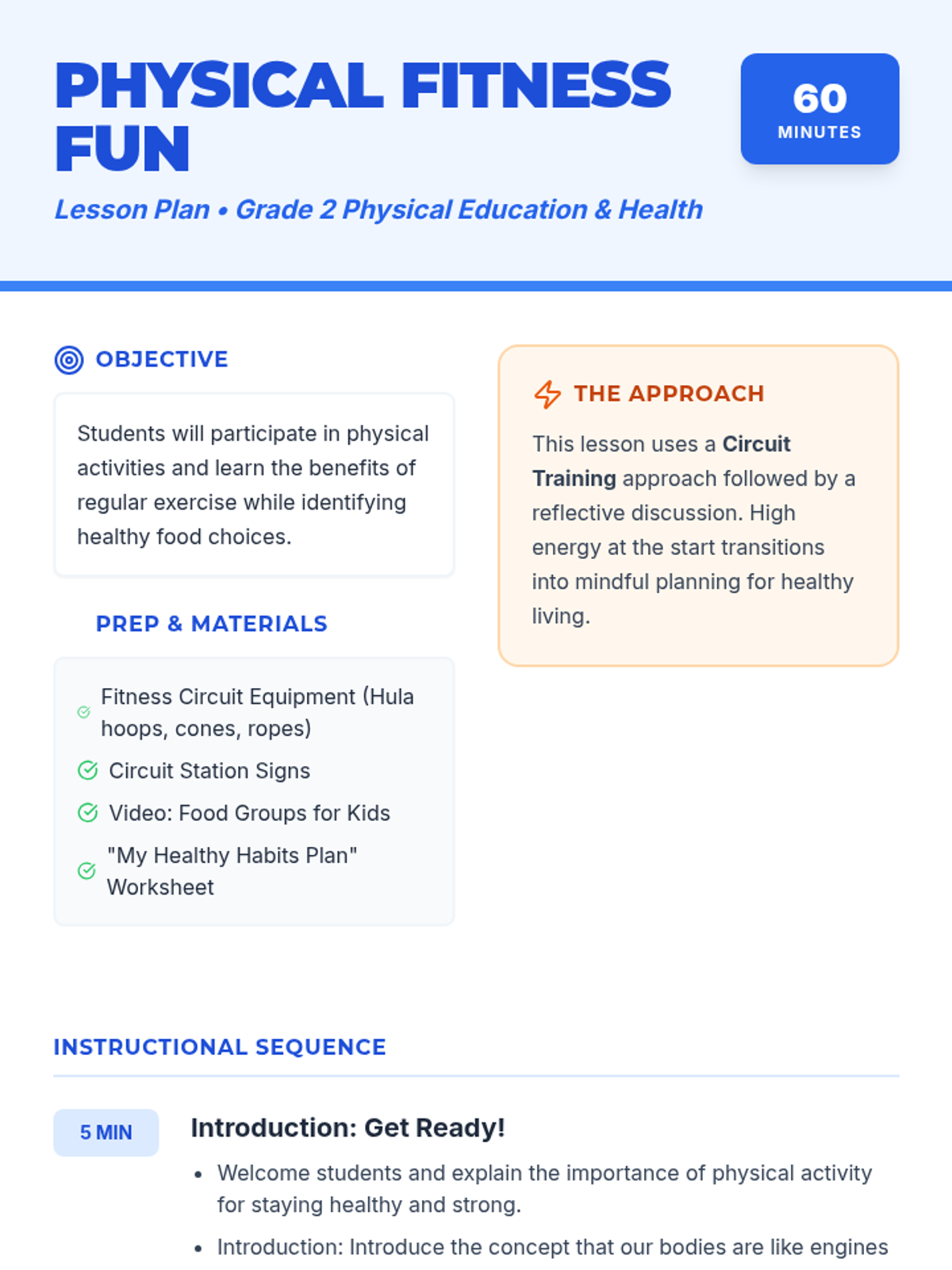 A high-energy lesson for Grade 2 students focusing on physical activity through a circuit and learning about the five food groups and healthy habits.