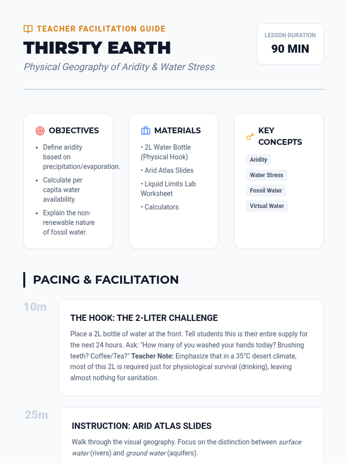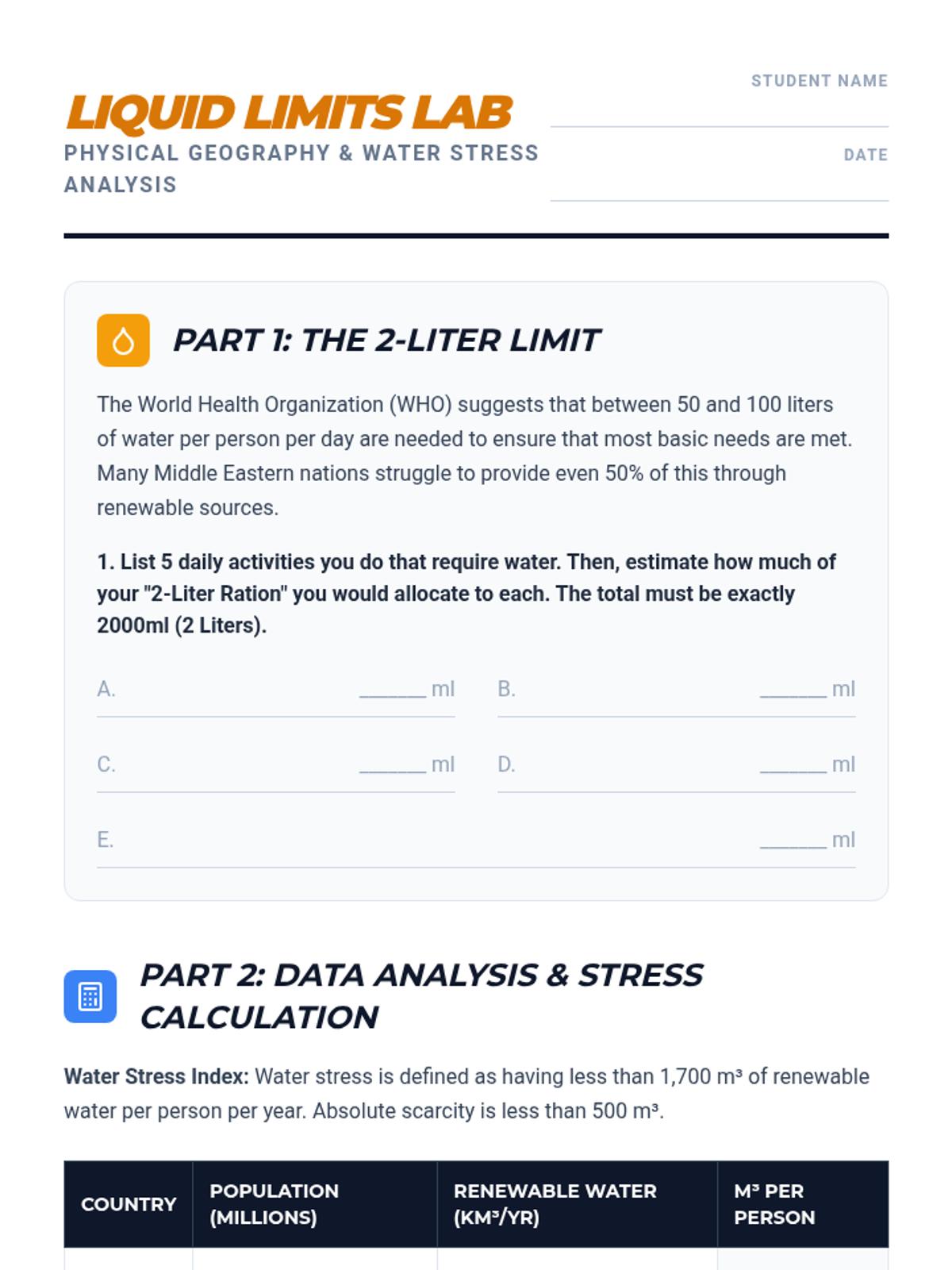 Students examine climate data and physical maps to define the distinct arid and semi-arid zones of the Middle East, calculating water stress levels and exploring aquifer depletion.
