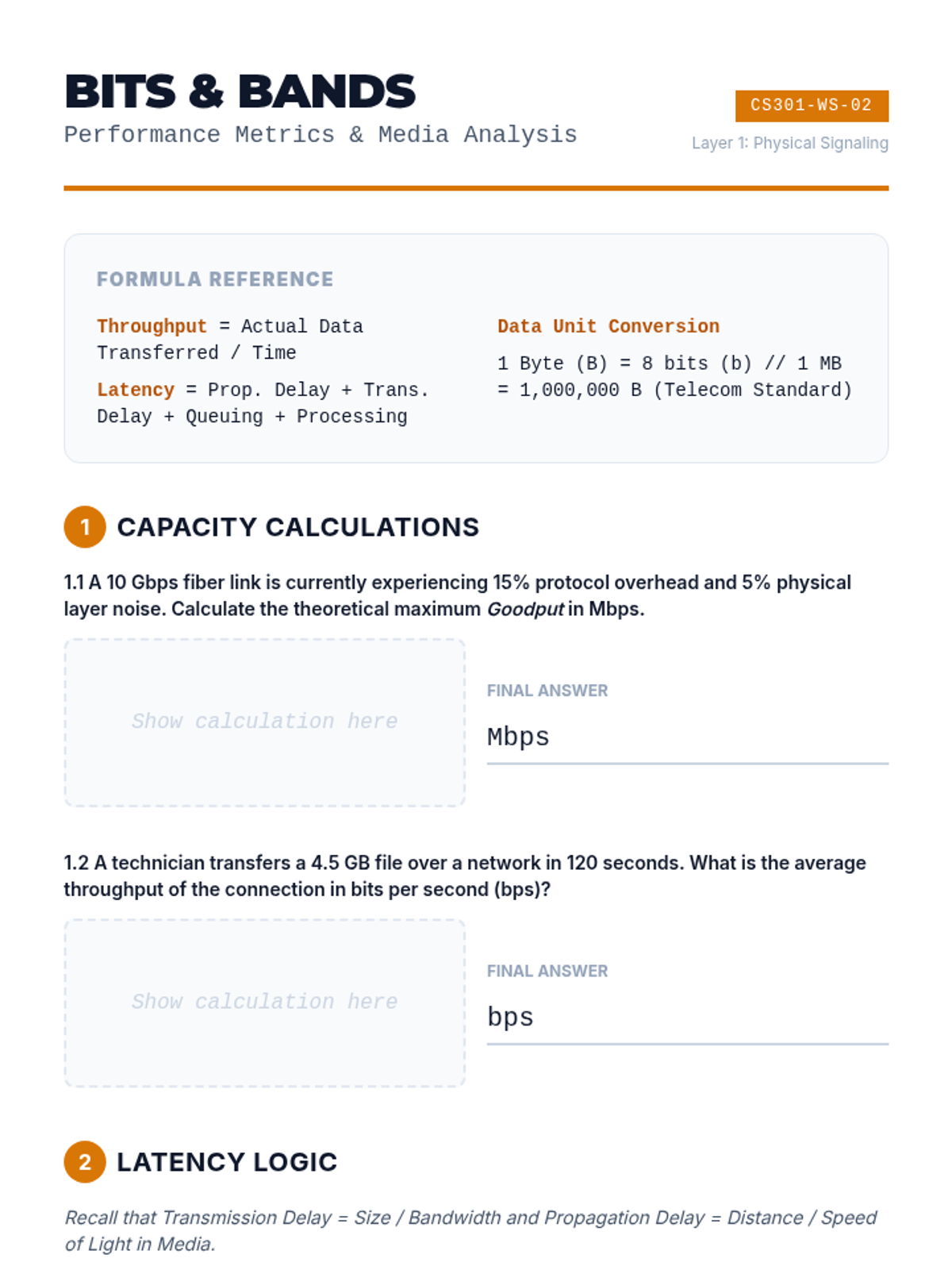 An examination of the physical layer, covering transmission media and signal encoding, with a focus on calculating bandwidth, throughput, and latency.
