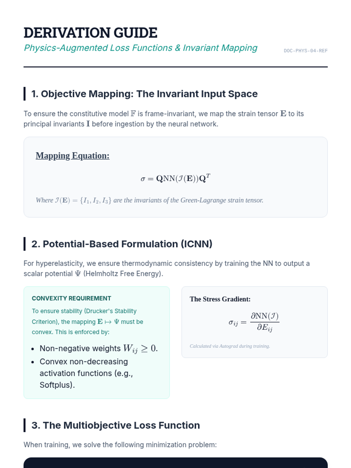 Embed physical principles like frame invariance and thermodynamic consistency into neural network architectures via custom loss functions and constraints.