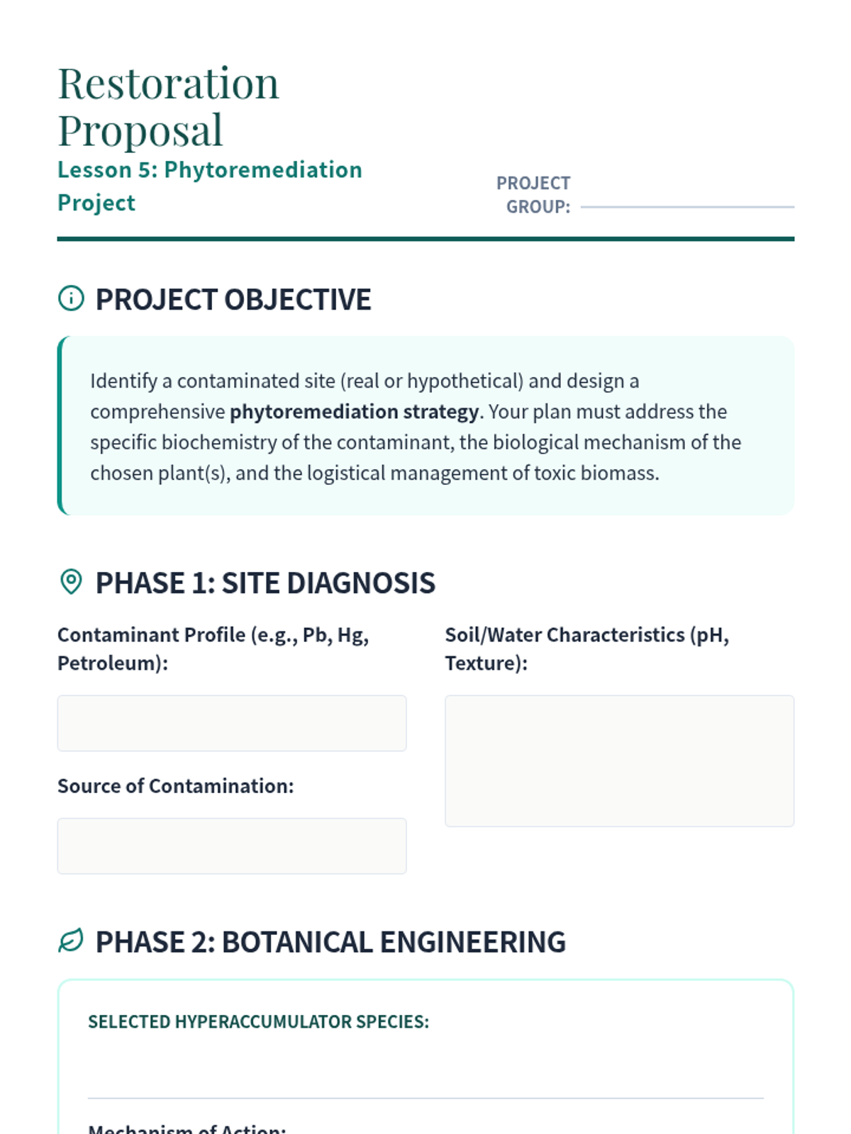 Students research hyperaccumulator plants and develop a phytoremediation proposal to restore a contaminated local industrial site.