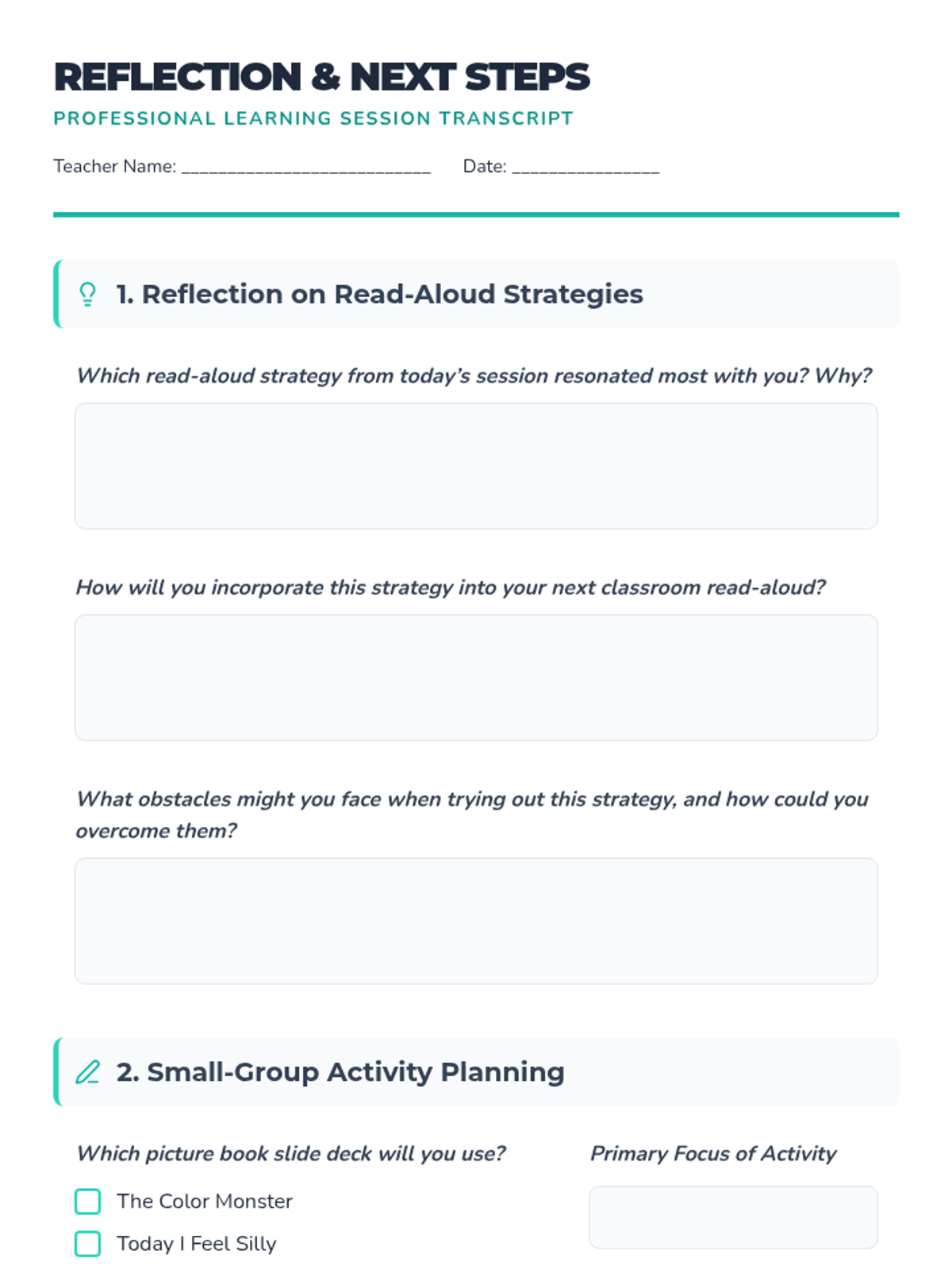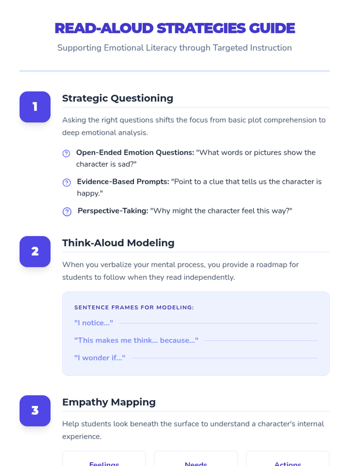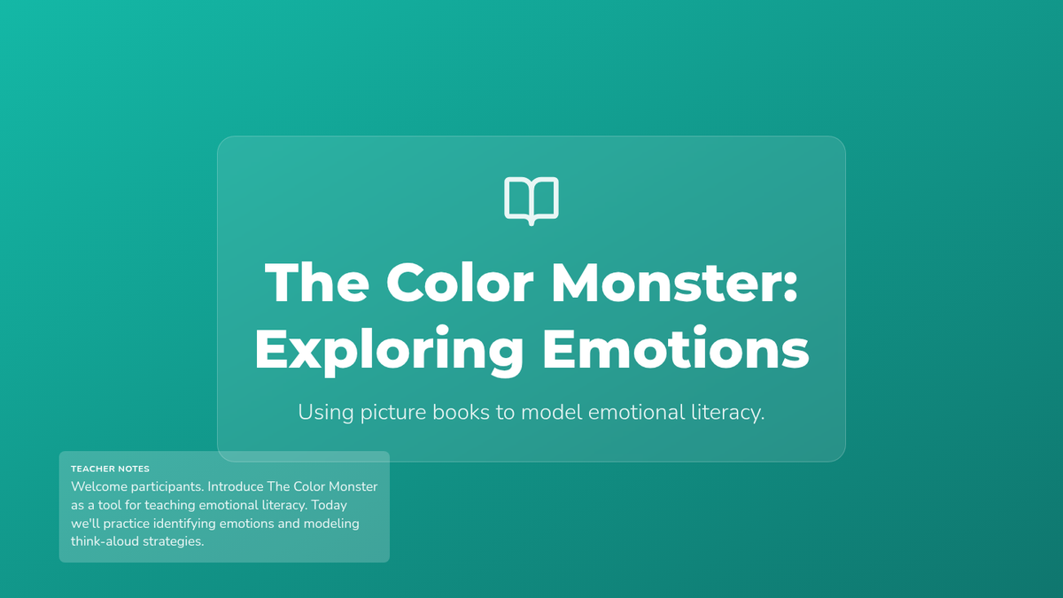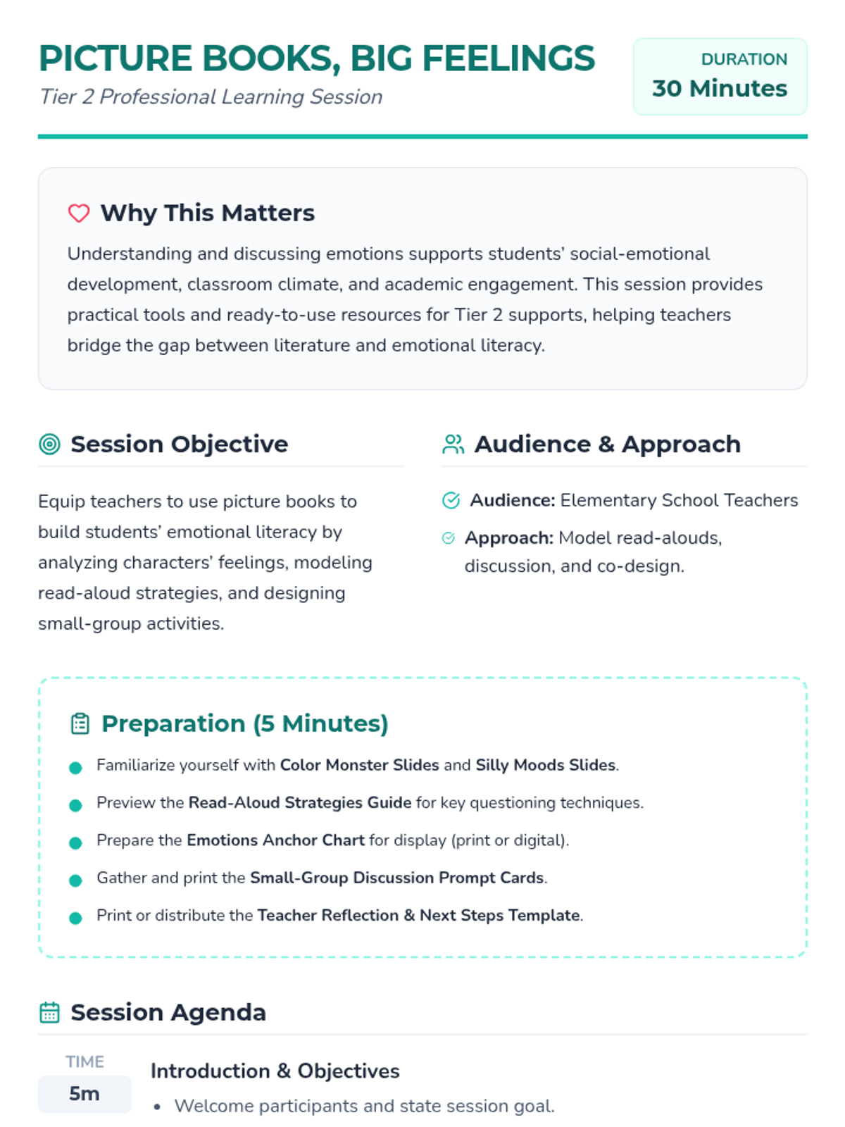 A 30-minute Tier 2 professional learning session for teachers focused on using picture books to build students' emotional literacy through modeled read-alouds and targeted small-group activities.