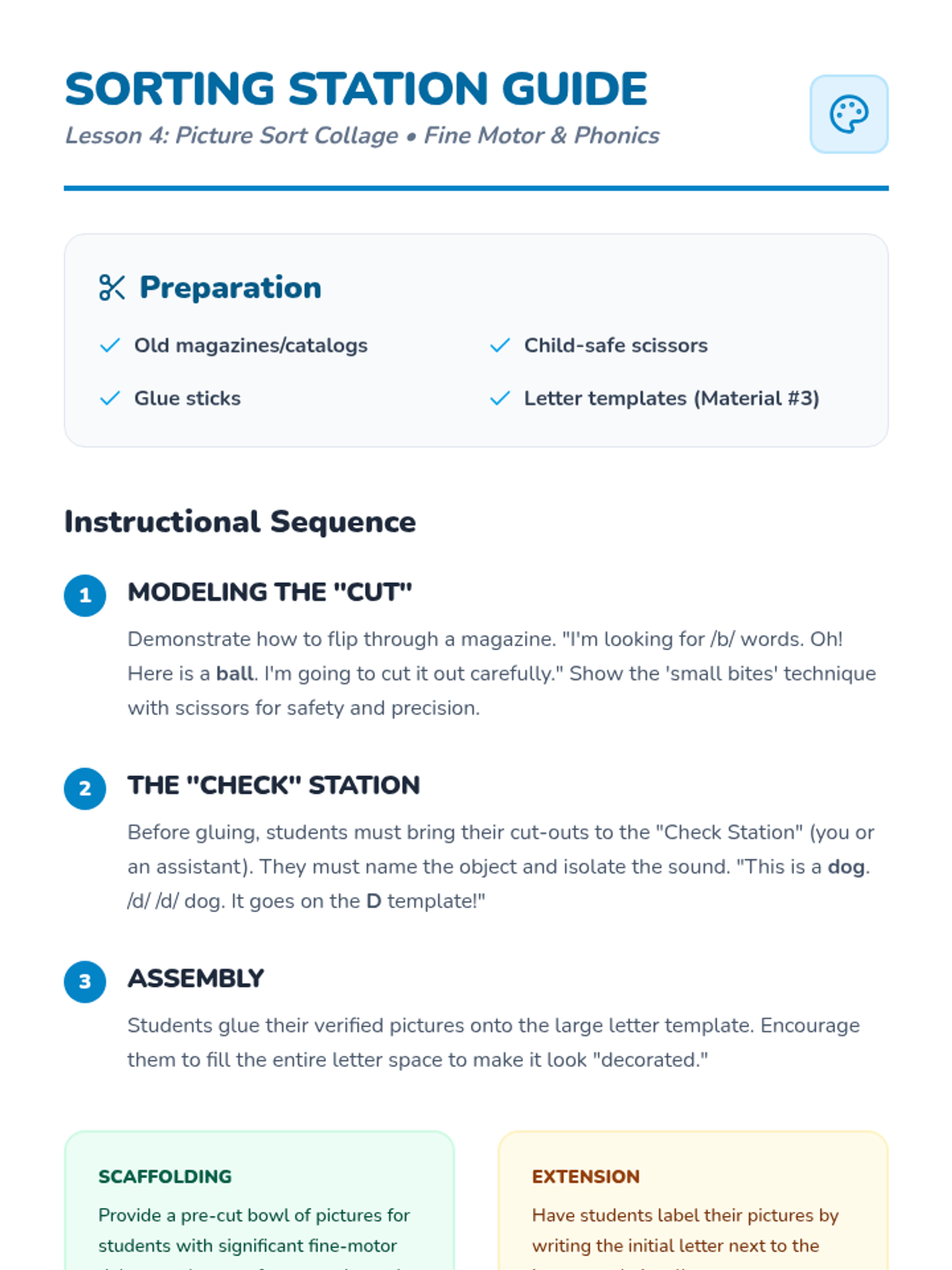 Students identify initial sounds in images and sort them onto large letter templates, developing fine motor skills and sound recognition.