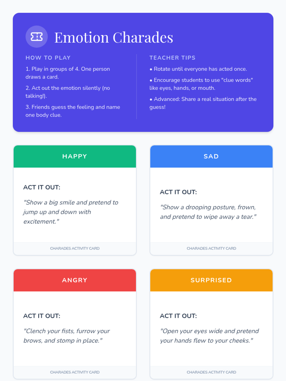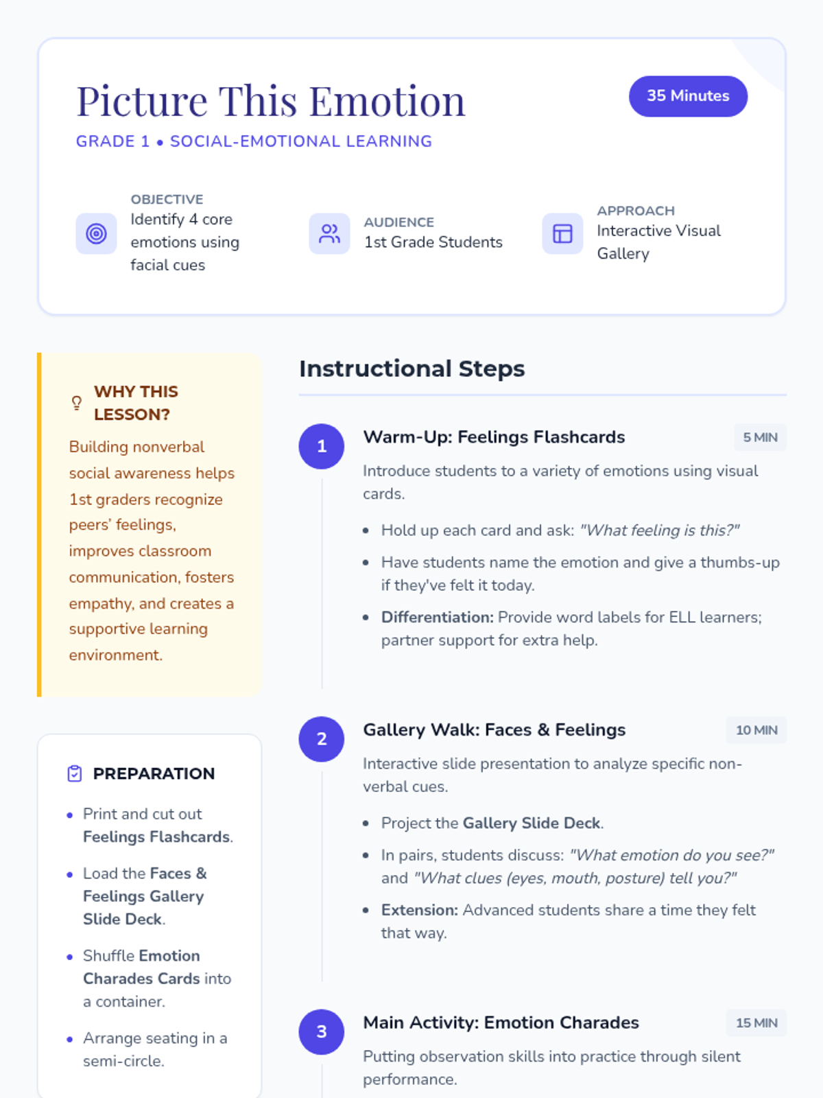 A 35-minute Grade 1 lesson focused on identifying emotions through facial expressions and body language to build empathy and communication skills.