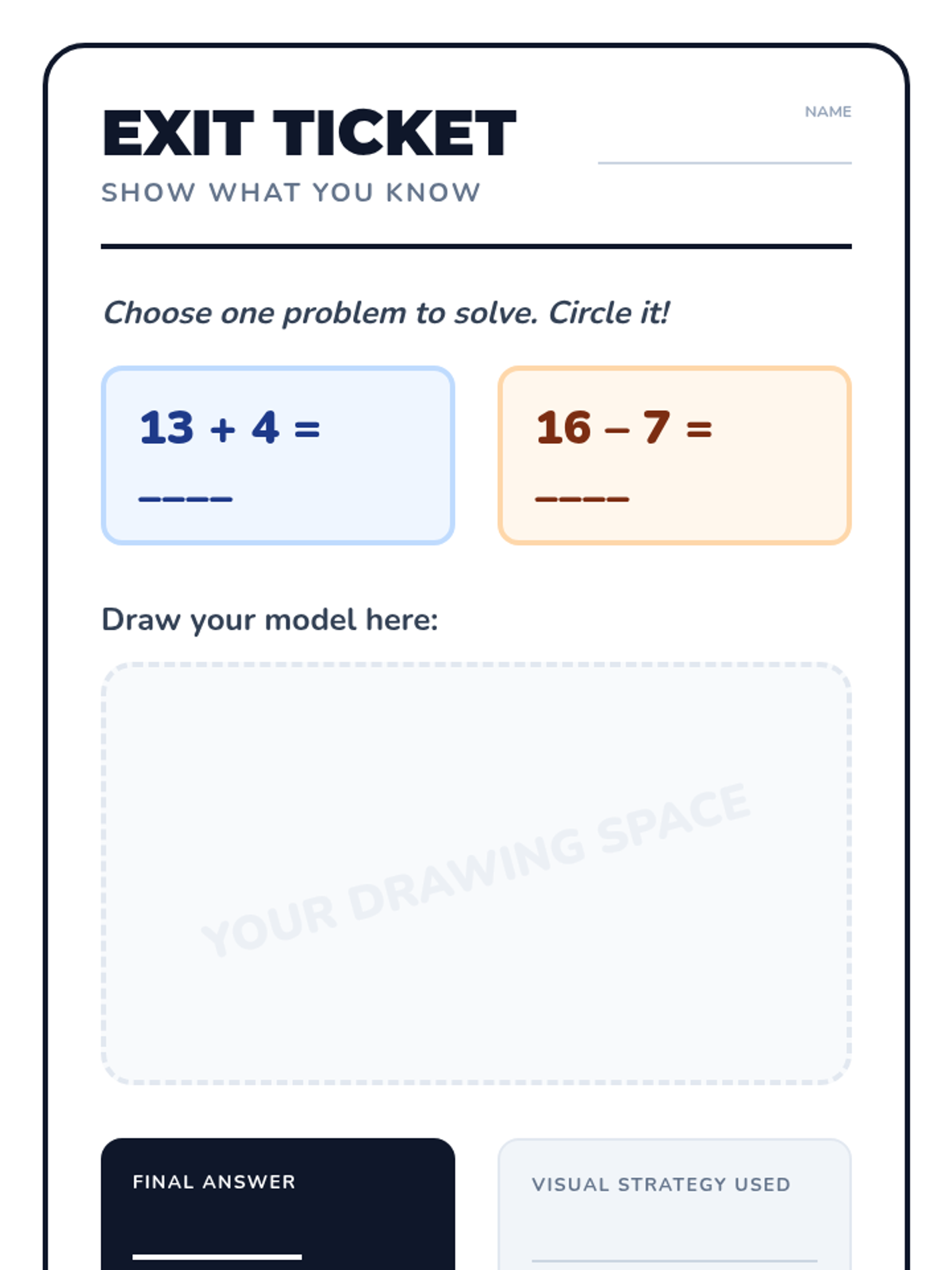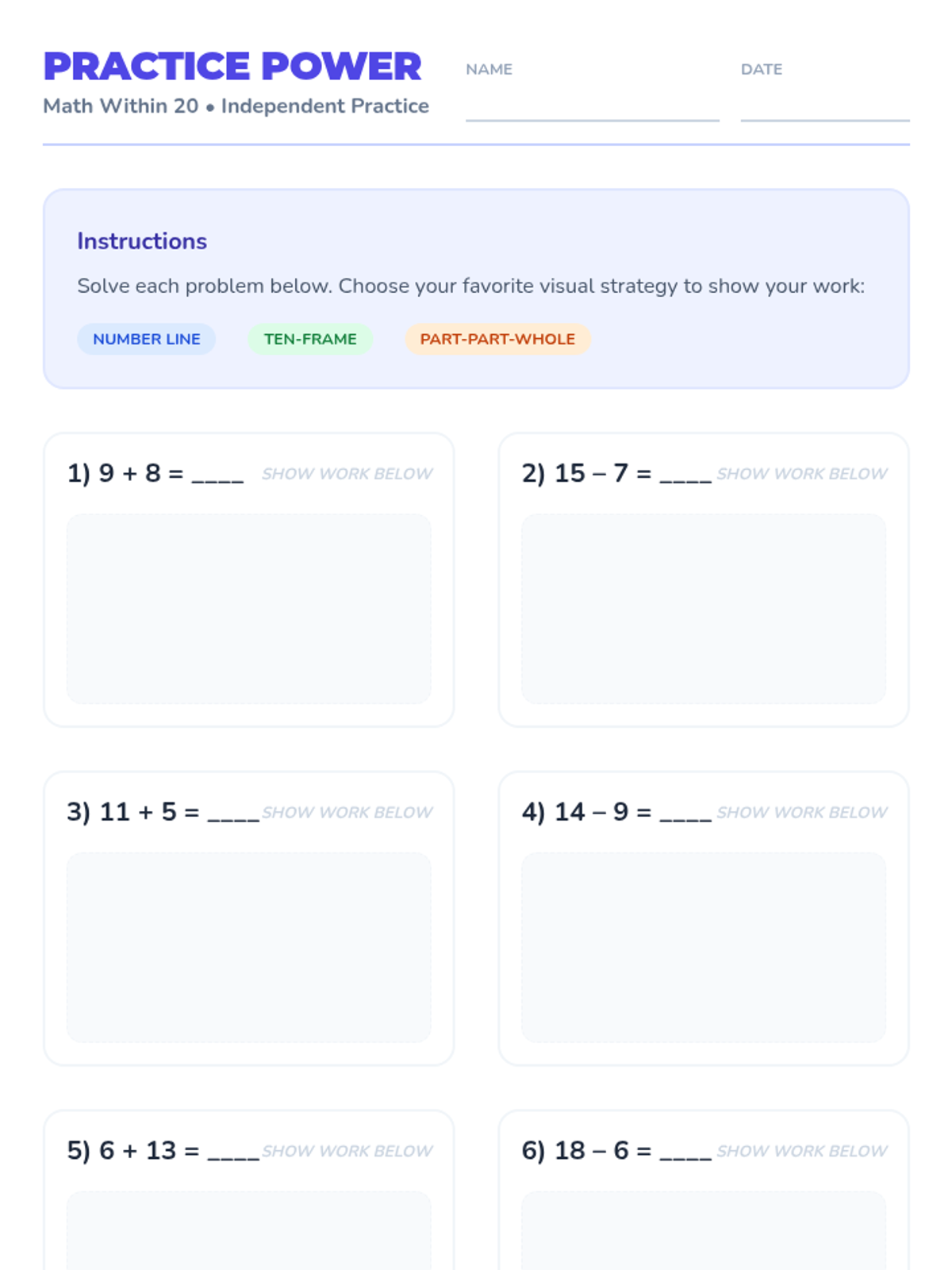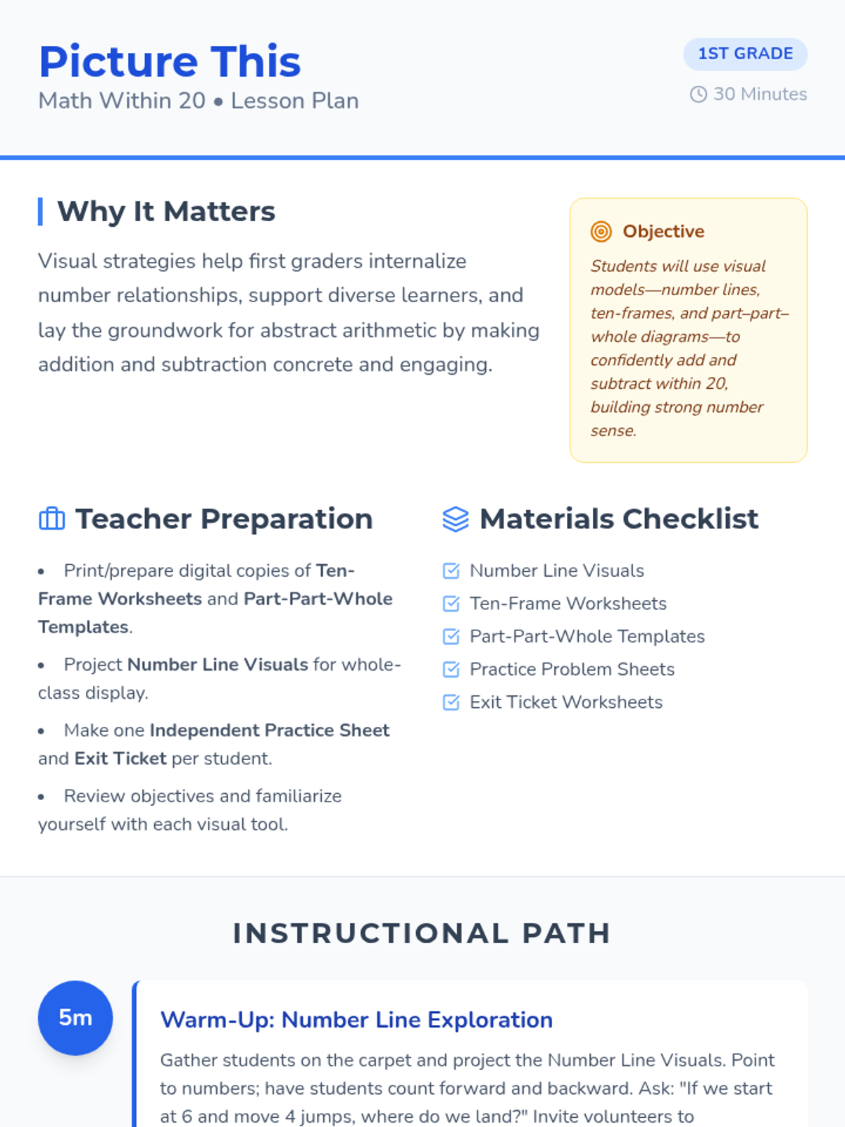 In this 30-minute first-grade lesson, students explore visual strategies including number lines, ten-frames, and part-part-whole diagrams to add and subtract within 20. These concrete methods build the number sense necessary for abstract arithmetic.