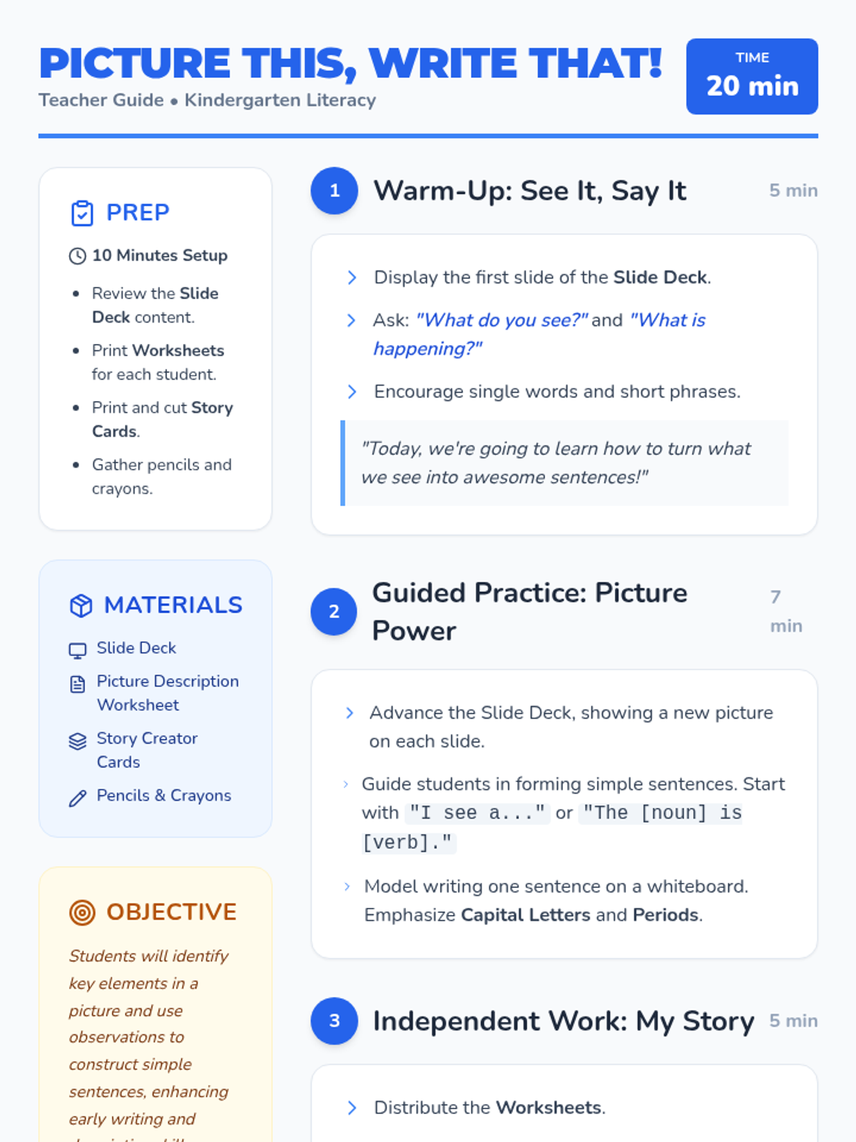 A 20-minute Kindergarten lesson that teaches students to translate visual observations into simple written sentences through guided practice and creative drawing.