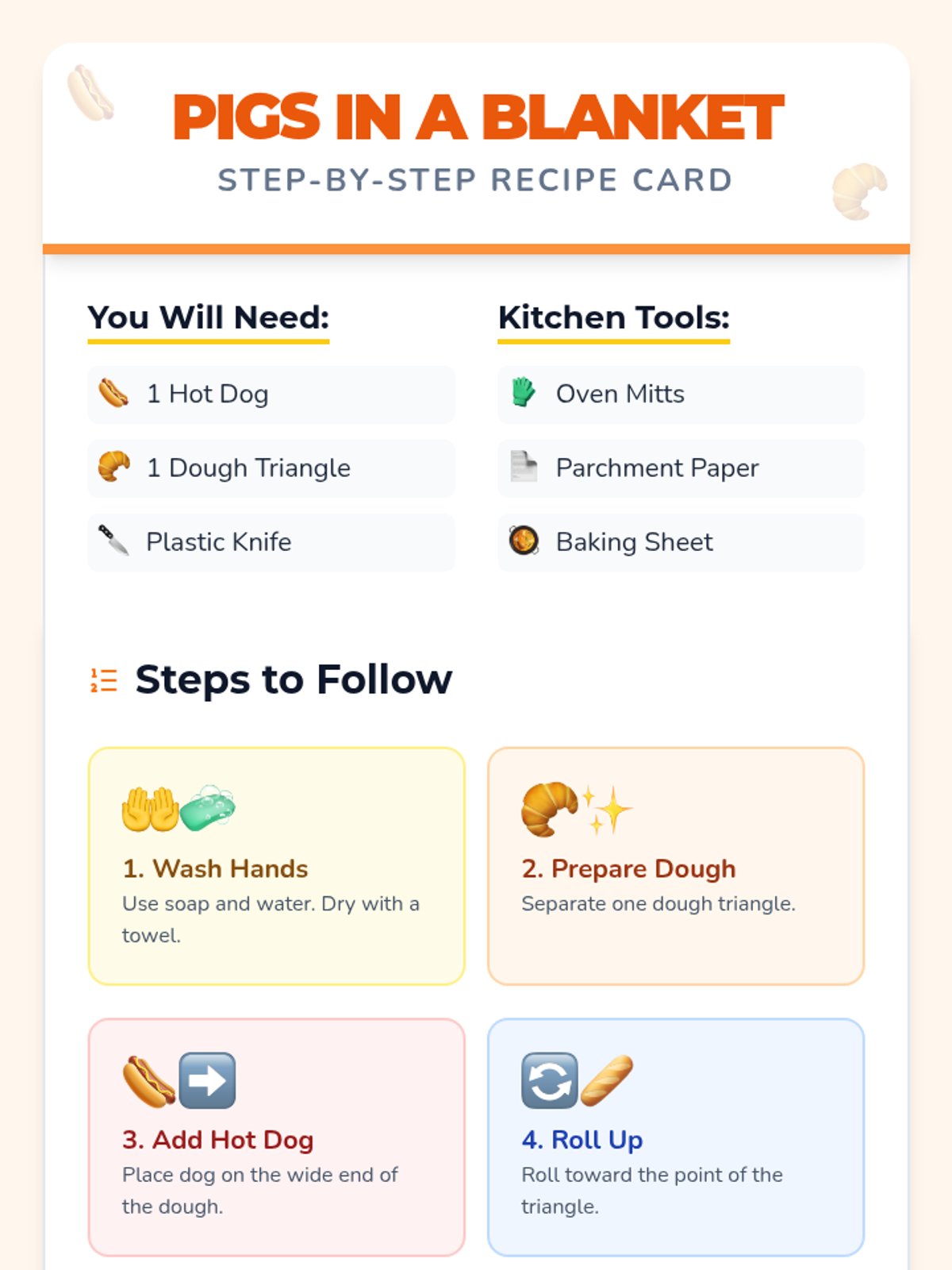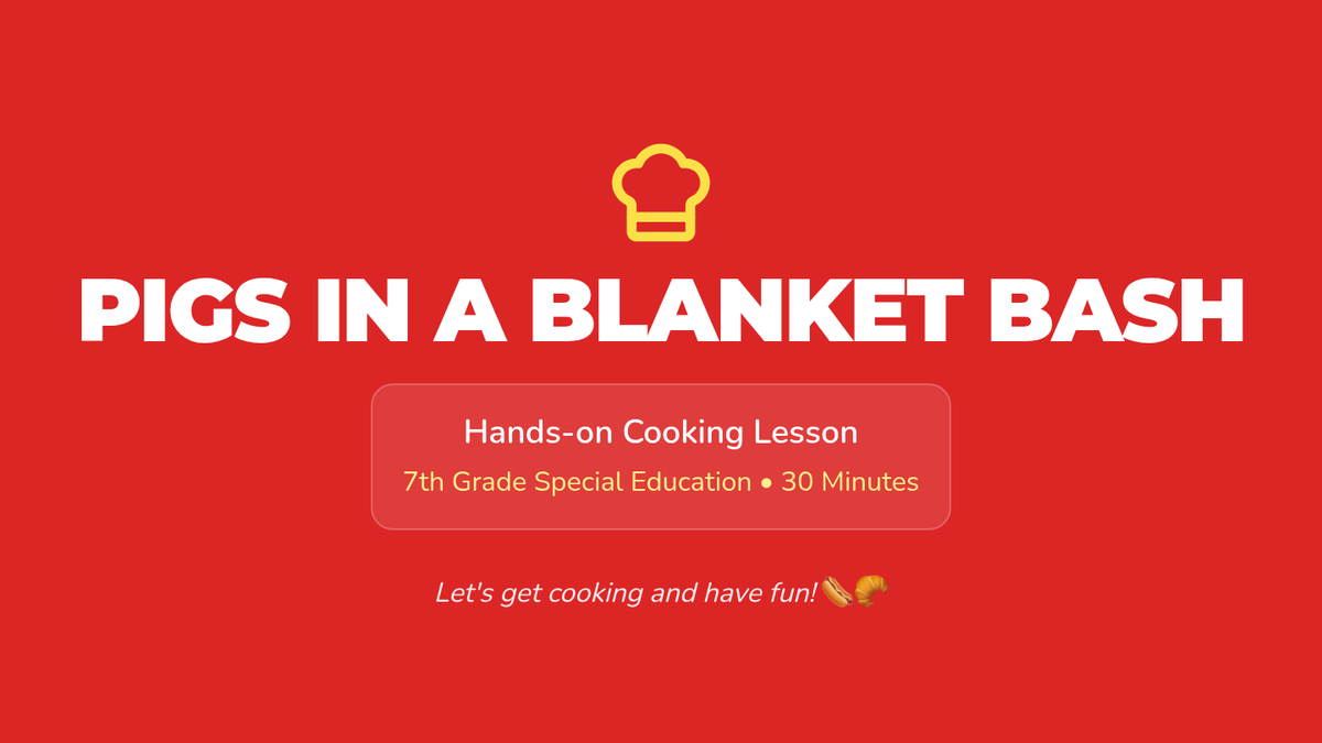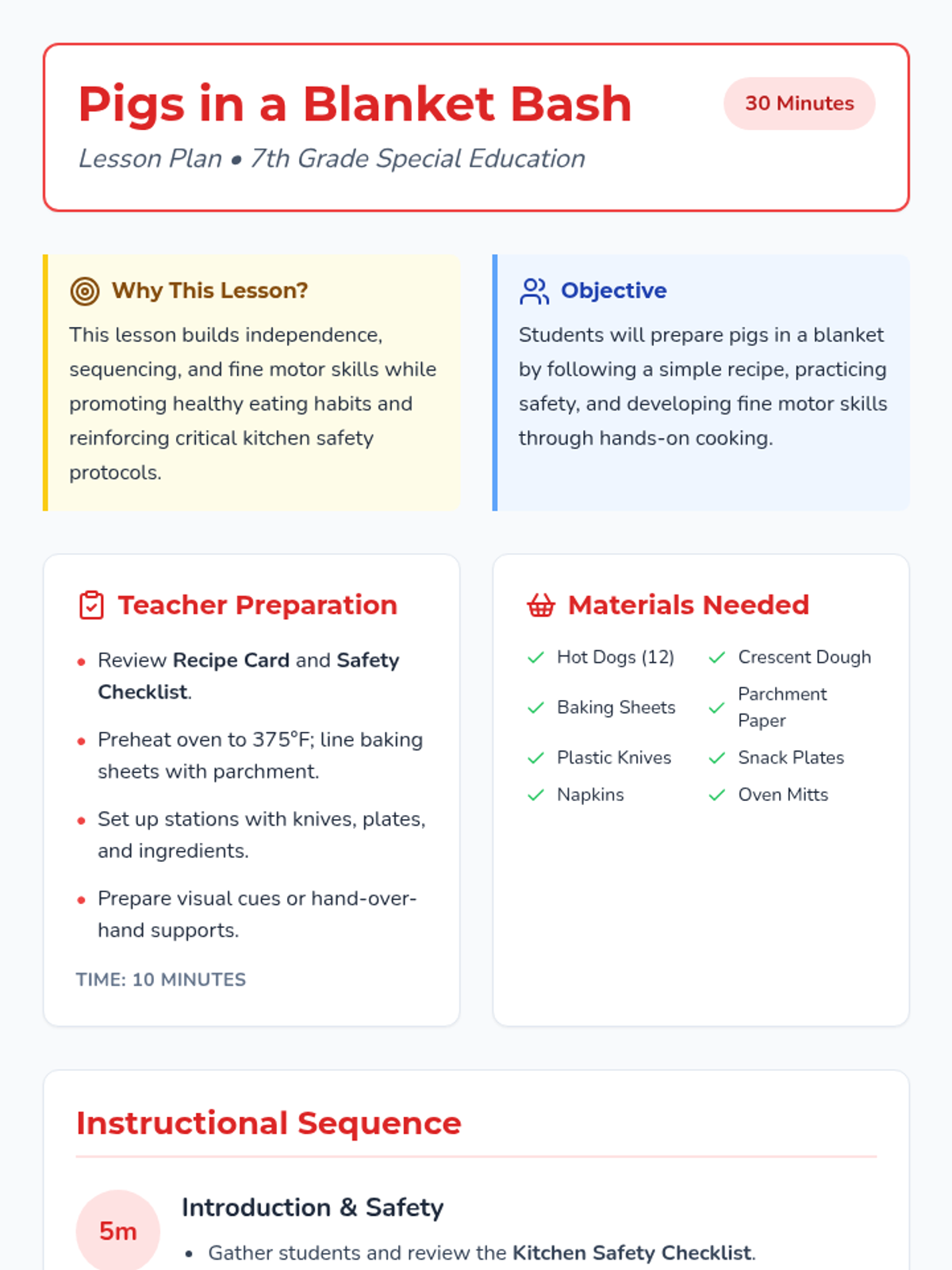 A hands-on cooking lesson for 7th-grade special education students focusing on kitchen safety, sequencing, and fine motor skills through making pigs in a blanket.