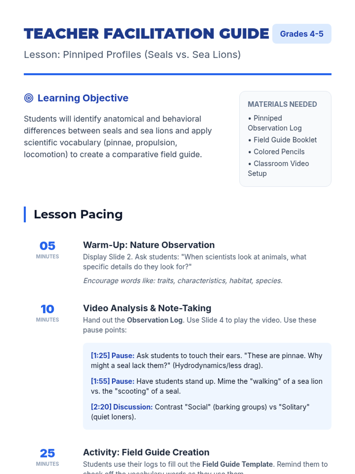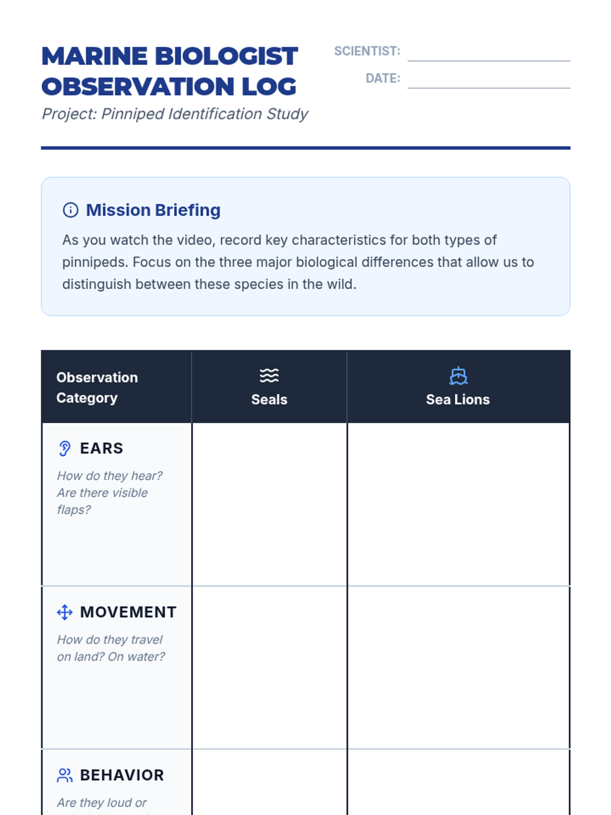 Students become marine biologists, observing the differences between seals and sea lions through video analysis and scientific vocabulary. They apply their knowledge by creating a comparative field guide entry using terms like pinnae, propulsion, and locomotion.