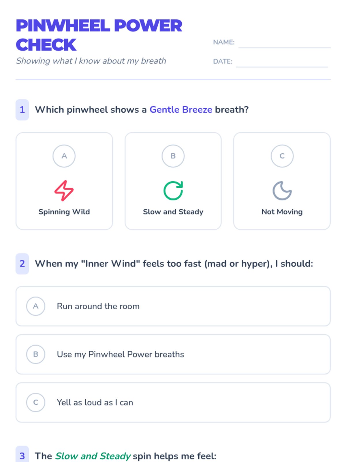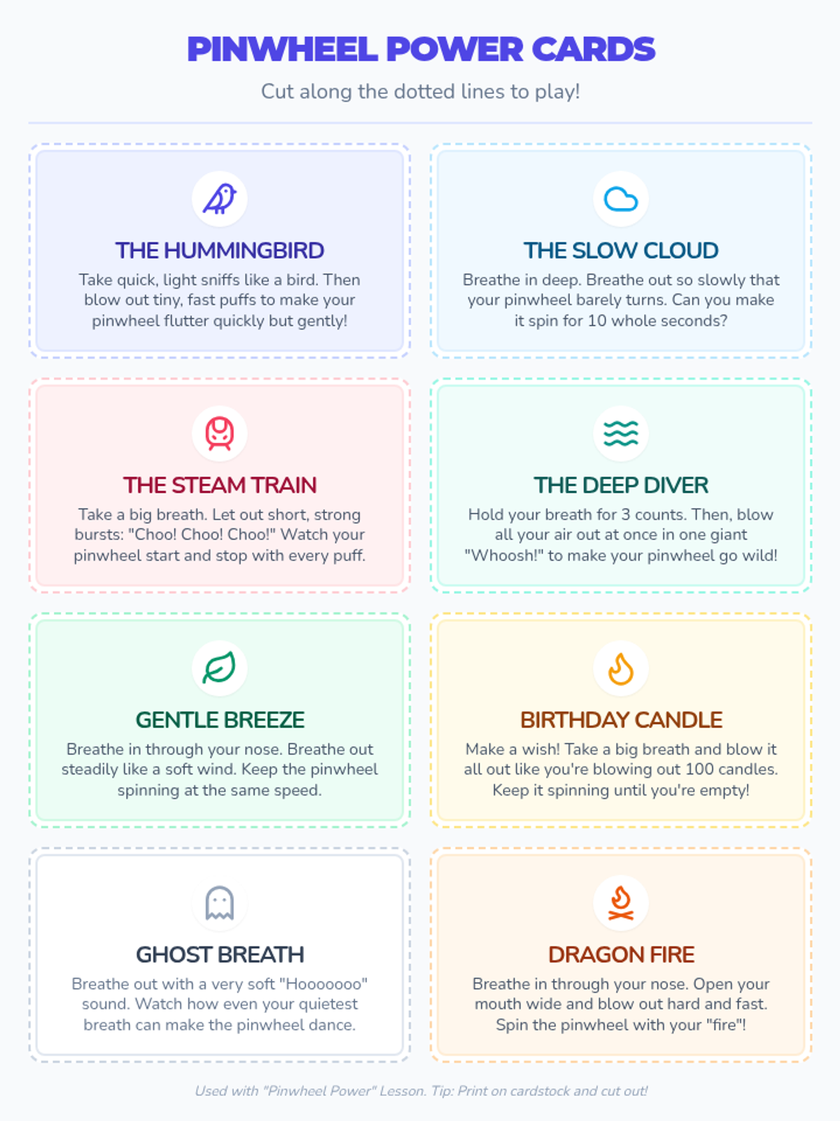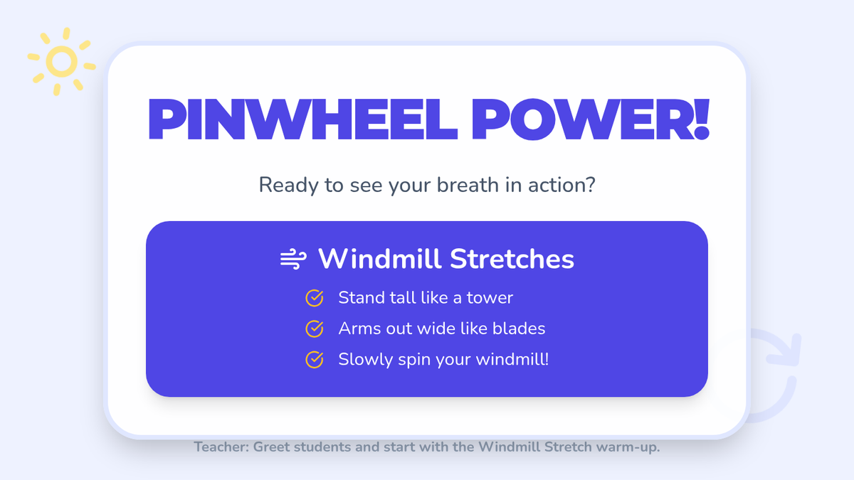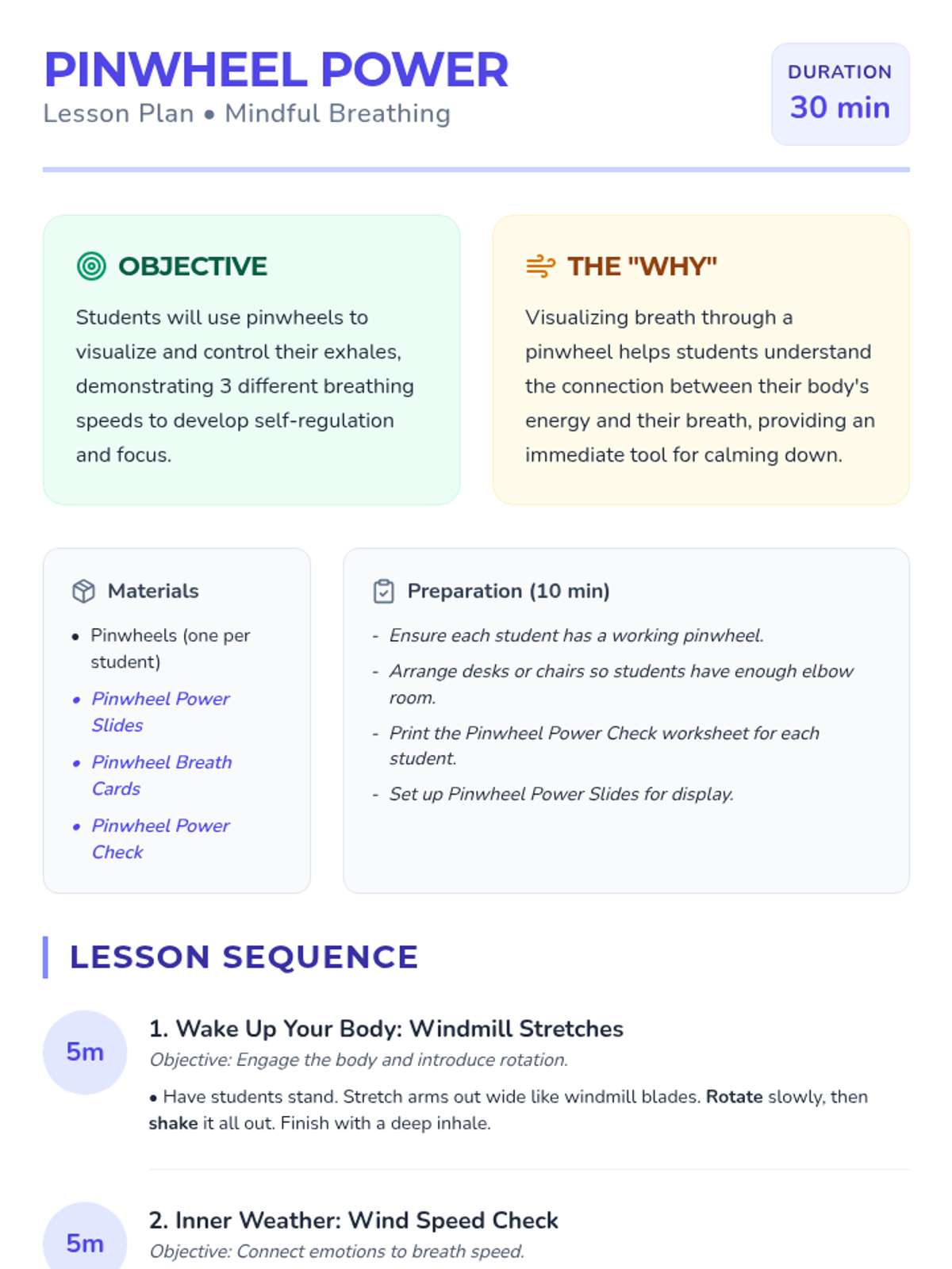 A mindful breathing lesson for 2nd graders using pinwheels. This lesson focuses on sitting or standing breathing techniques and uses the pinwheel to visualize the strength and duration of the exhale.