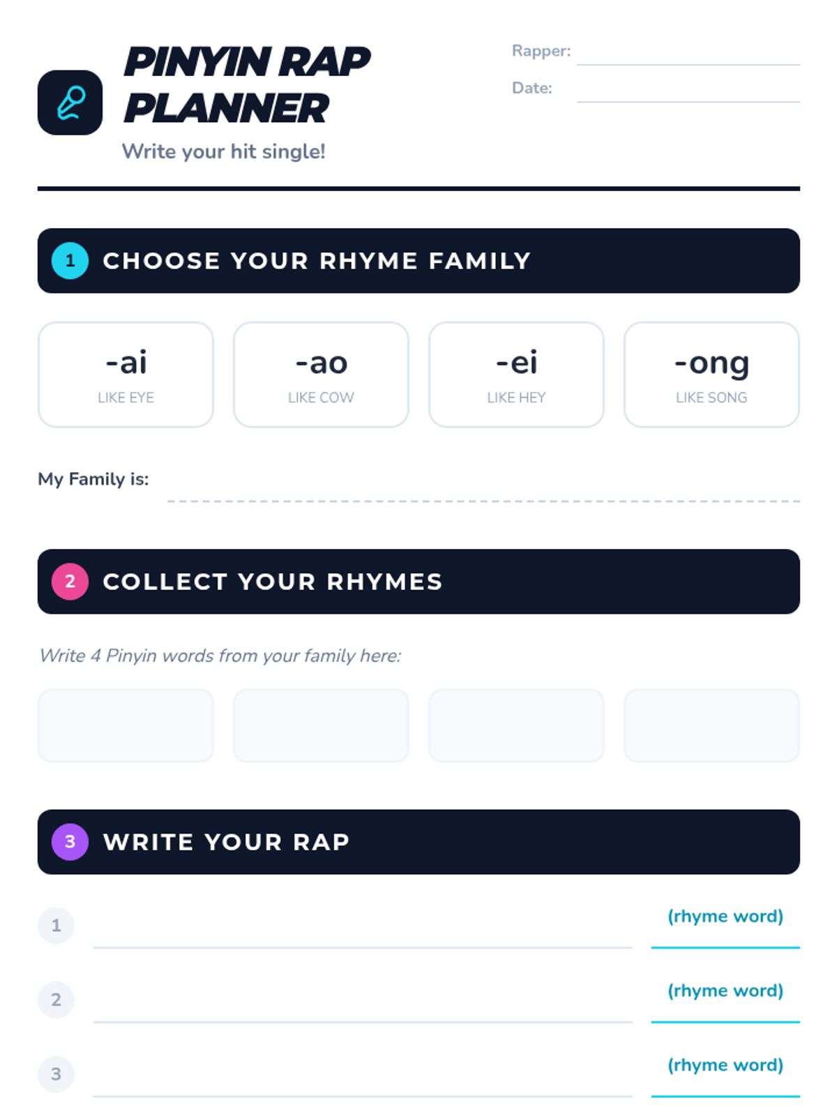 Students apply their knowledge of Pinyin rhymes to compose and perform a short 4-line chant. They focus on maintaining a steady beat while clearly articulating their chosen rhyme family.