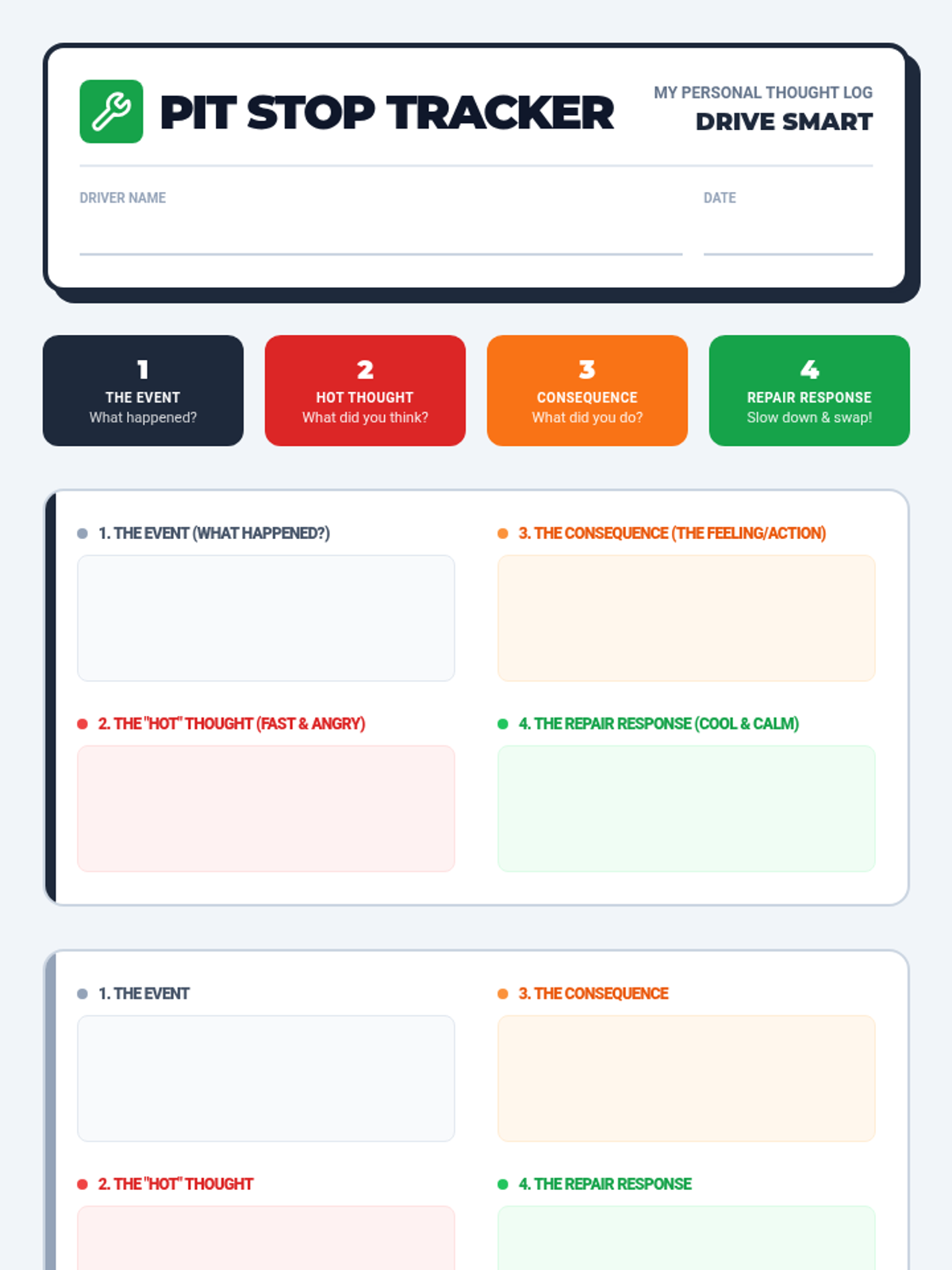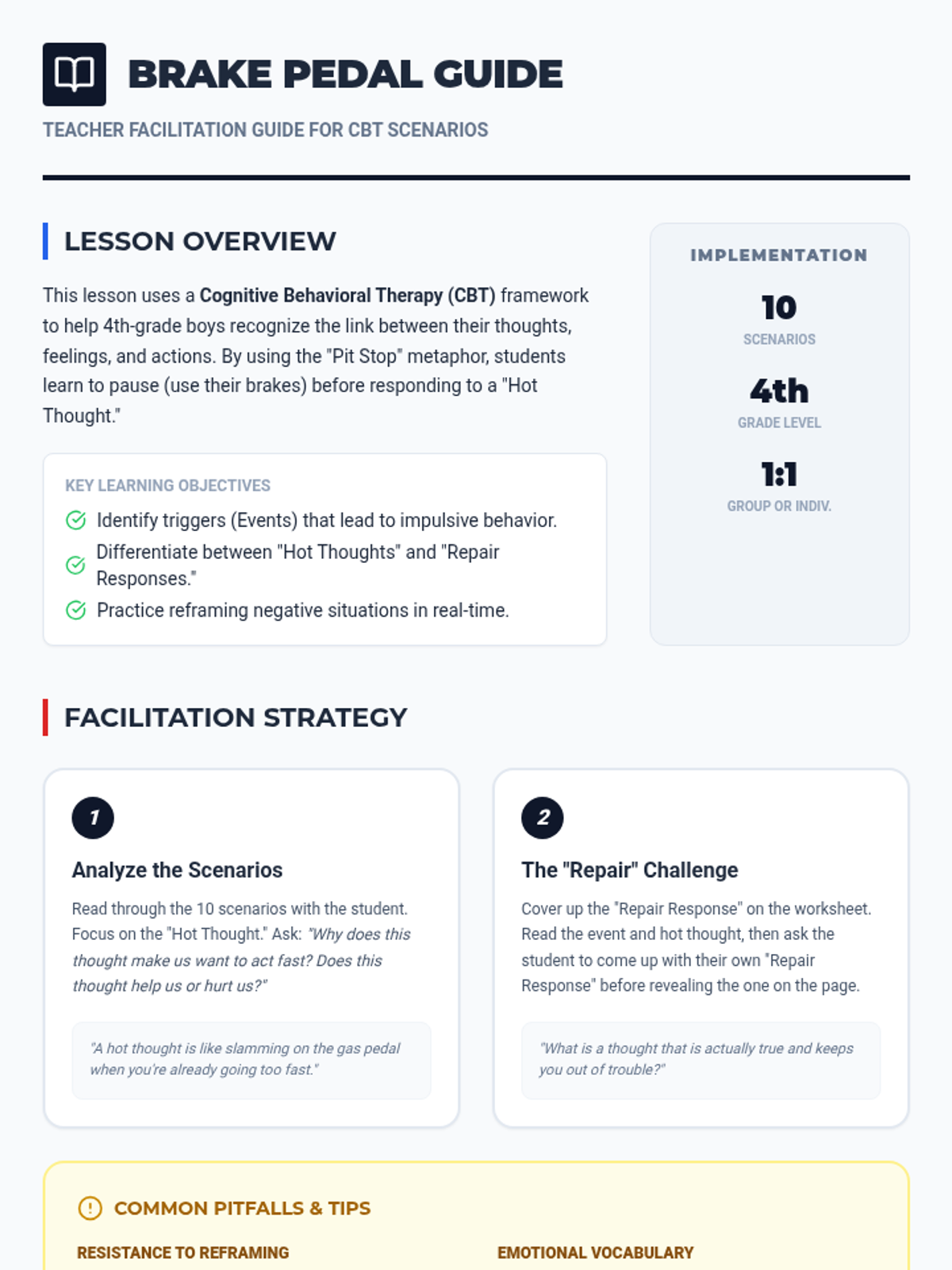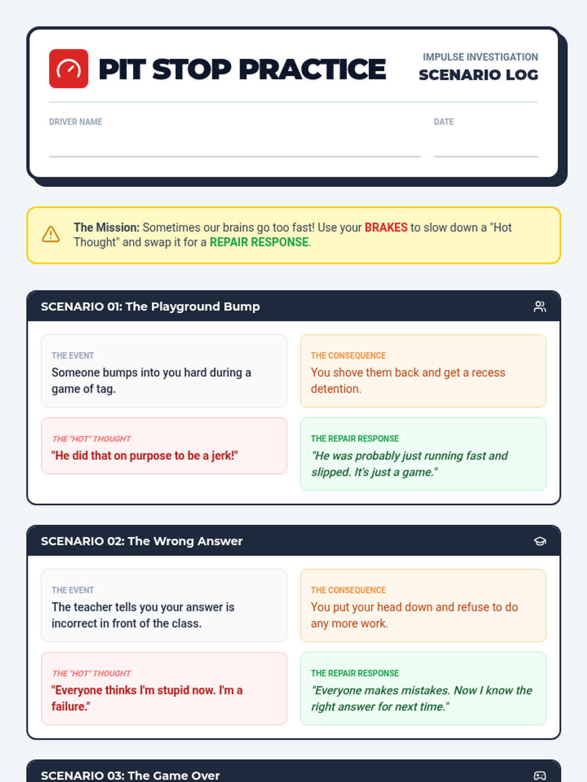 A lesson focused on impulse control and CBT techniques for 4th-grade boys, using a racing 'Pit Stop' theme to help them 'pause and repair' their thoughts before acting.