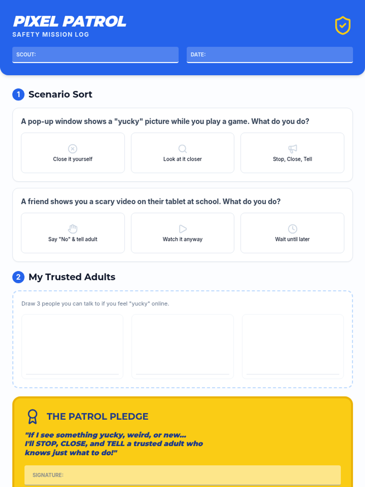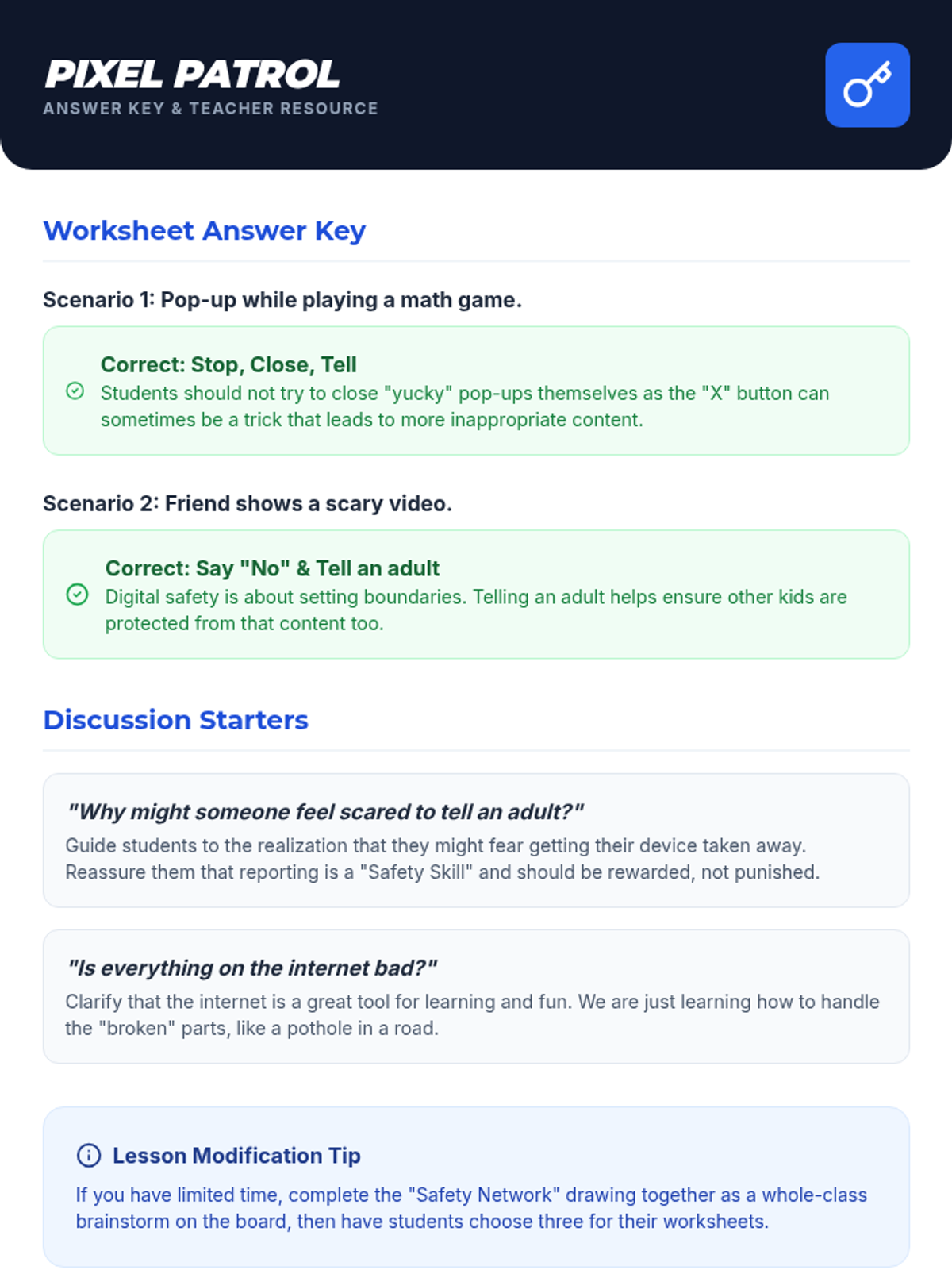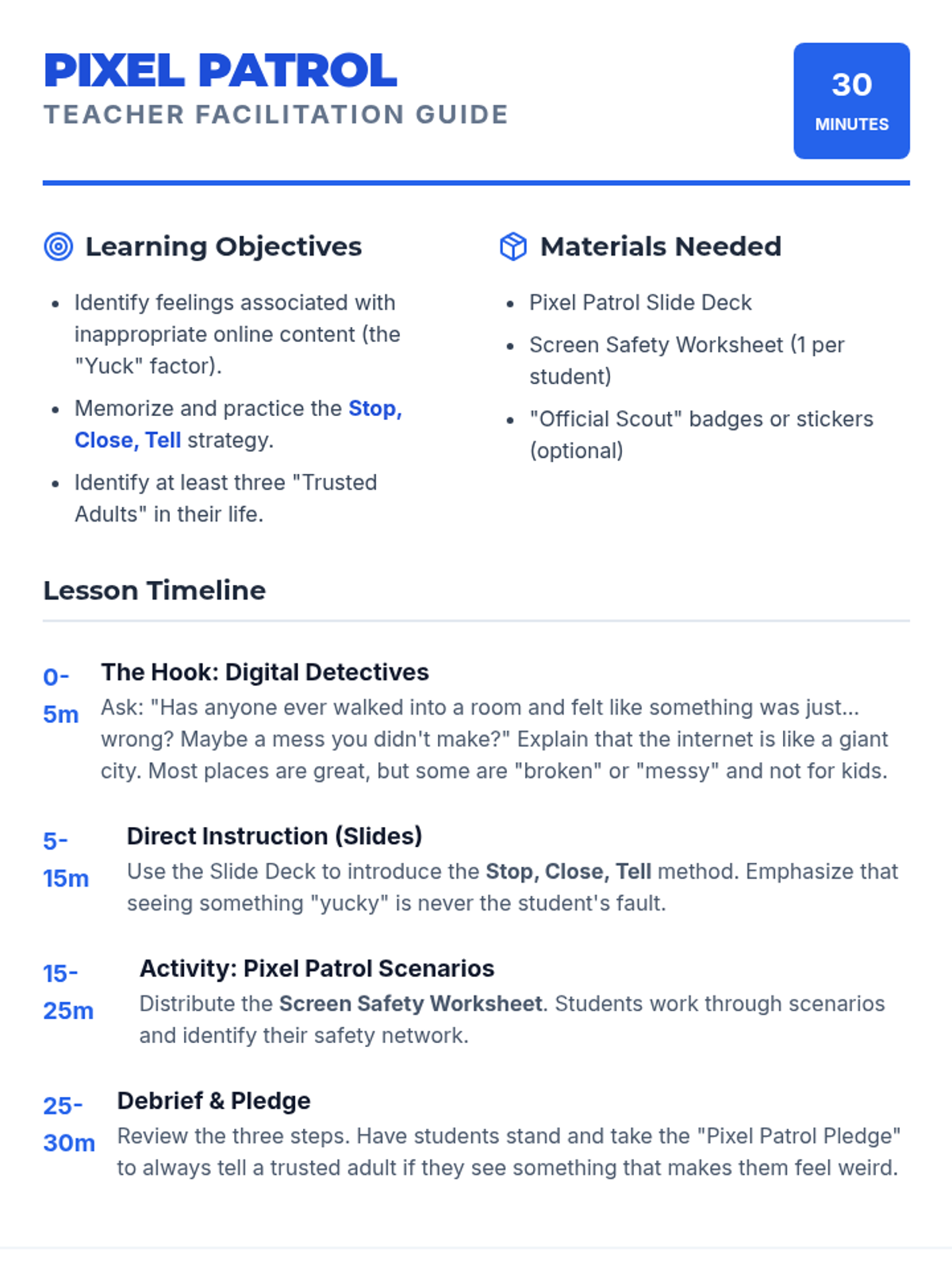 A 30-minute lesson for third graders on digital safety, focusing on recognizing and responding to inappropriate online content using the 'Stop, Close, Tell' method.