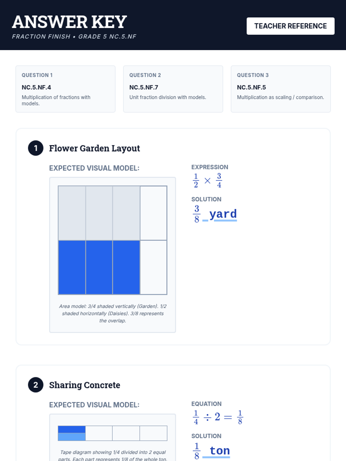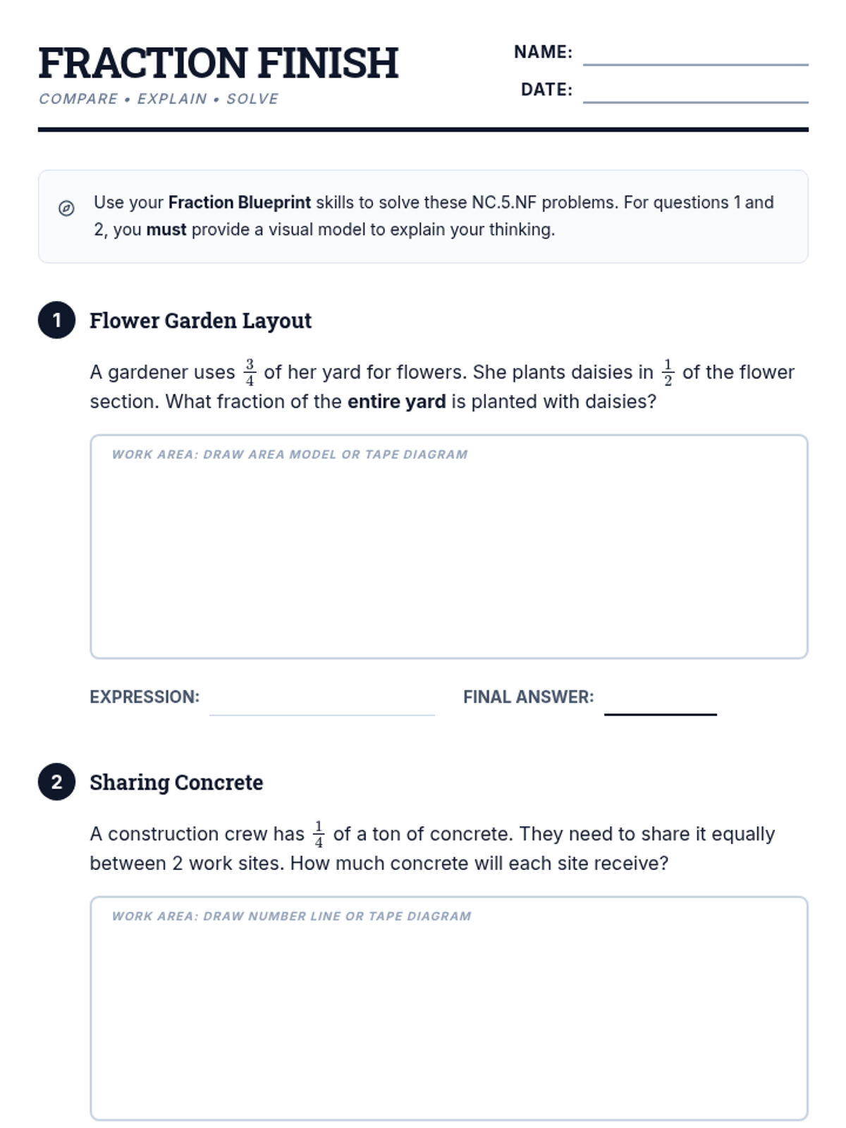 This lesson focuses on assessing student understanding of fraction multiplication and division using visual models, aligned with NC.5.NF standards for Grade 5. Students will solve real-world problems and justify their reasoning through diagrams.