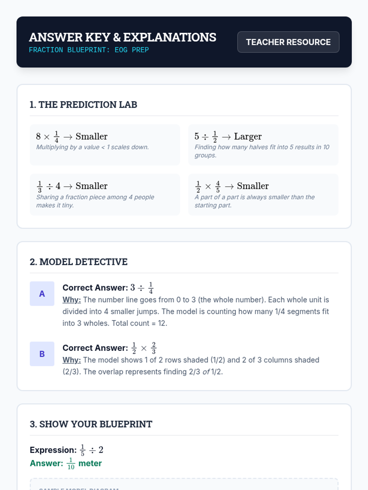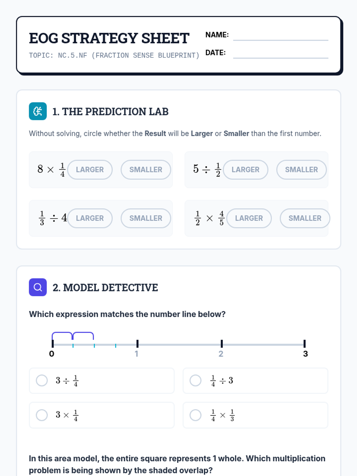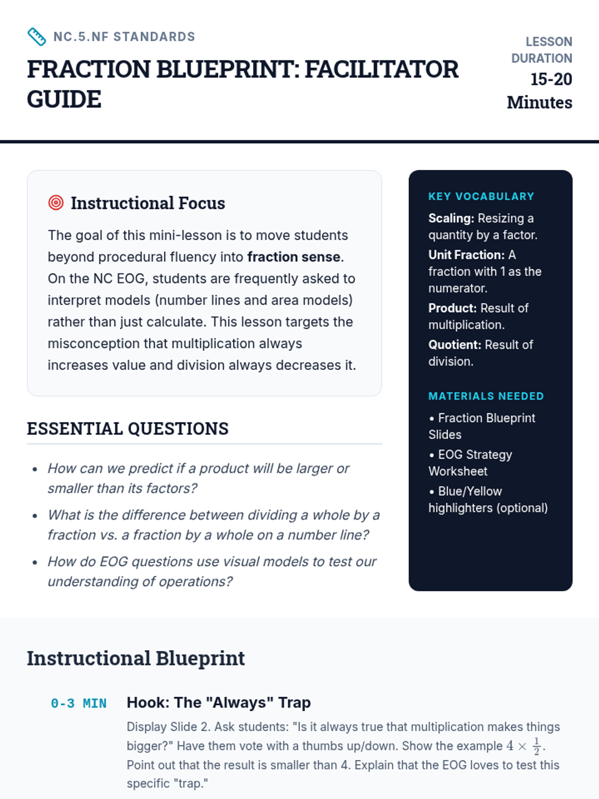 A targeted 15-20 minute mini-lesson for 5th grade students focusing on fraction operations (NC.5.NF). This lesson debunks common misconceptions about multiplication and division of fractions using number lines and area models, specifically tailored for NC EOG success.