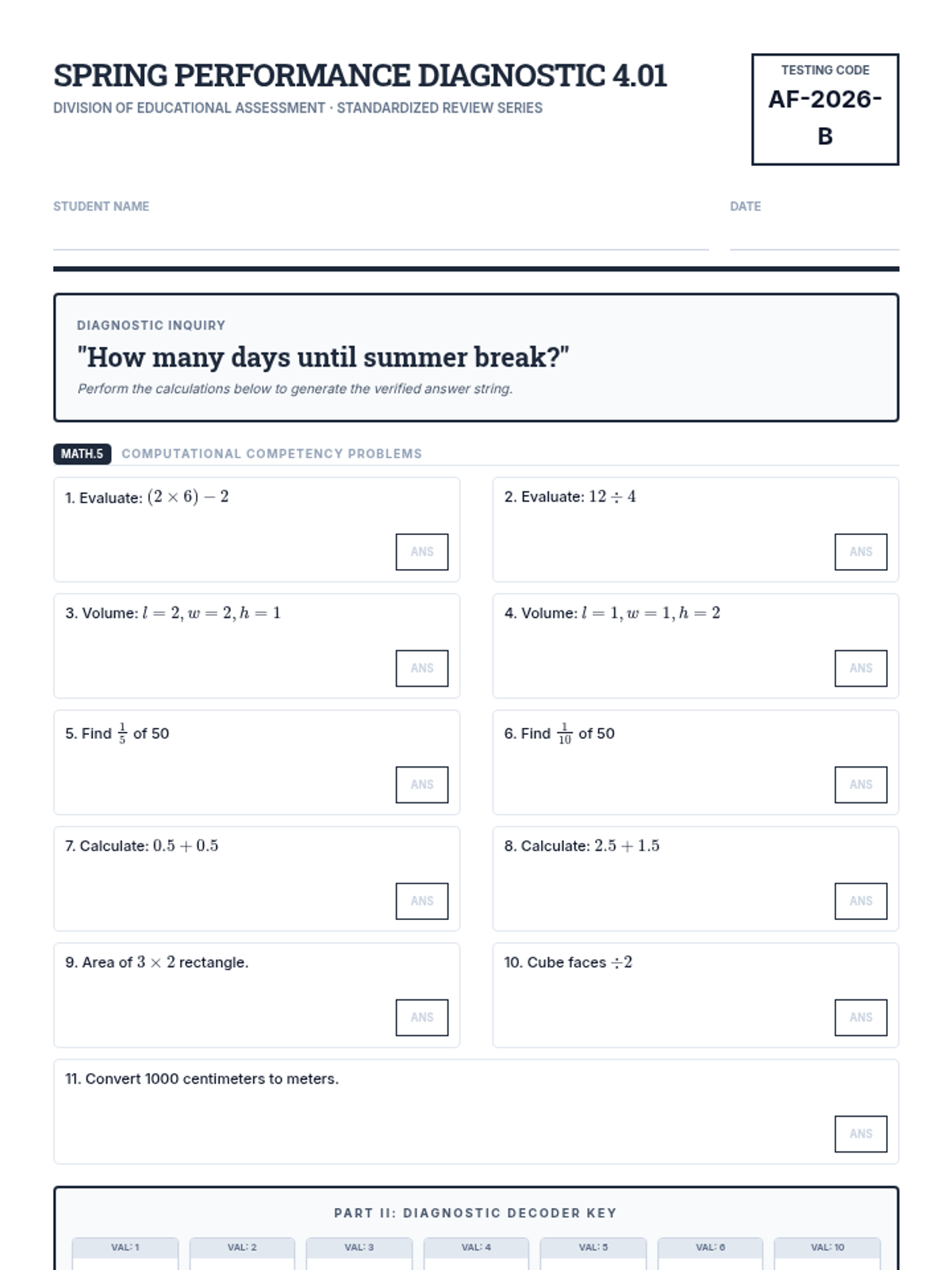 A collection of 5th-grade math review problems that reveal a hidden April Fools' message upon completion. Covers order of operations, volume, fractions, decimals, geometry, and measurement conversion.
