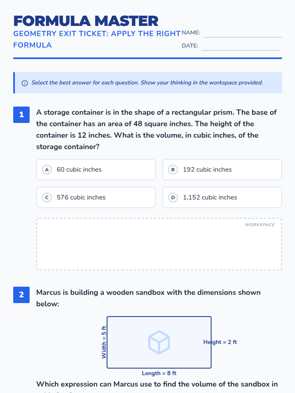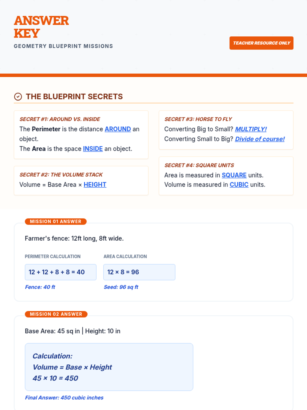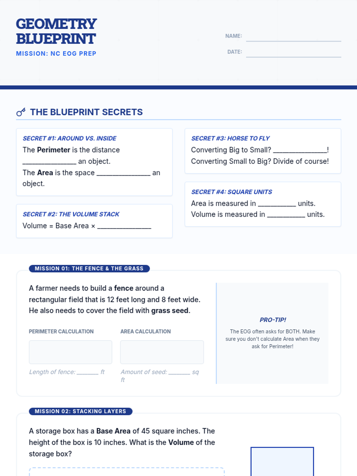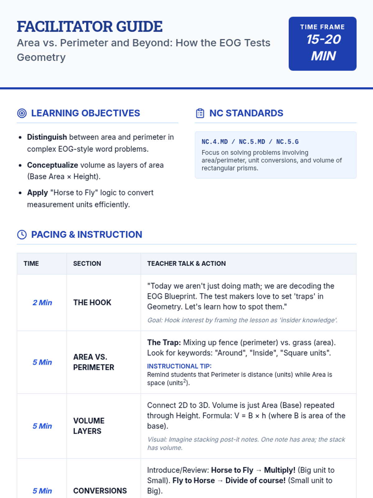 A high-impact mini-lesson focusing on common NC EOG traps in geometry and measurement, covering area vs. perimeter, volume concepts, and unit conversions.