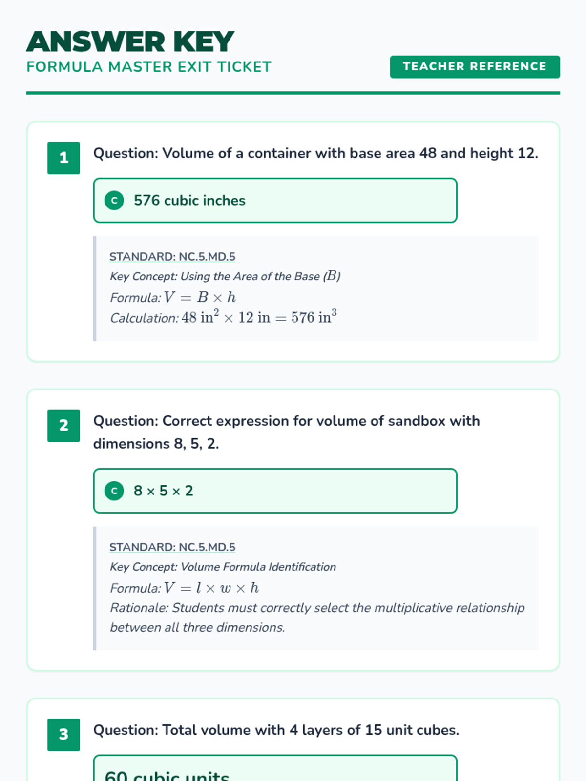 A Grade 5 geometry assessment focused on volume calculations and formula application, specifically aligned with NC standards for EOG preparation.