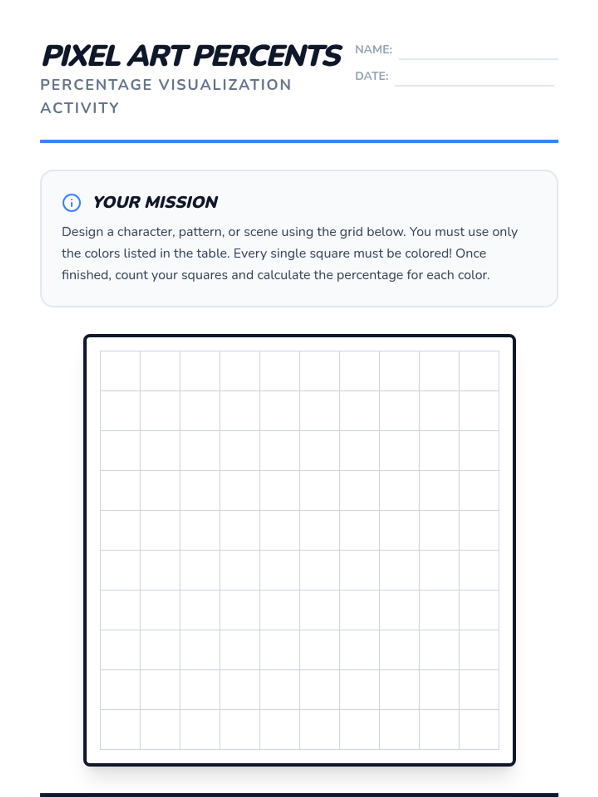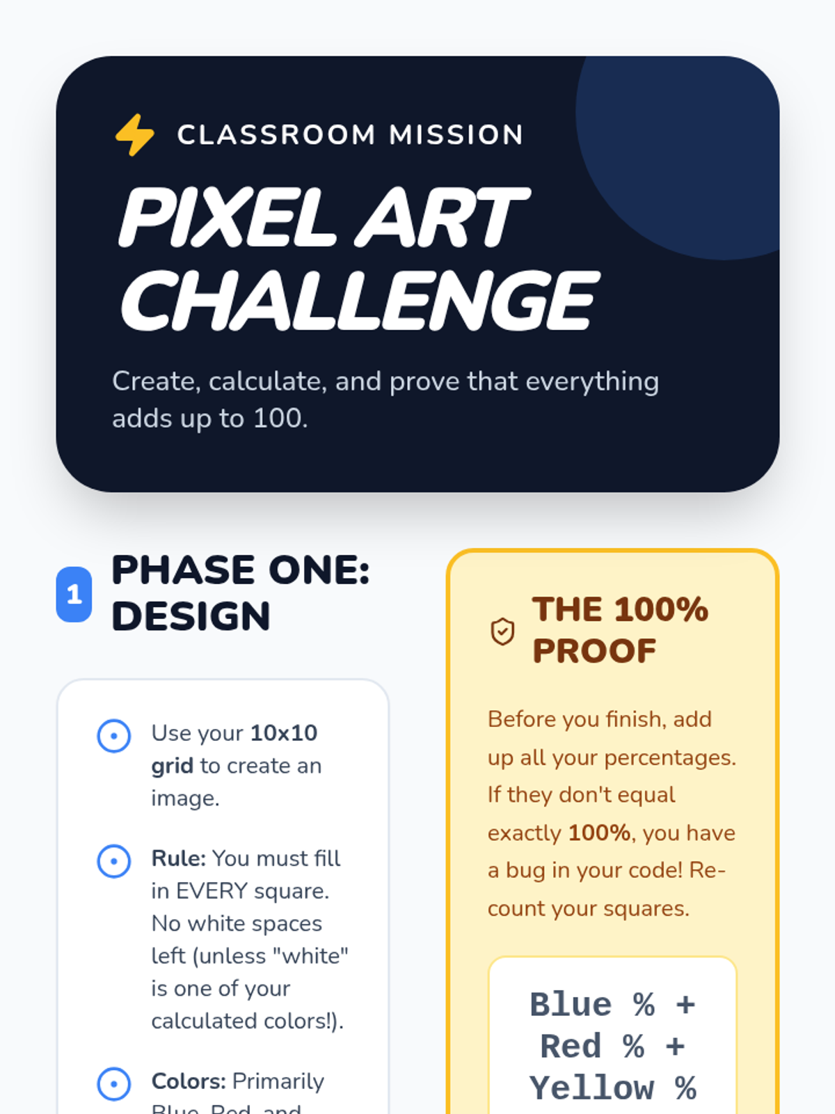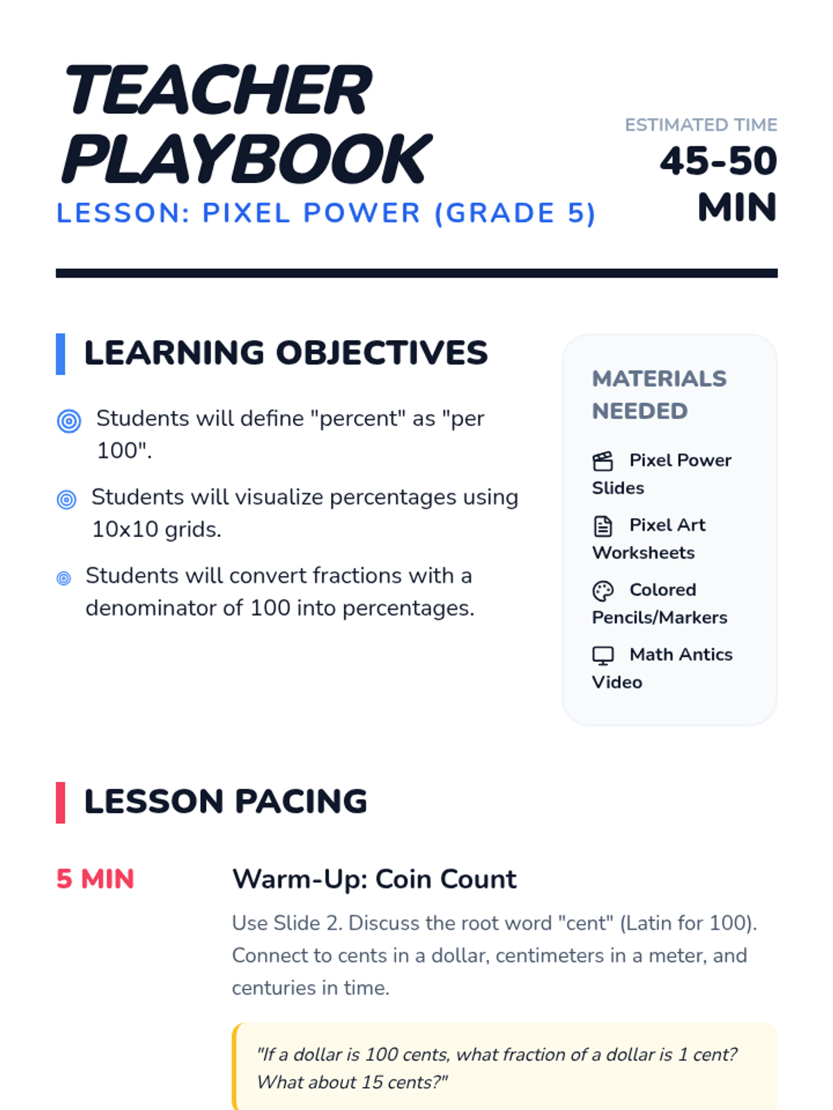 Students explore the foundational concept of percentages as 'per 100' using money connections, a guided video, and a creative 10x10 grid pixel art project.