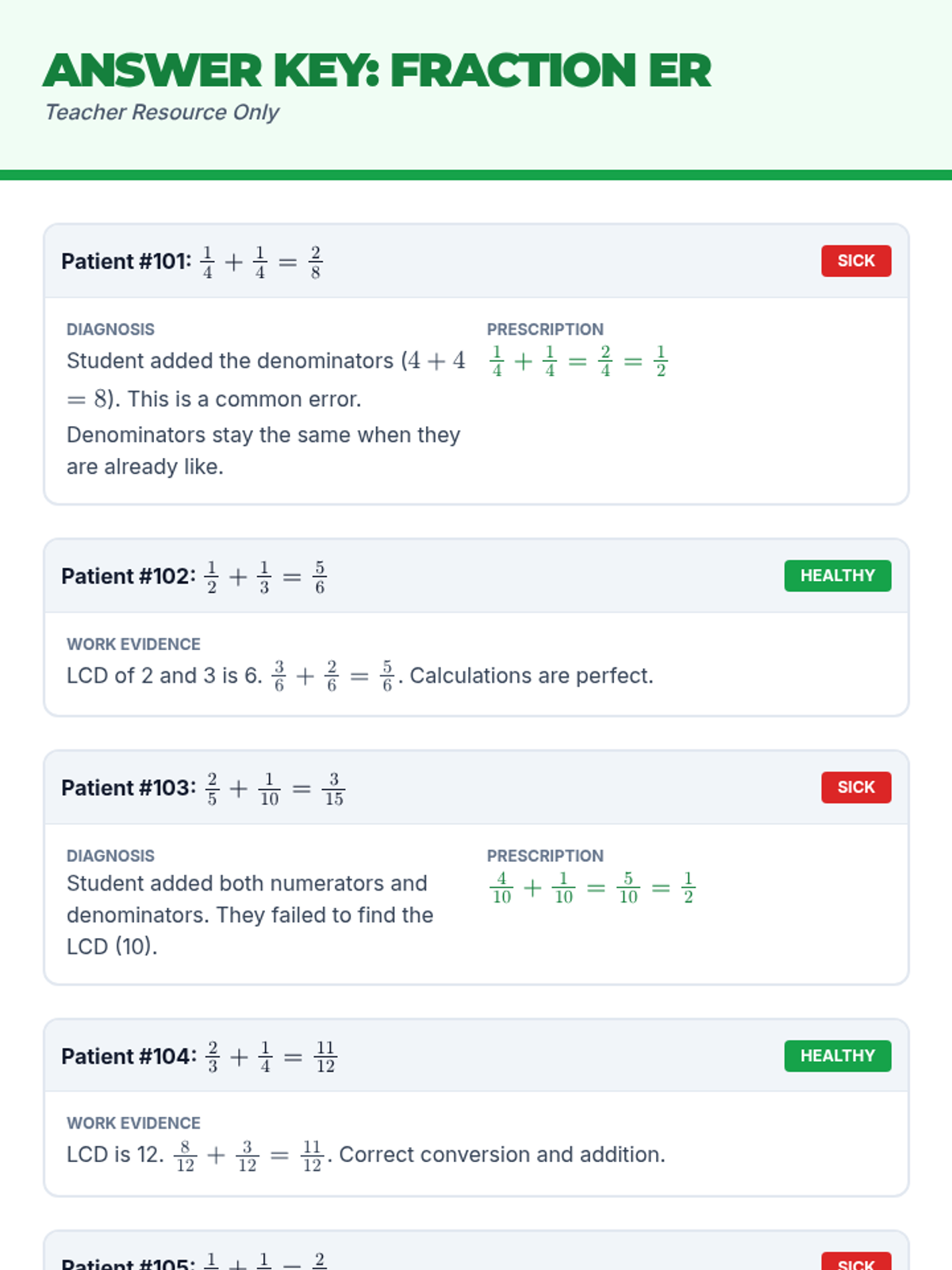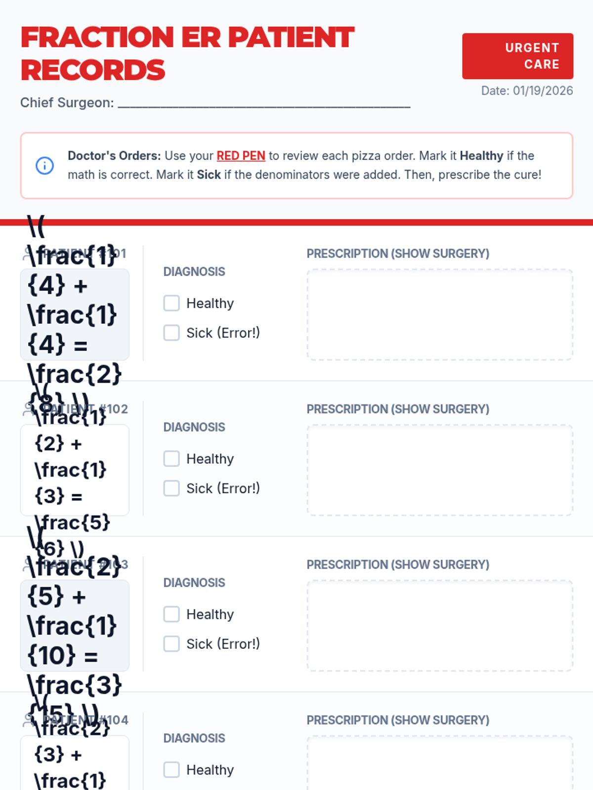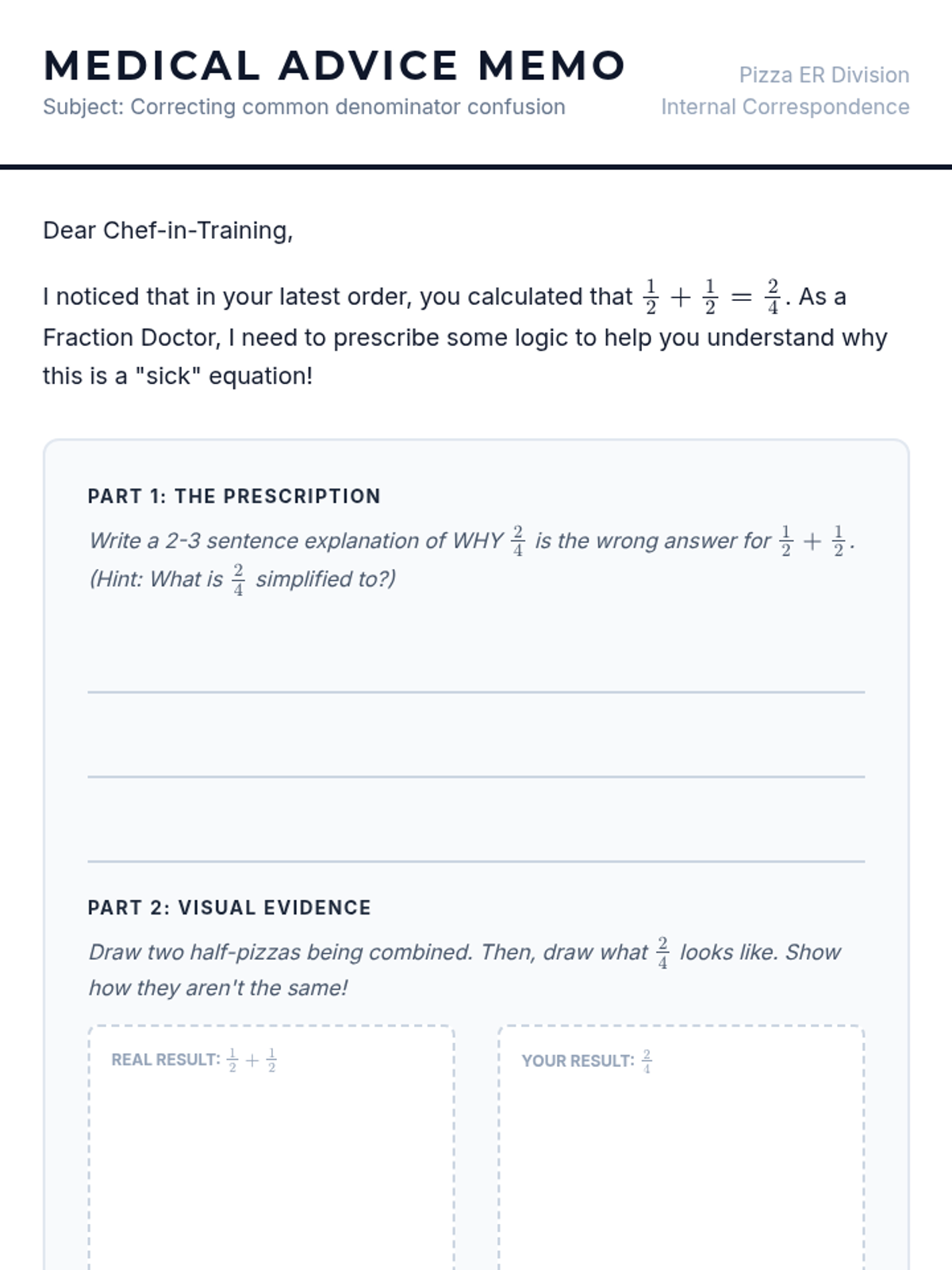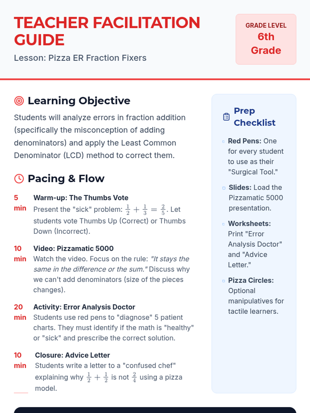 A 6th-grade math lesson focused on identifying and correcting the common misconception of adding denominators when adding fractions. Students take on the role of 'Fraction Doctors' to diagnose 'sick' pizza orders using the LCM/LCD method.